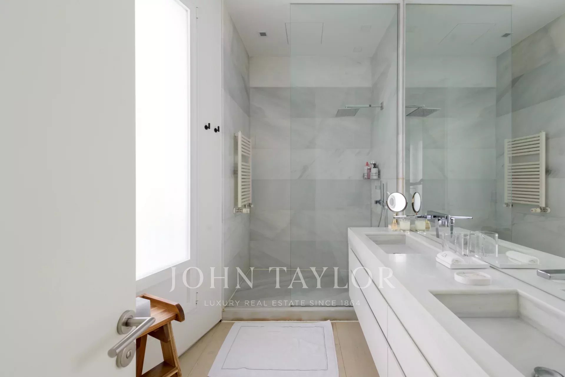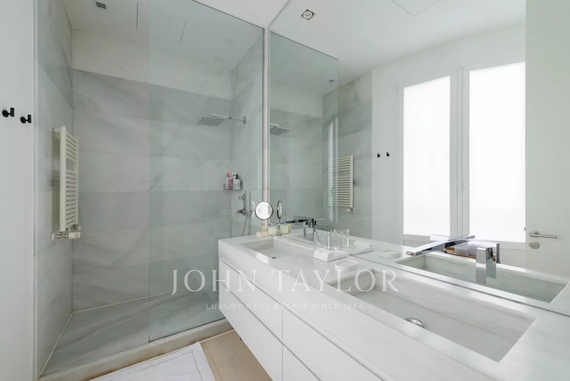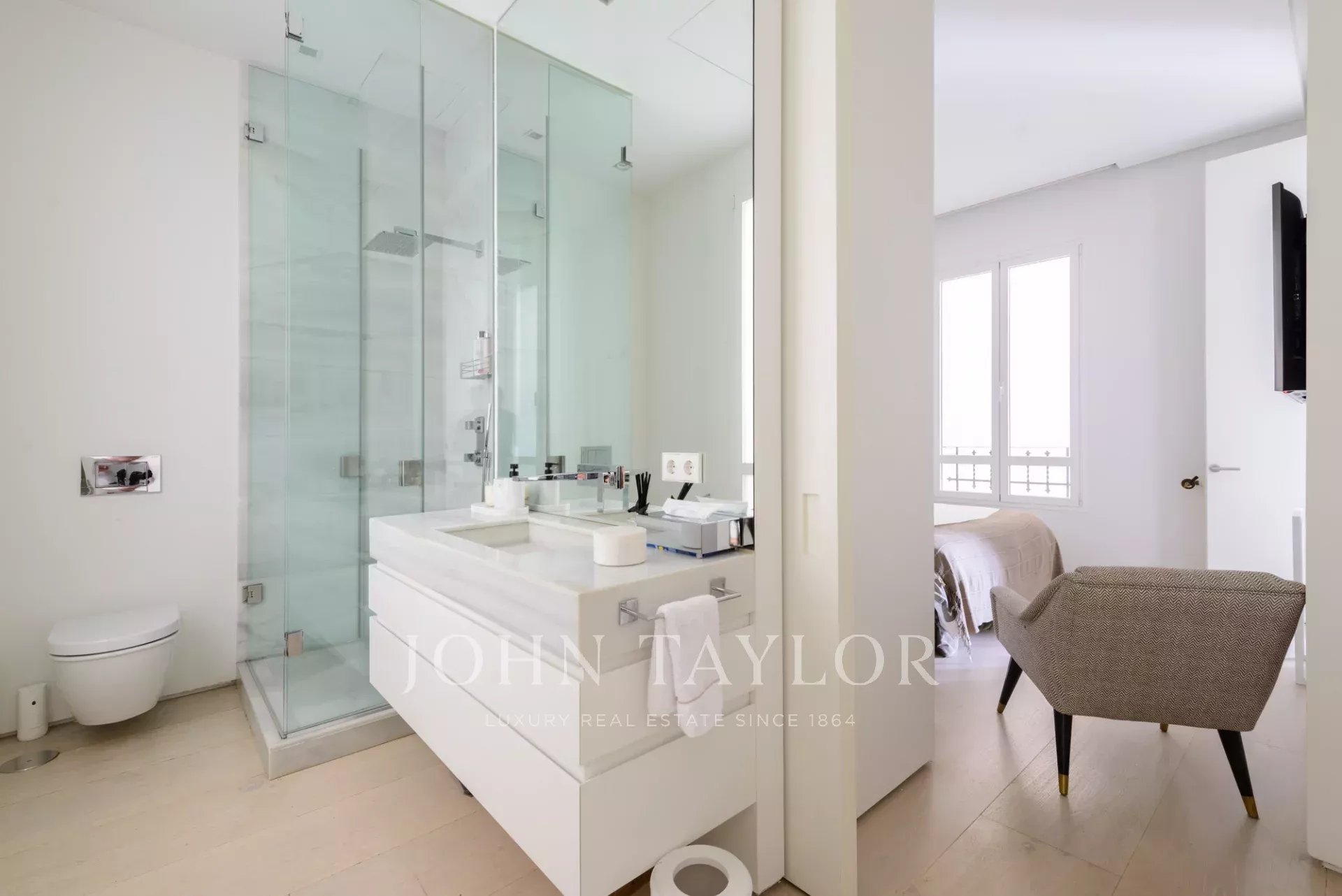 La chambre principale est une suite complète, avec un grand dressing et de grandes fenêtres. La salle de bains attenante est un espace qui a de la personnalité, avec un double lavabo en marbre et une immense douche à jets puissants.