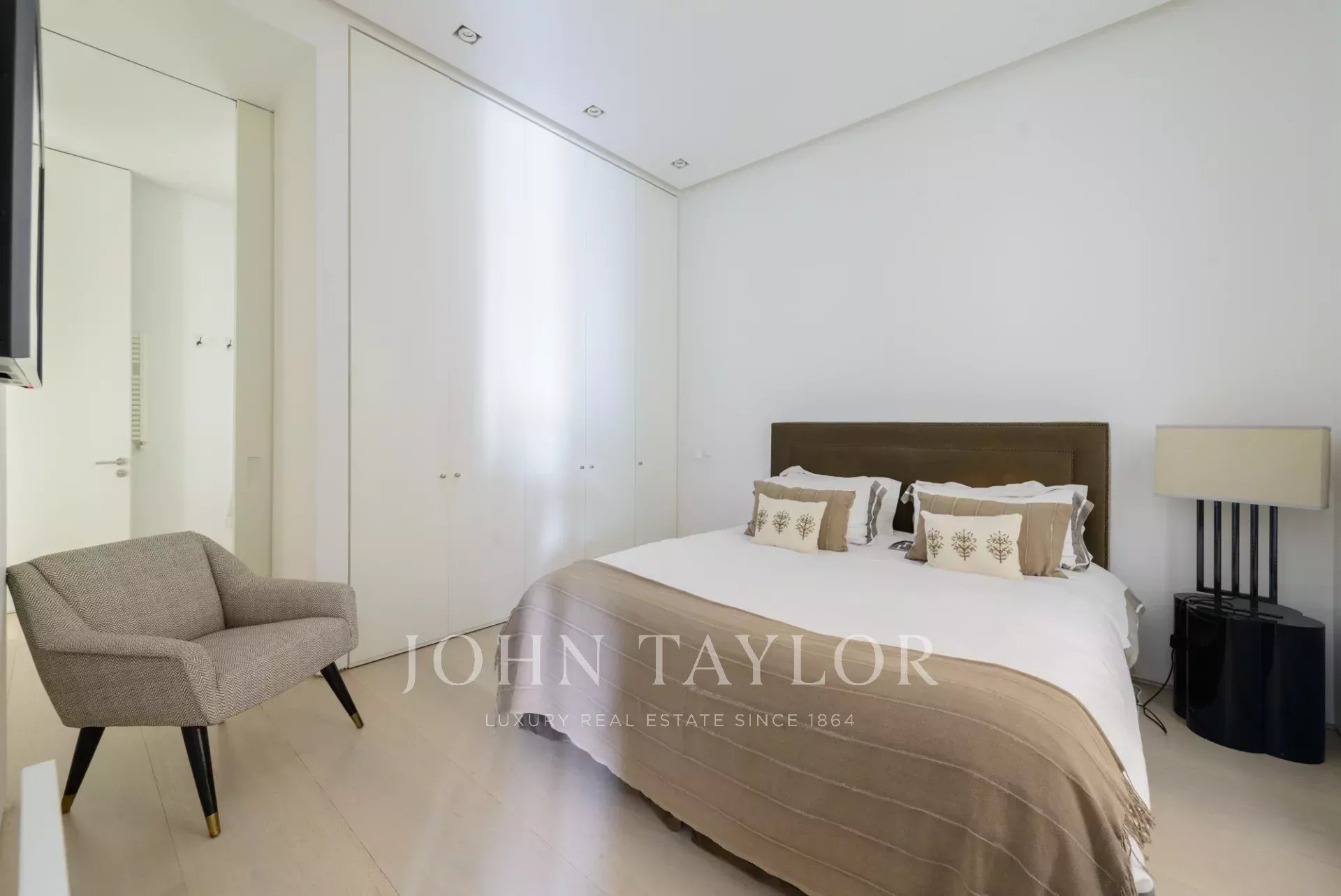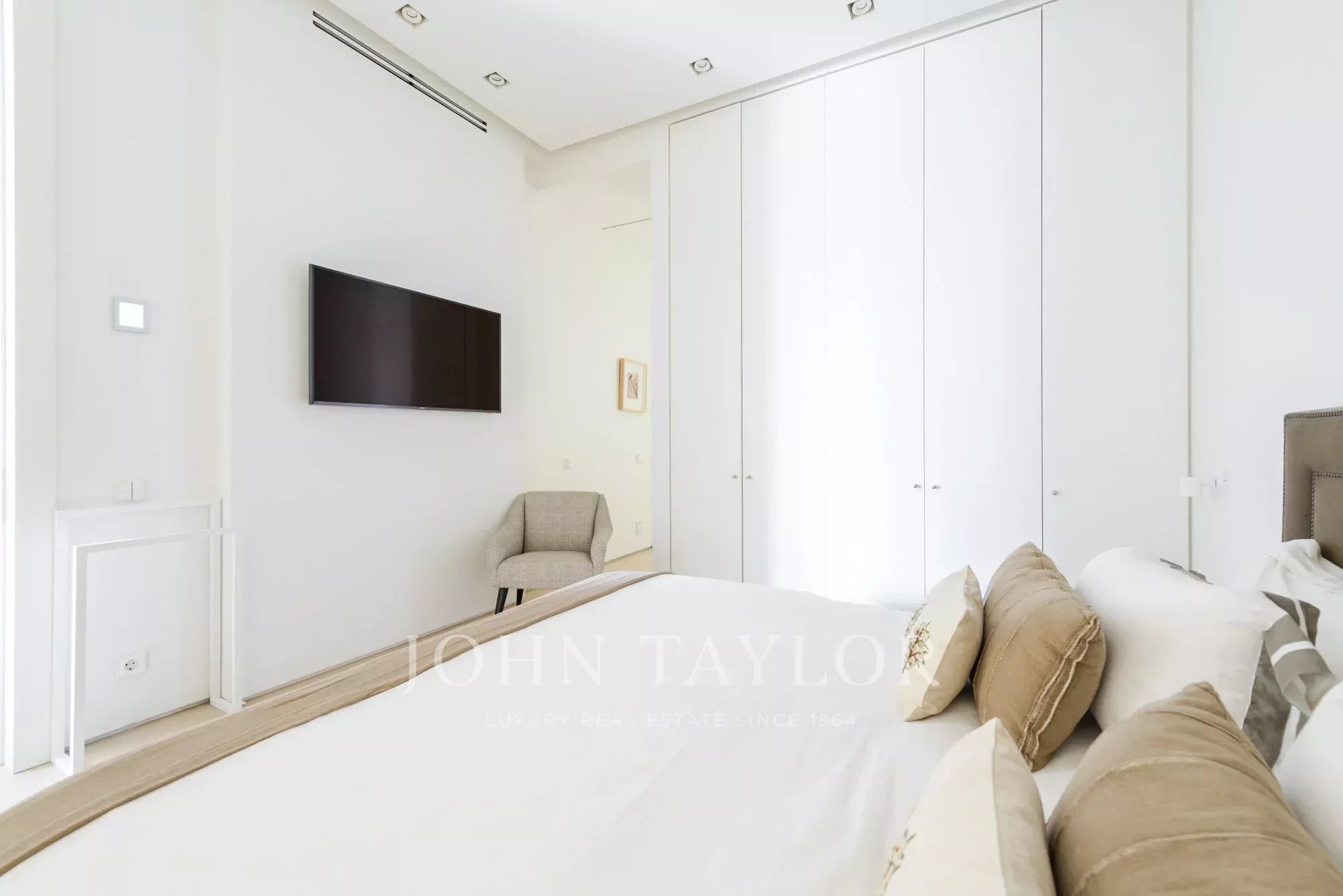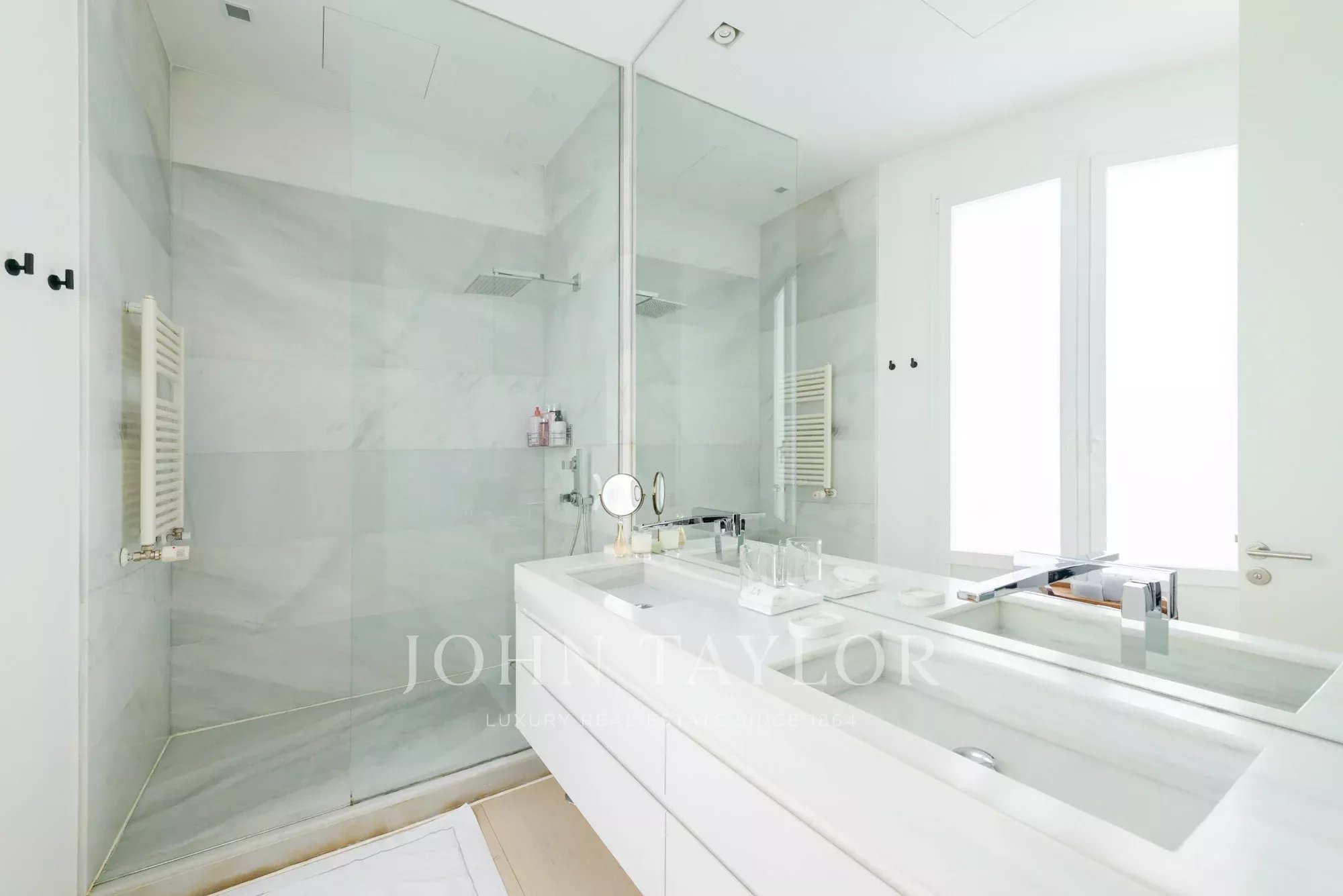 La chambre principale est une suite complète, avec un grand dressing et de grandes fenêtres. La salle de bains attenante est un espace qui a de la personnalité, avec un double lavabo en marbre et une immense douche à jets puissants.