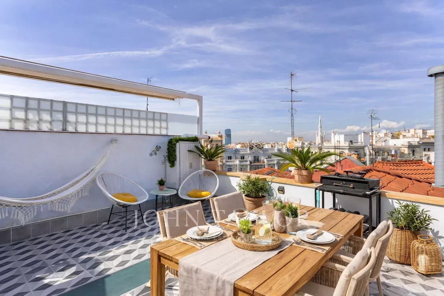 Ce duplex se distingue par sa spectaculaire terrasse, qui s'élève de manière imposante au-dessus des immeubles voisins, offrant des vues sur la ligne d'horizon de Madrid en toute intimité et sans bruit, grâce à son emplacement stratégique.