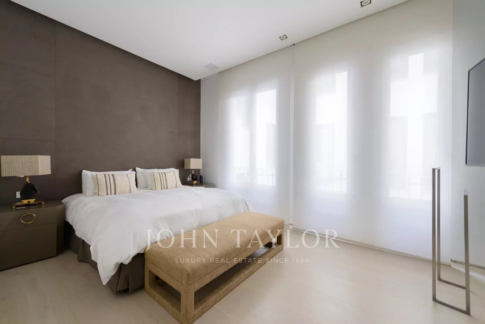 La chambre principale est une suite complète, avec un grand dressing et de grandes fenêtres. La salle de bains attenante est un espace qui a de la personnalité, avec un double lavabo en marbre et une immense douche à jets puissants.