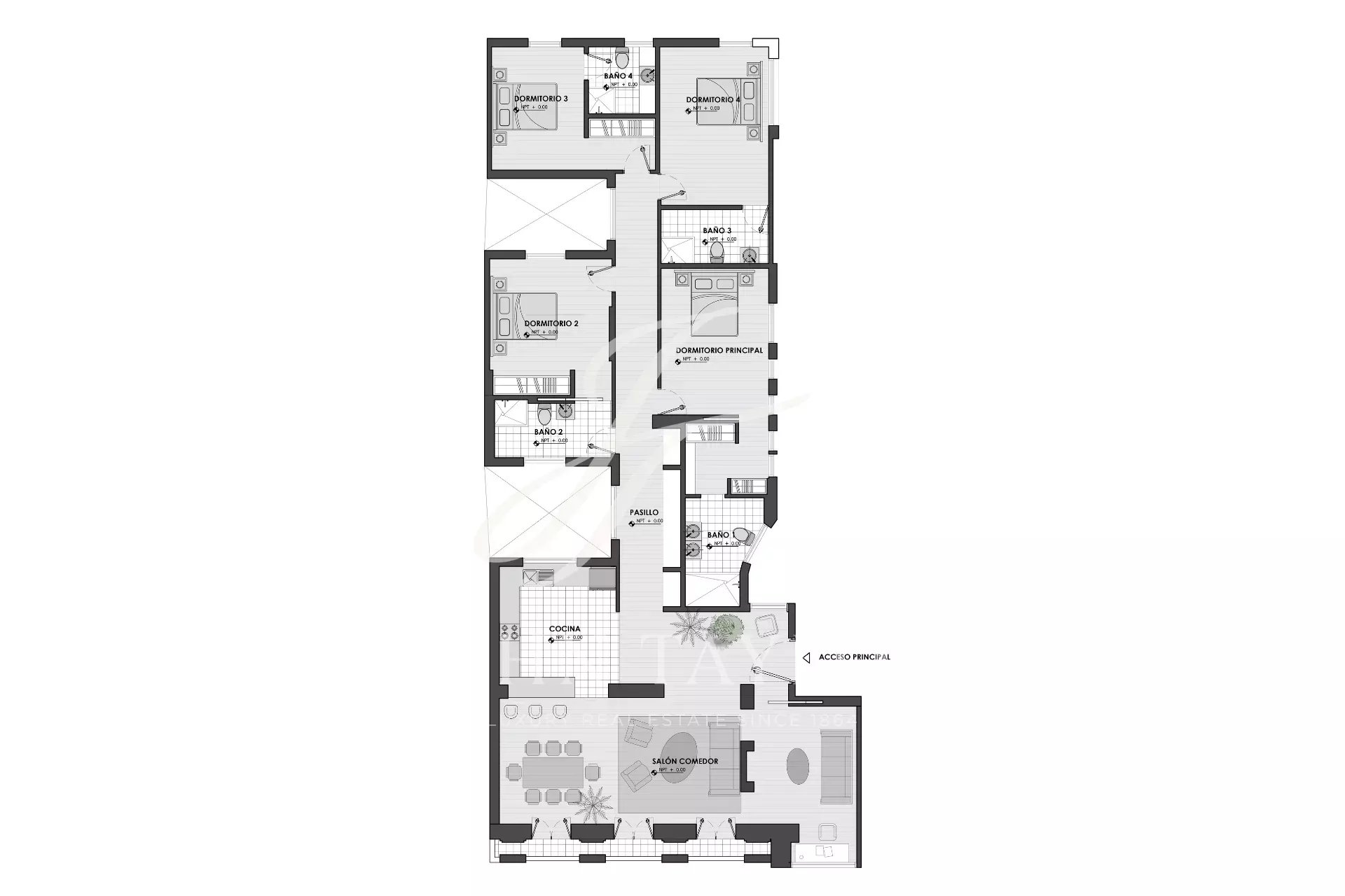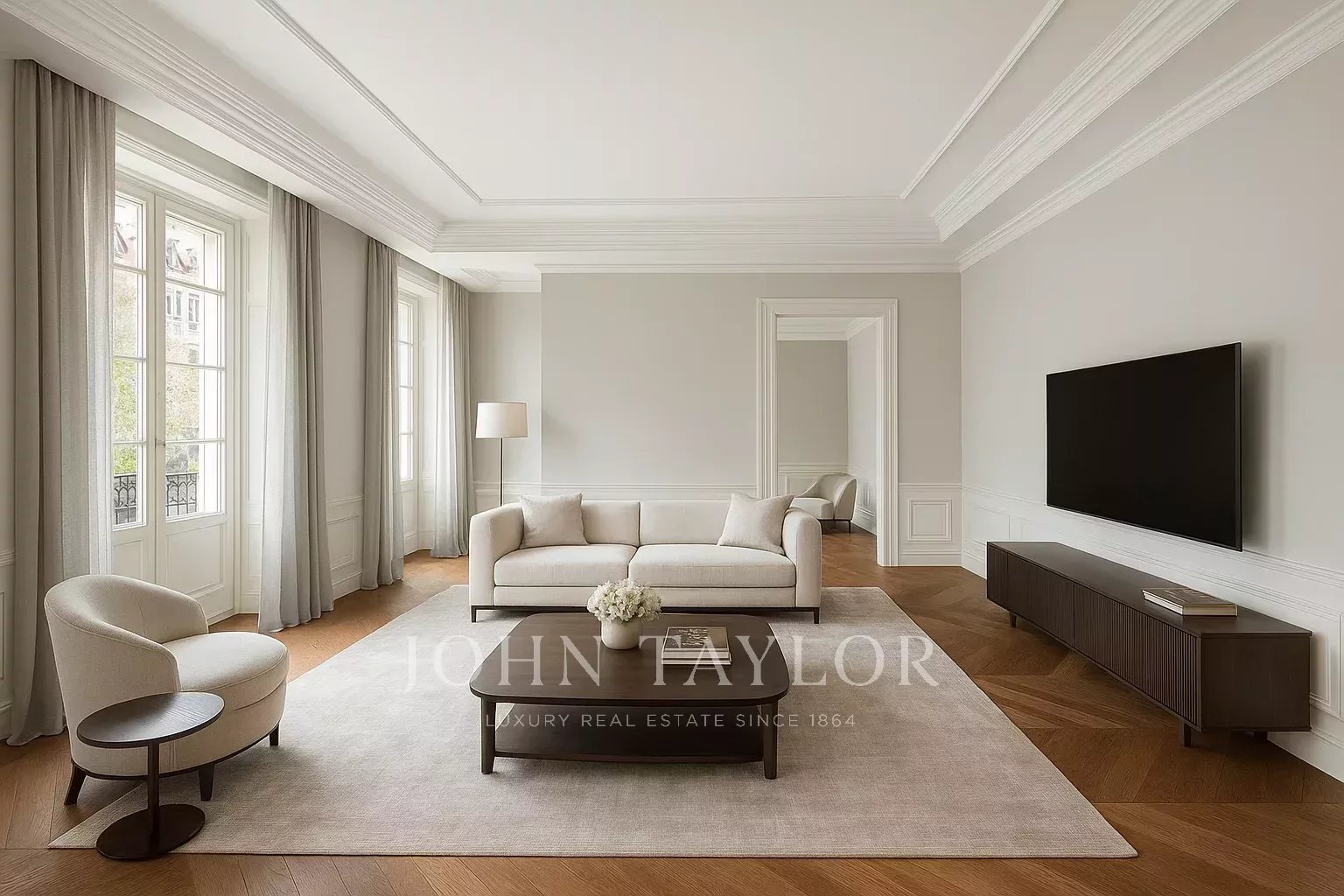 Le salon principal est un espace lumineux et ouvert, orienté vers le sud et donnant accès à quatre impressionnants balcons surdimensionnés. Le salon est relié à la salle à manger et au couloir.