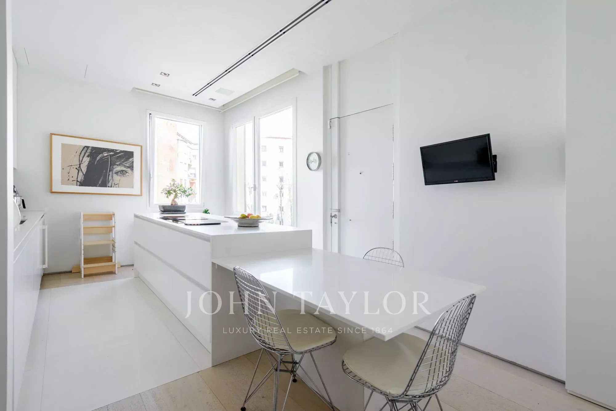 Cette propriété unique est située à côté du parc Retiro, dans un bâtiment spectaculaire à la façade classique. Nous soulignons particulièrement ses quatre balcons et la hauteur imposante de ses plafonds qui donnent de l'espace et du caractère à chaque pièce. La rénovation a été réalisée par une équipe renommée de designers espagnols, et chaque détail a été conçu sur mesure pour cet appartement, y compris les élégantes portes allant du sol au plafond, qui renforcent l'impression de sophistication.