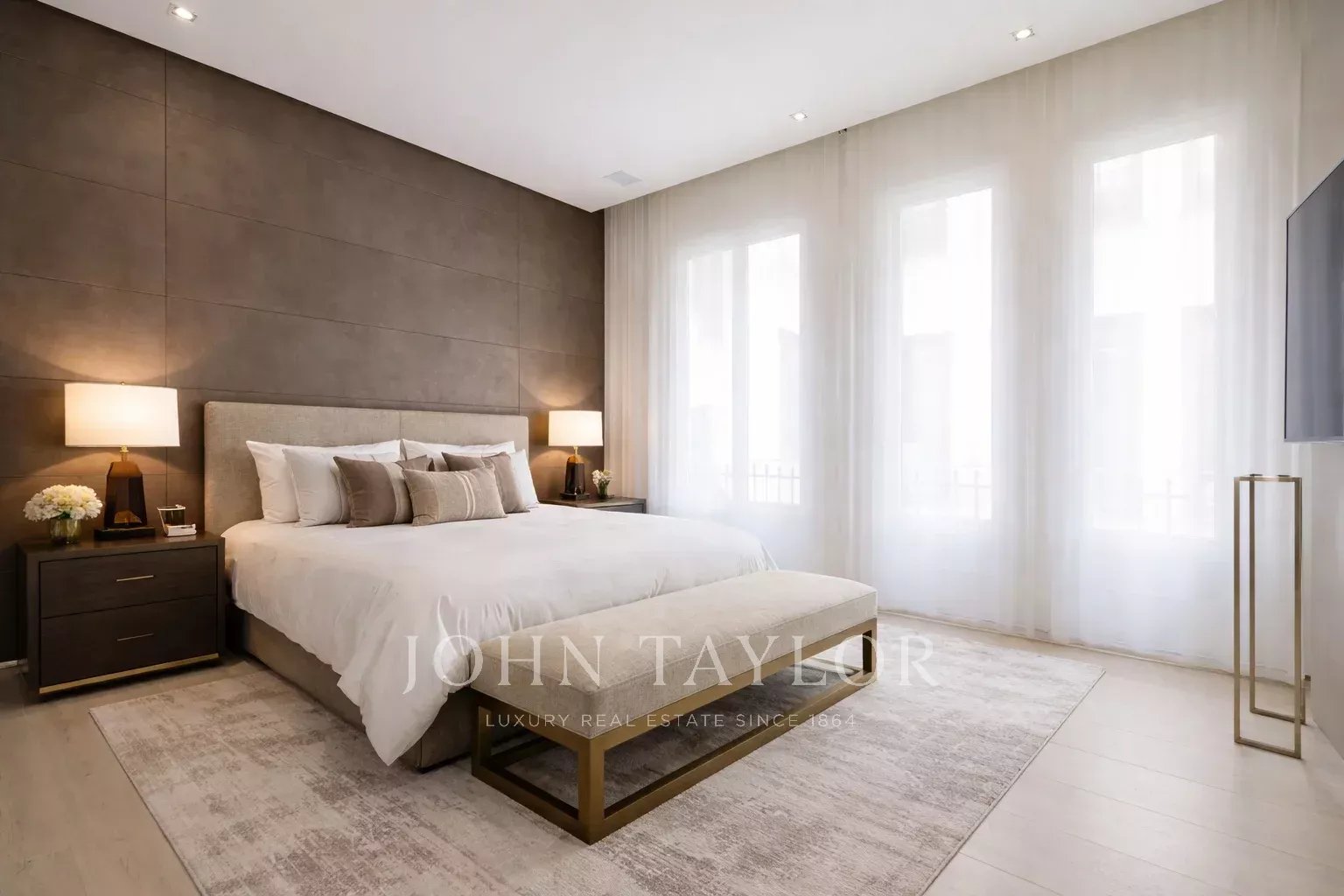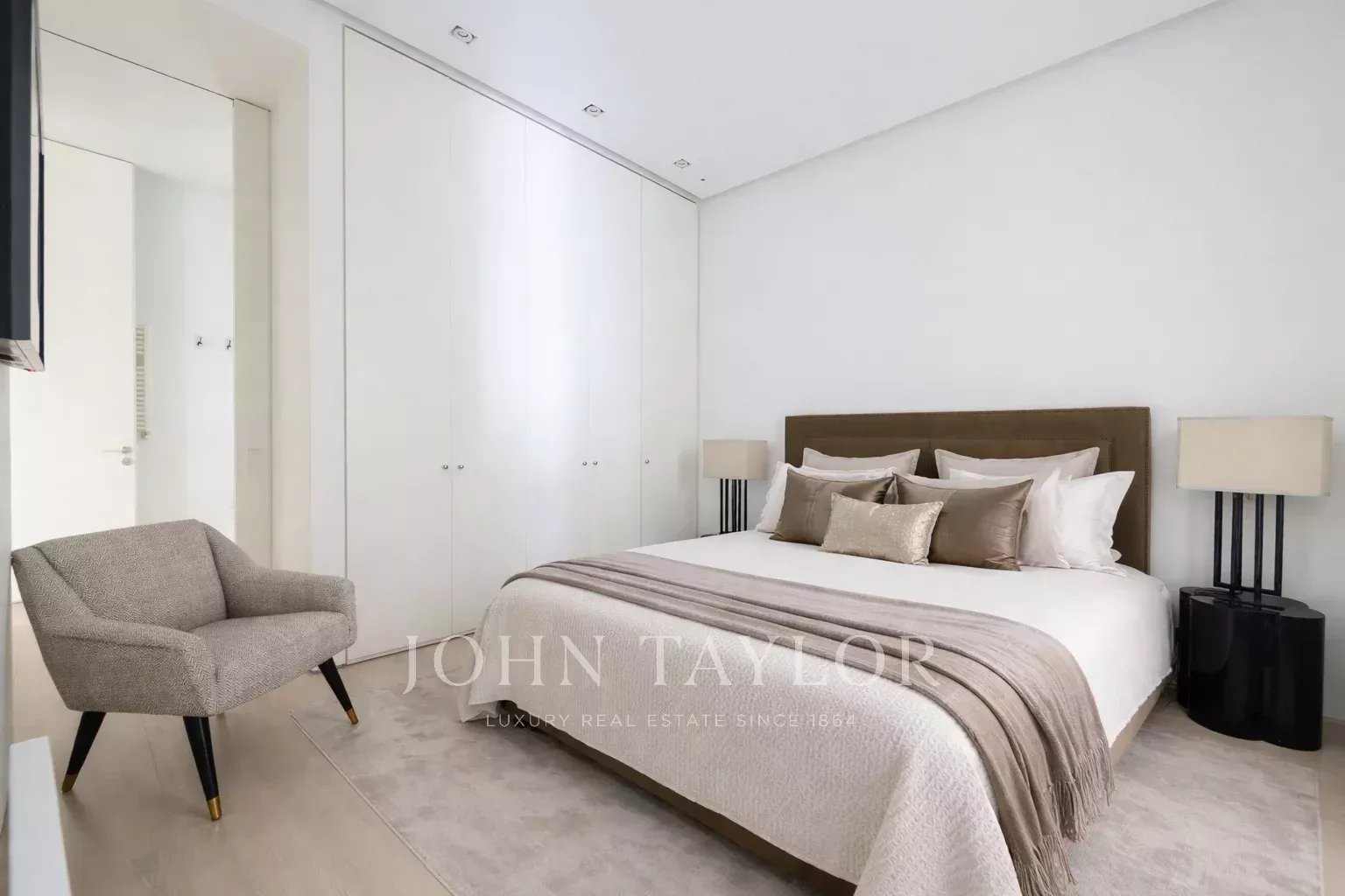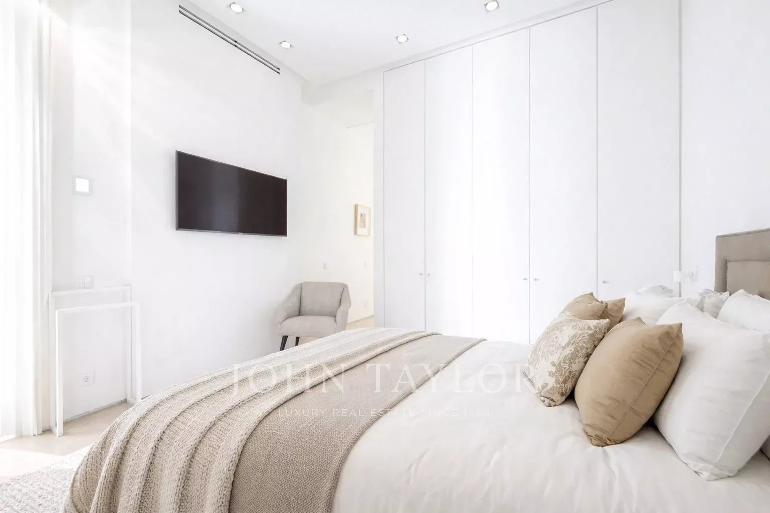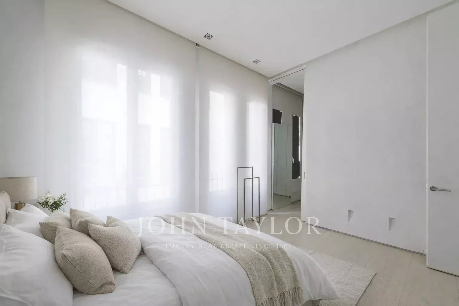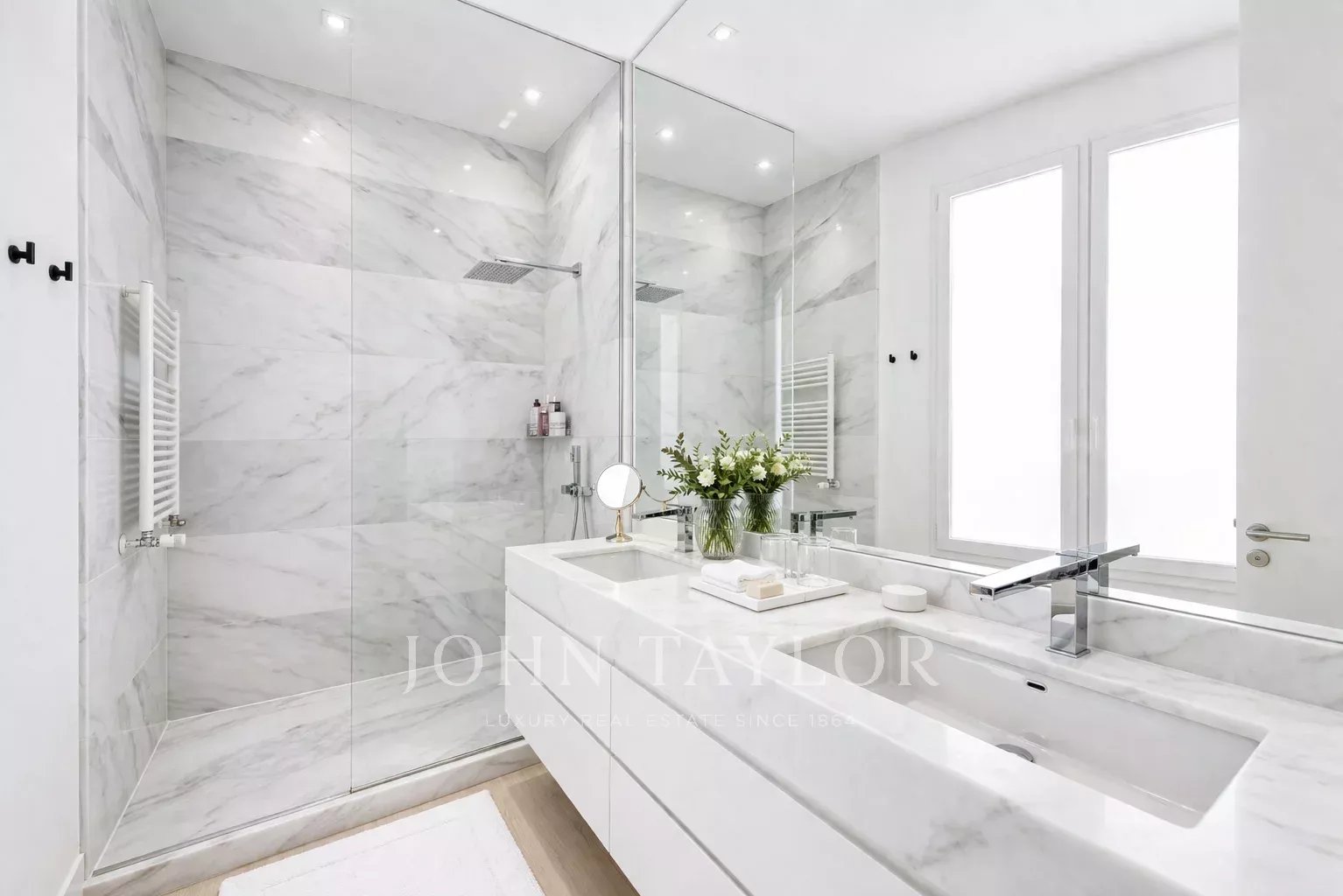 La chambre principale est une suite complète, avec un grand dressing et de grandes fenêtres. La salle de bains attenante est un espace qui a de la personnalité, avec un double lavabo en marbre et une immense douche à jets puissants.