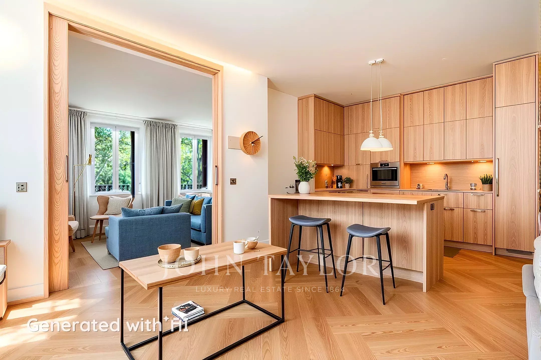 La zone sociale s'articule autour d'une cuisine ouverte, élégamment intégrée à l'ensemble, où les matériaux et les finitions prennent une place discrète et raffinée. L'aménagement intérieur associe des lignes contemporaines à une sélection soignée de détails, créant ainsi une atmosphère accueillante, sobre et sophistiquée.