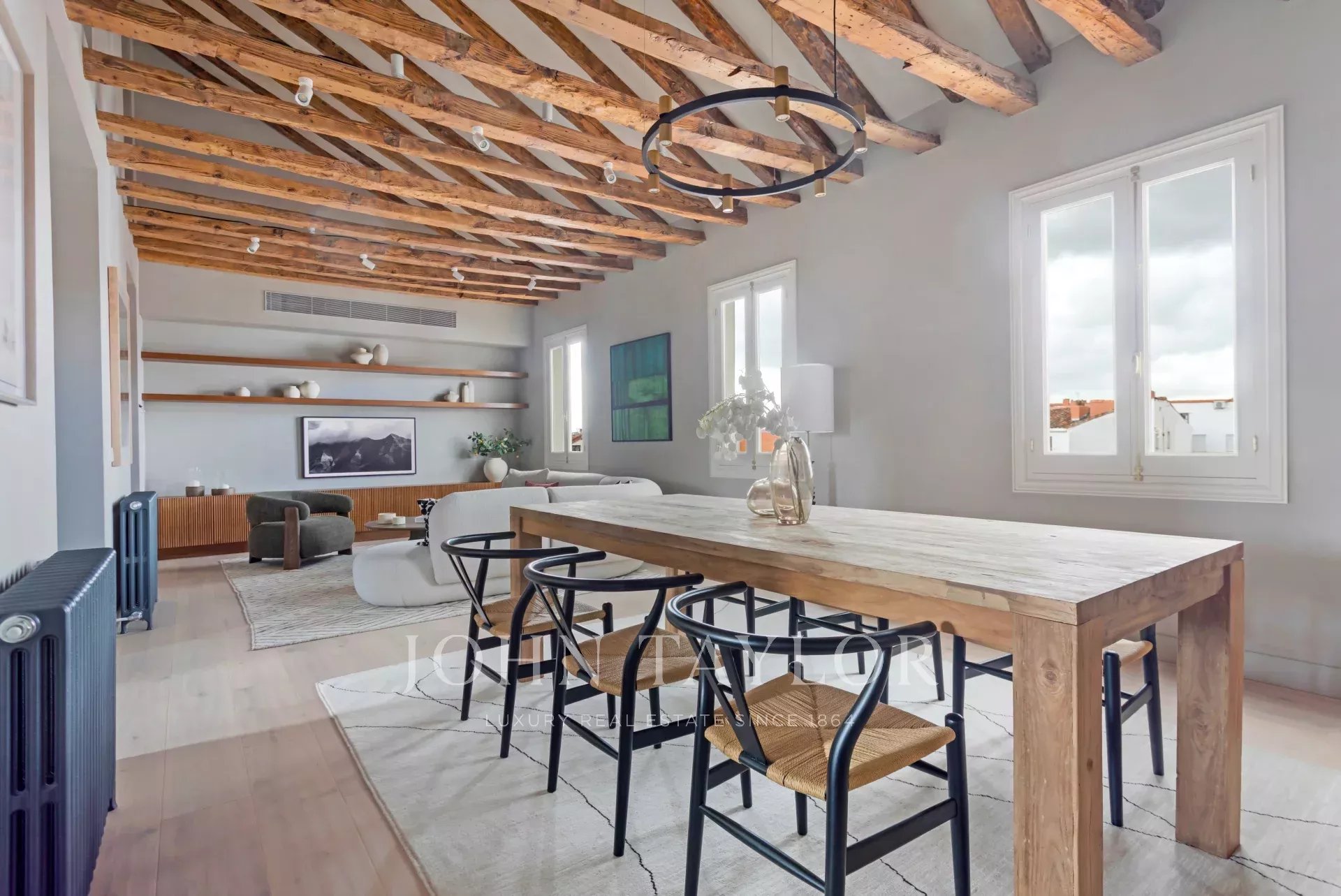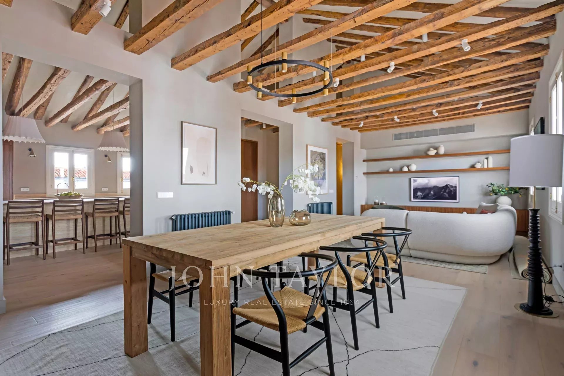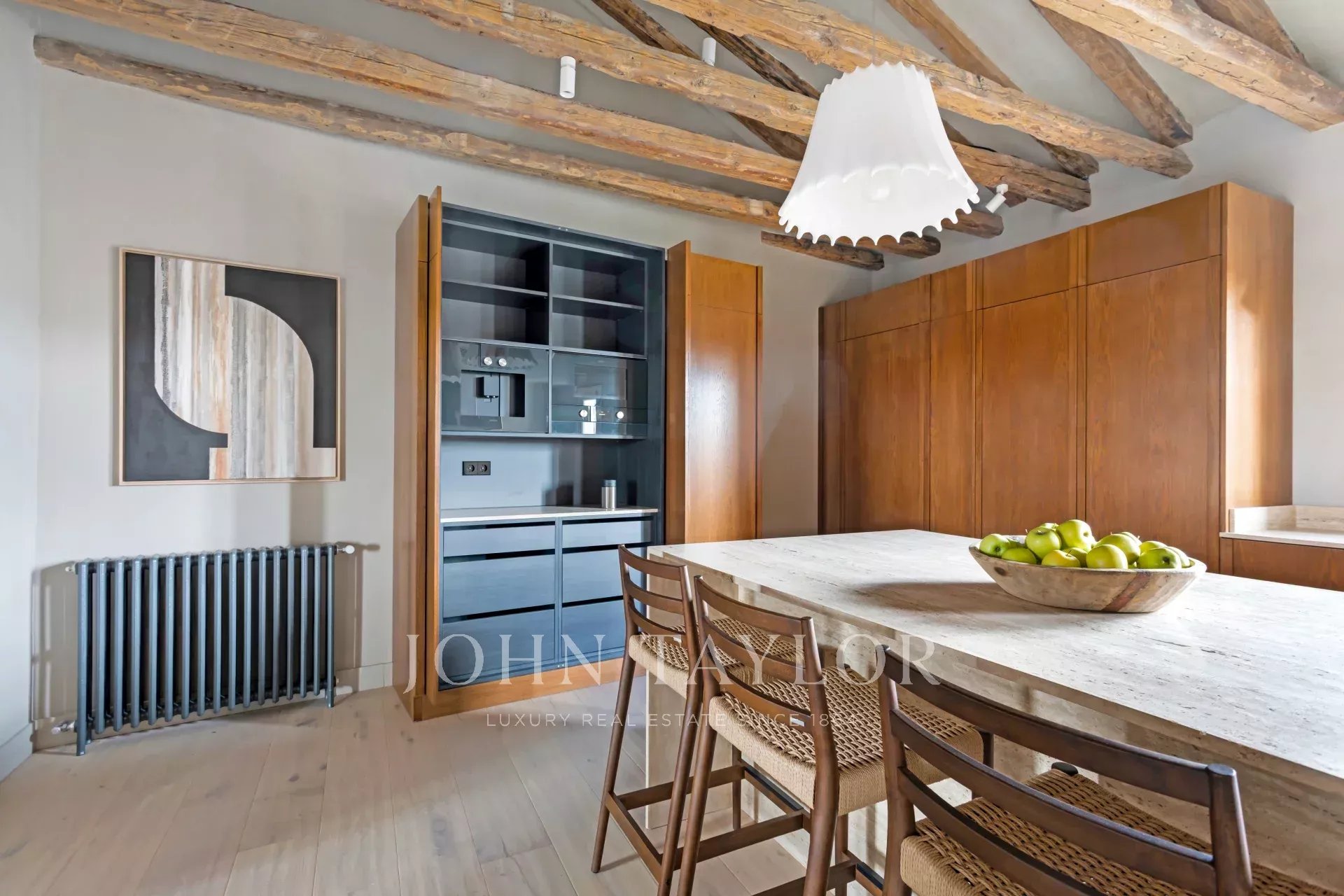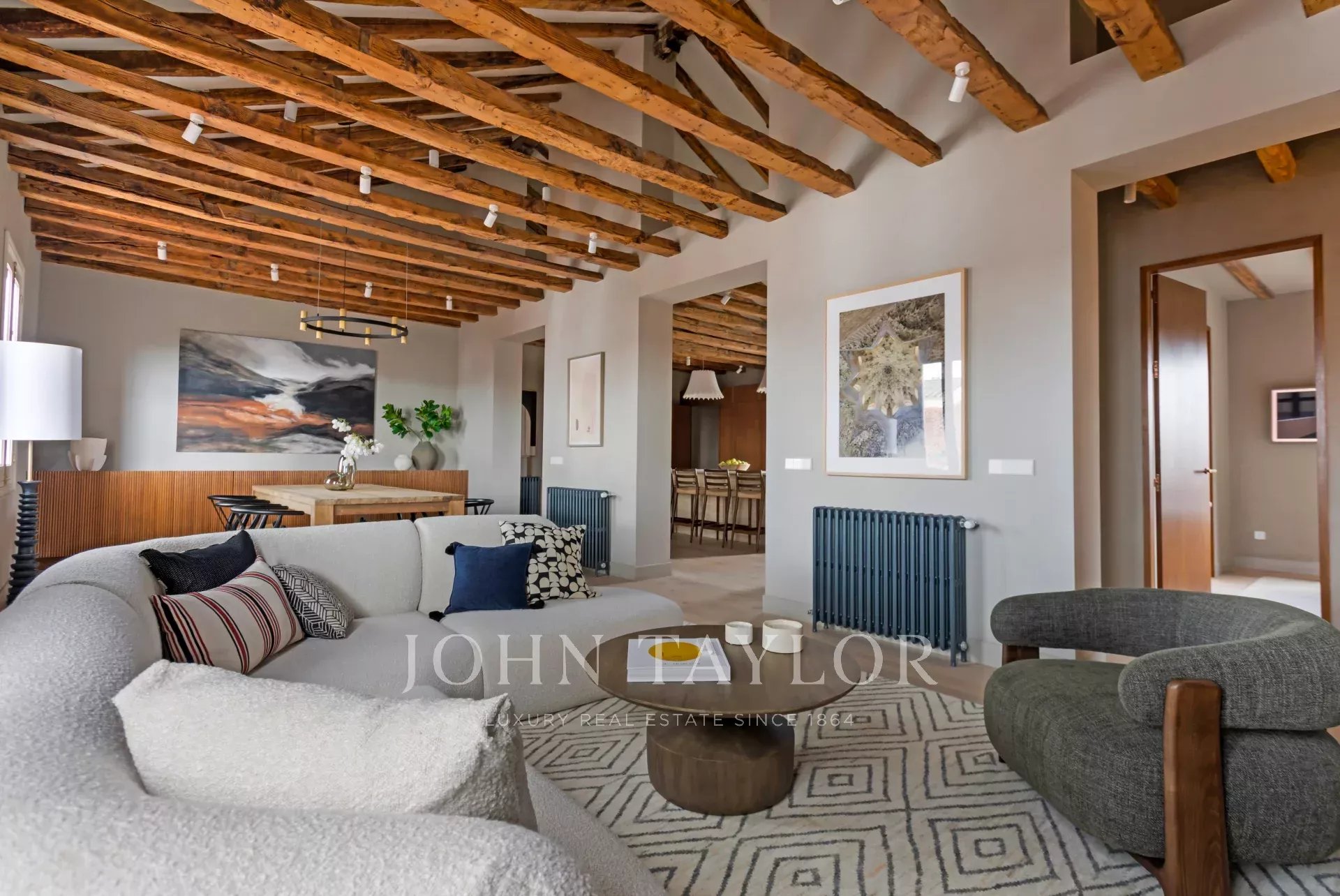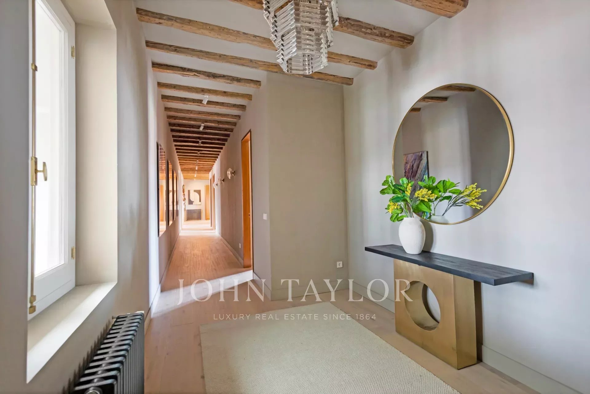 Elle se compose de trois chambres à coucher avec dressing et salle de bains complète, ainsi que d'une buanderie et d'un WC pour les invités. Cette propriété exclusive est entièrement rénovée et meublée avec une décoration intérieure exquise qui combine harmonieusement l'élégance contemporaine du style loft avec une sophistication intemporelle : murs texturés, poutres d'origine, parquet en chêne lavé et fenêtres en bois classiques dans toute la propriété.