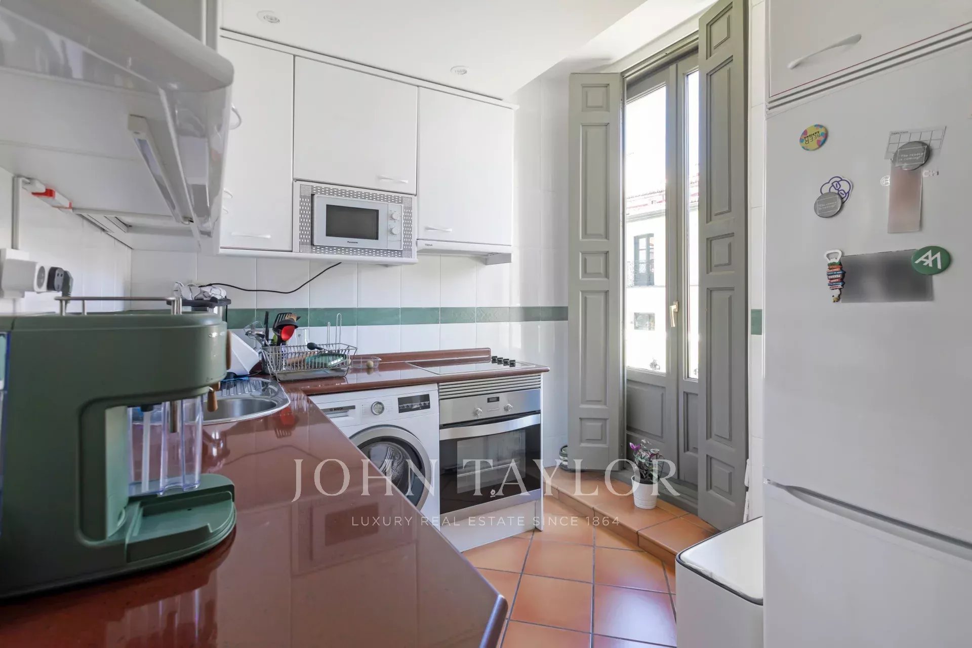 Le bâtiment, avec sa façade majestueuse et sa porte d'époque, est en parfait état et fait partie du paysage immémorial de Justicia, l'un des quartiers les plus dynamiques et sophistiqués de Madrid, entouré de galeries d'art, de boutiques de créateurs, de restaurants étoilés et de tous les services au niveau de la rue.