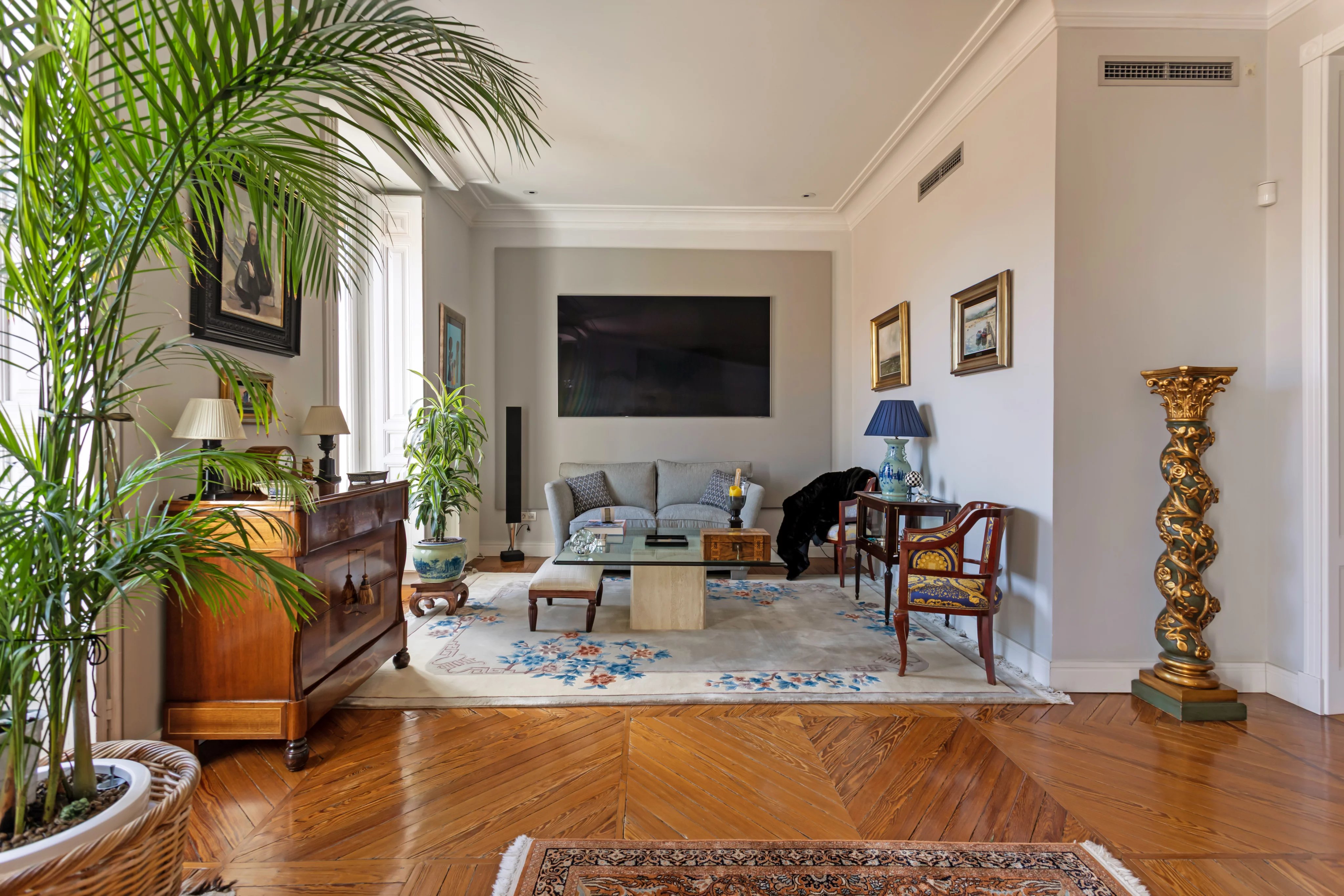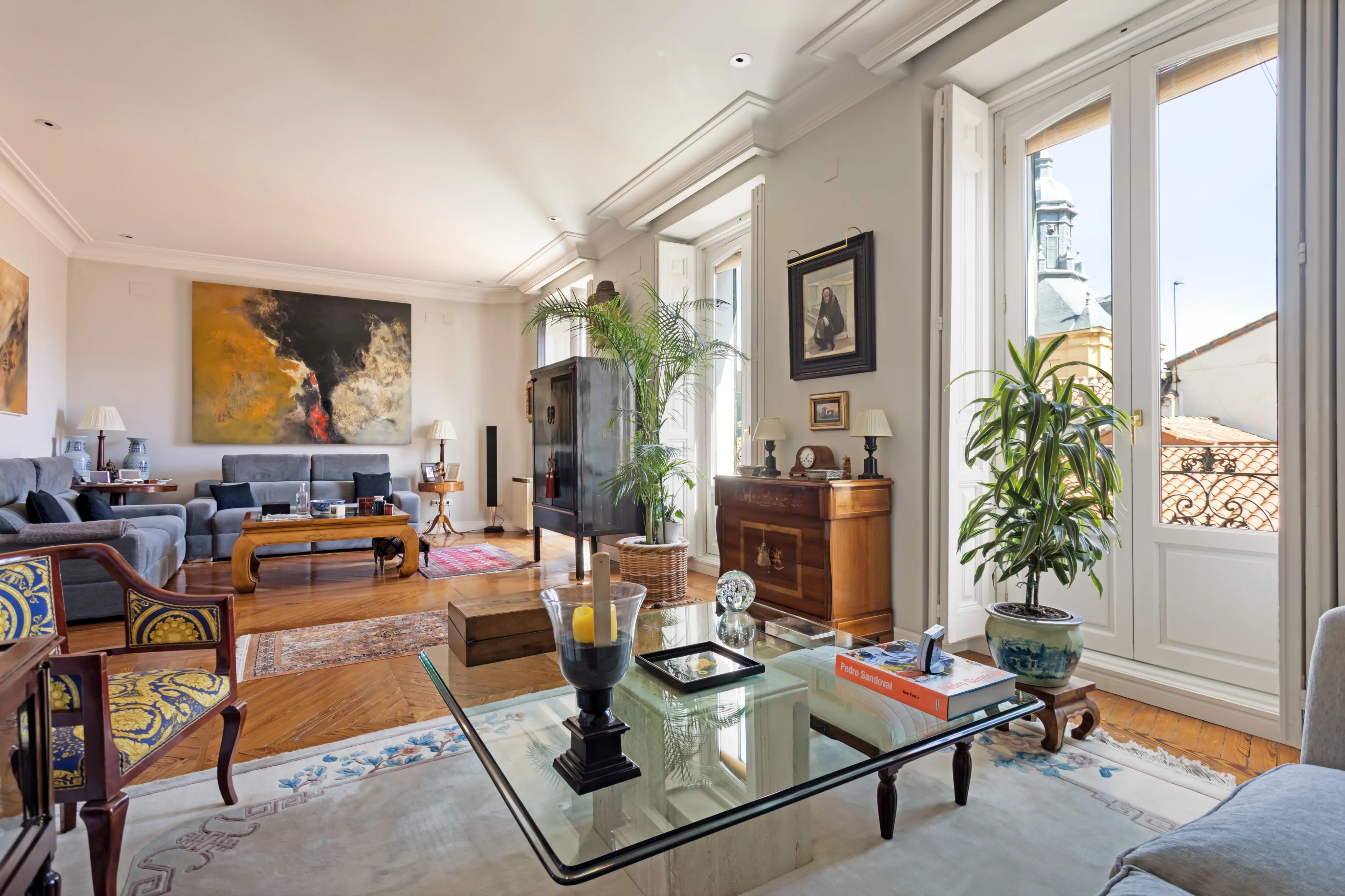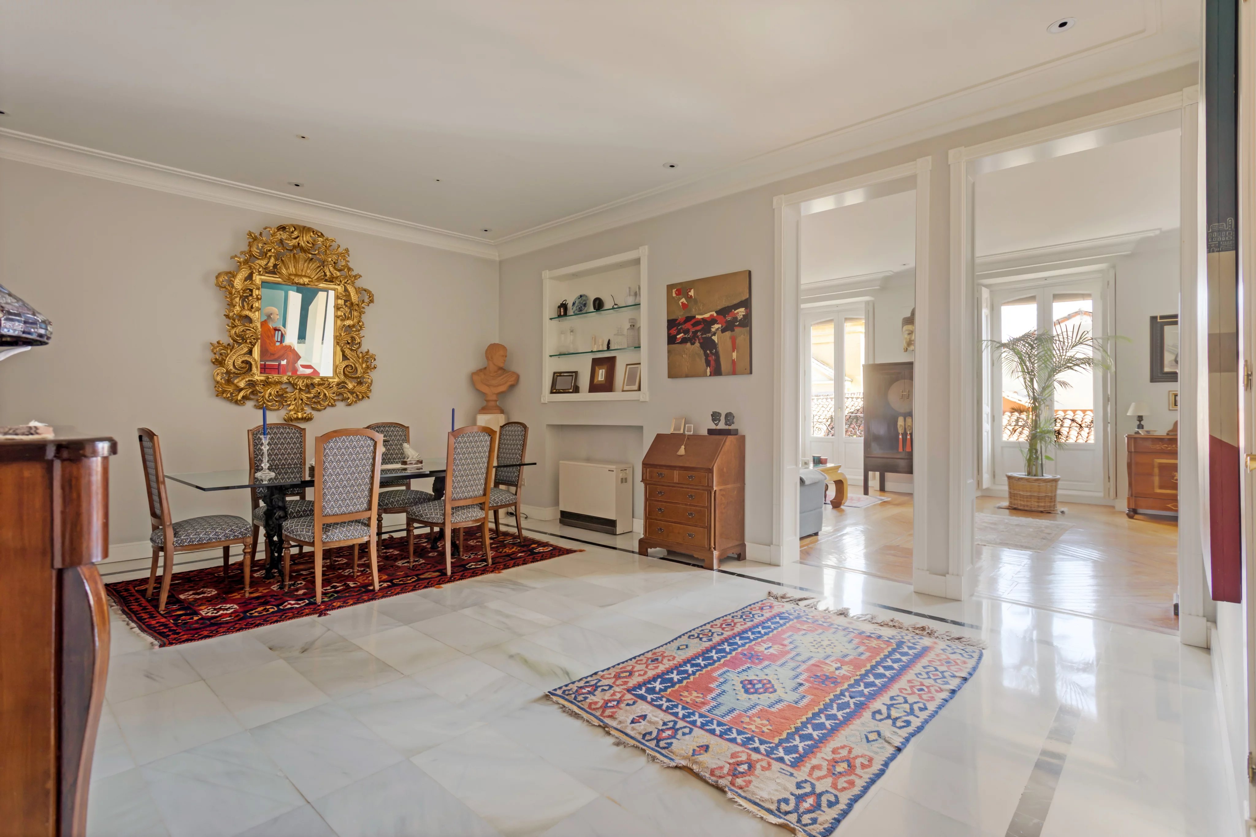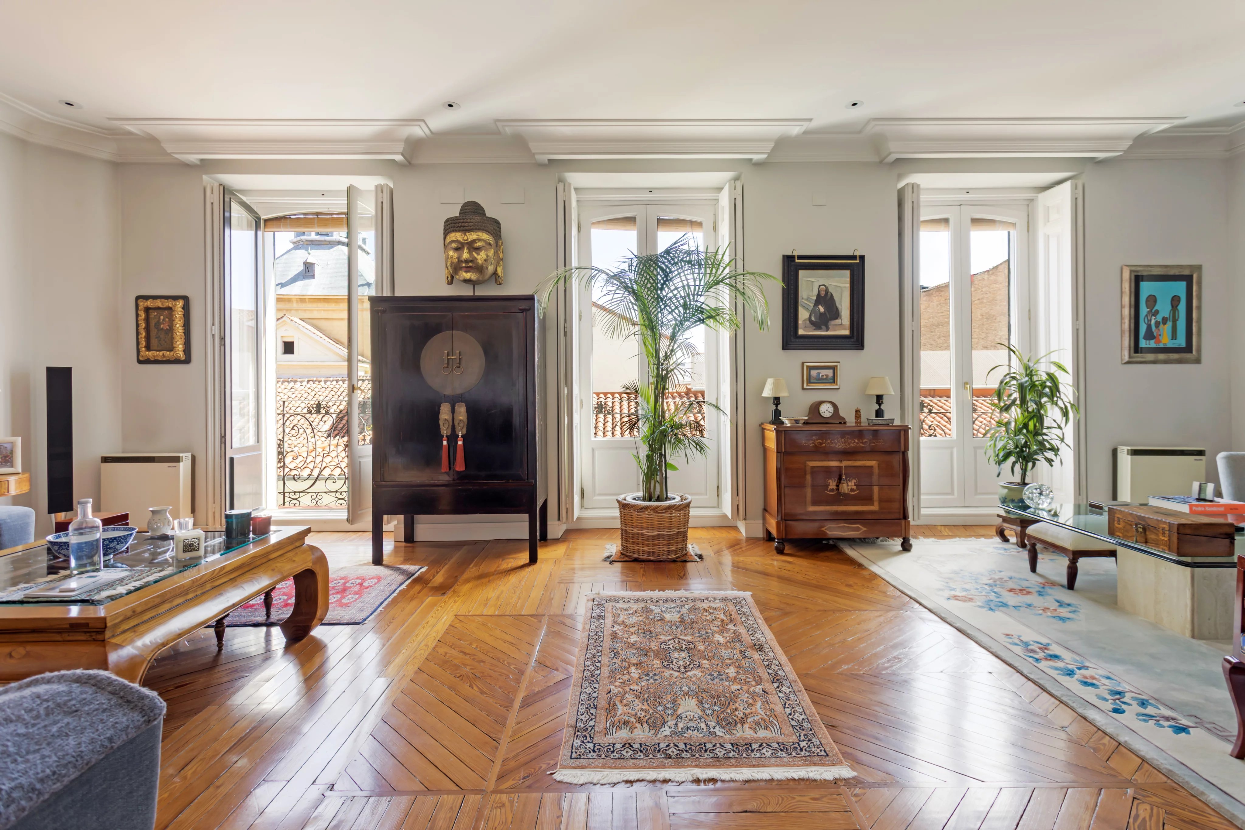 Le salon indépendant, orienté au sud-est, s'ouvre sur trois balcons extérieurs qui inondent la pièce de lumière naturelle et offrent une vue dégagée sur l'emblématique Couvent des Mercedarias Descalzas, apportant un caractère unique et profondément madrilène.