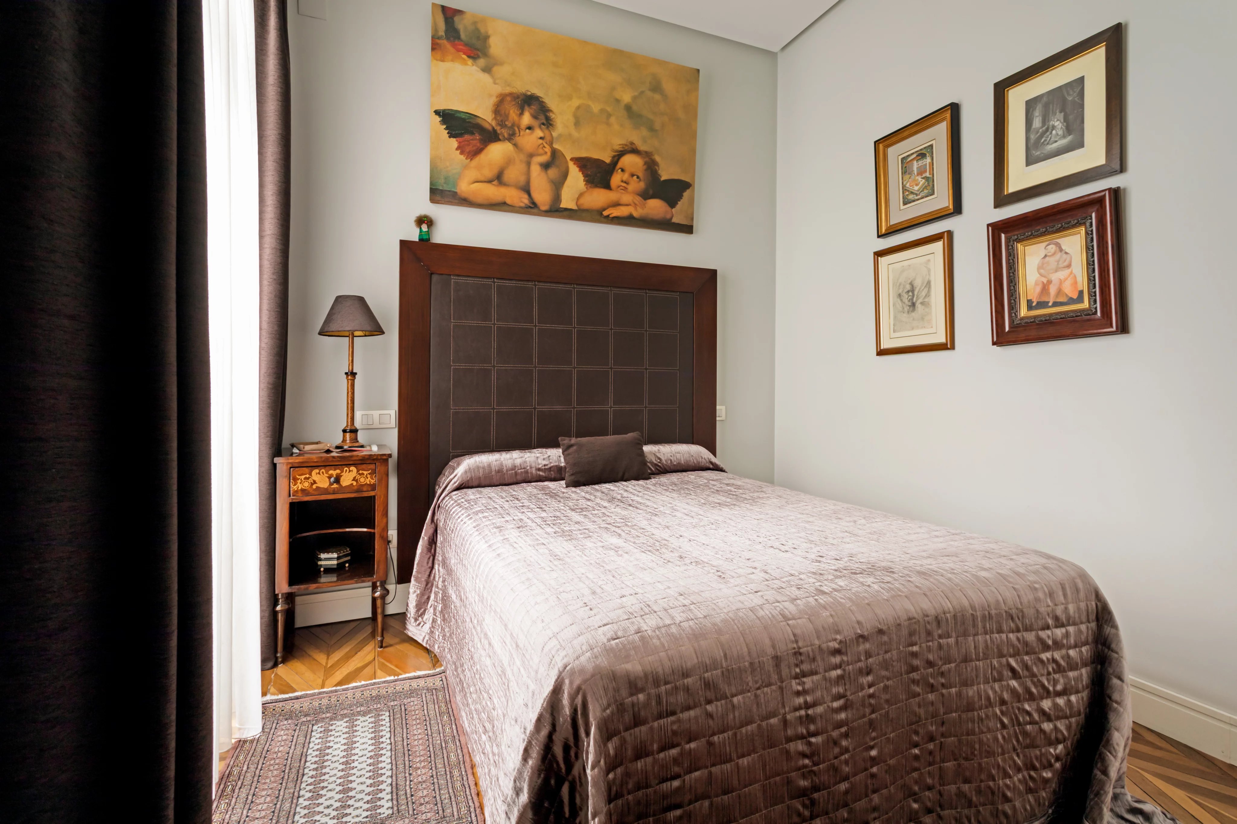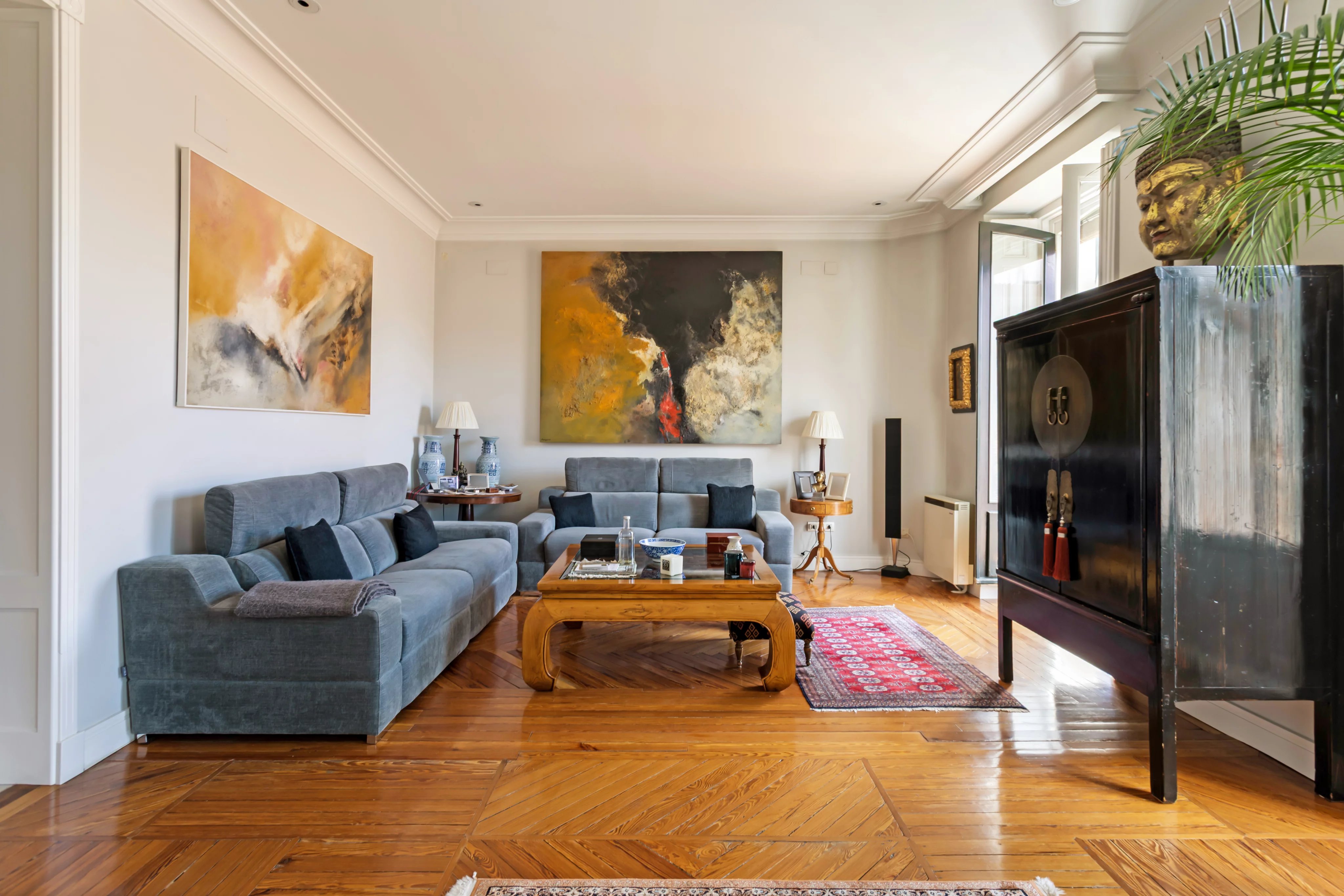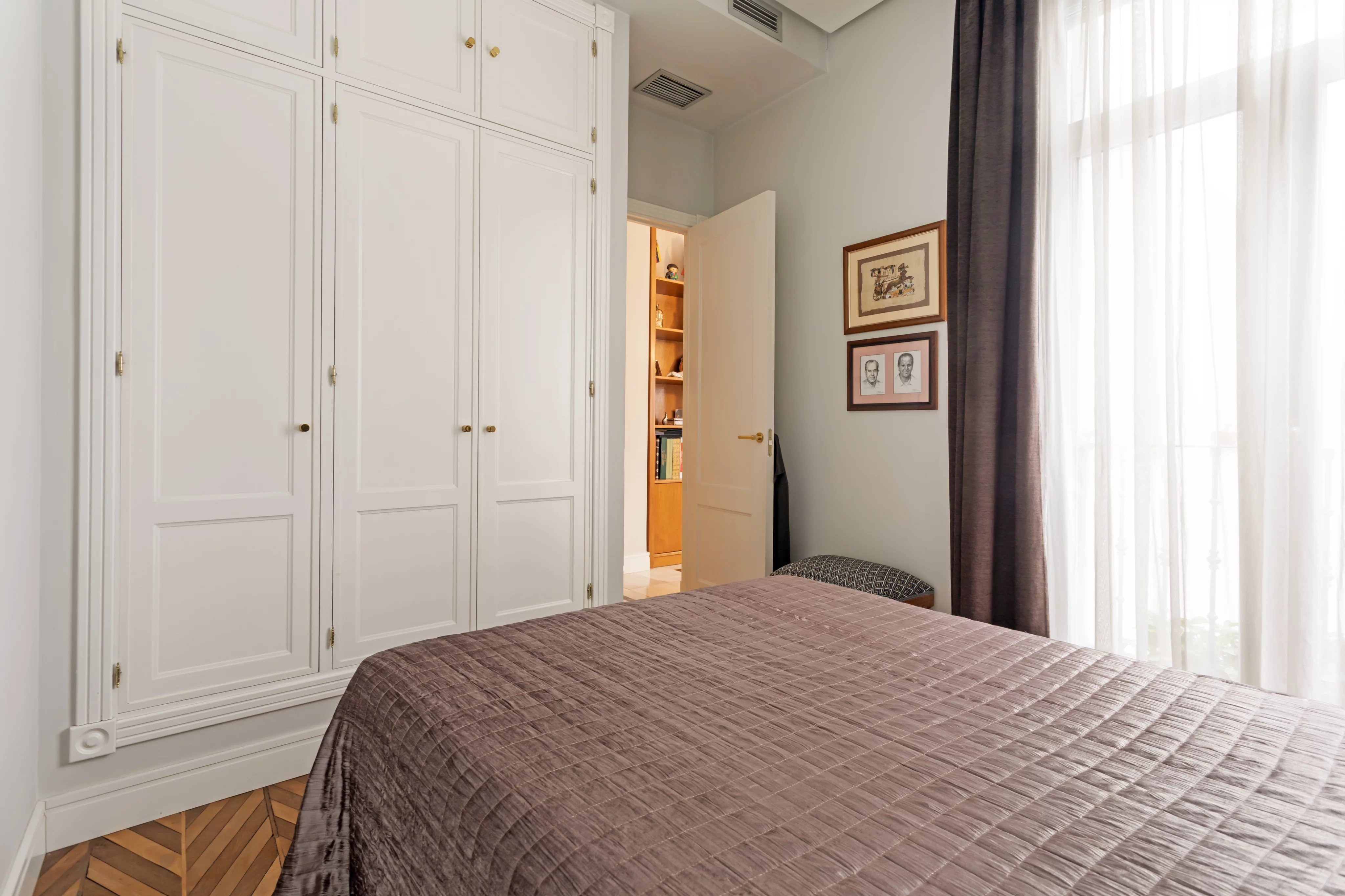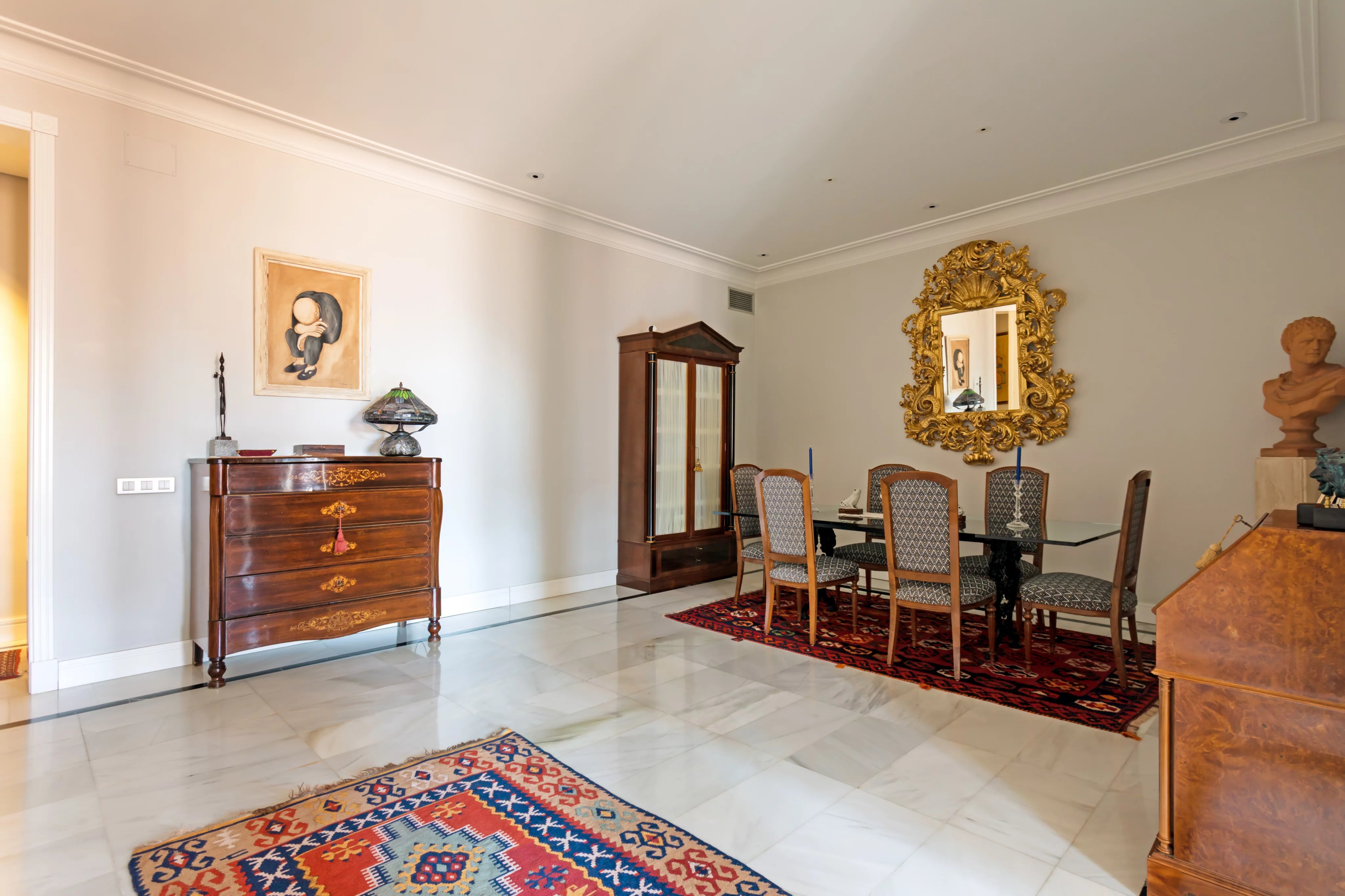 Le salon indépendant, orienté au sud-est, s'ouvre sur trois balcons extérieurs qui inondent la pièce de lumière naturelle et offrent une vue dégagée sur l'emblématique Couvent des Mercedarias Descalzas, apportant un caractère unique et profondément madrilène.