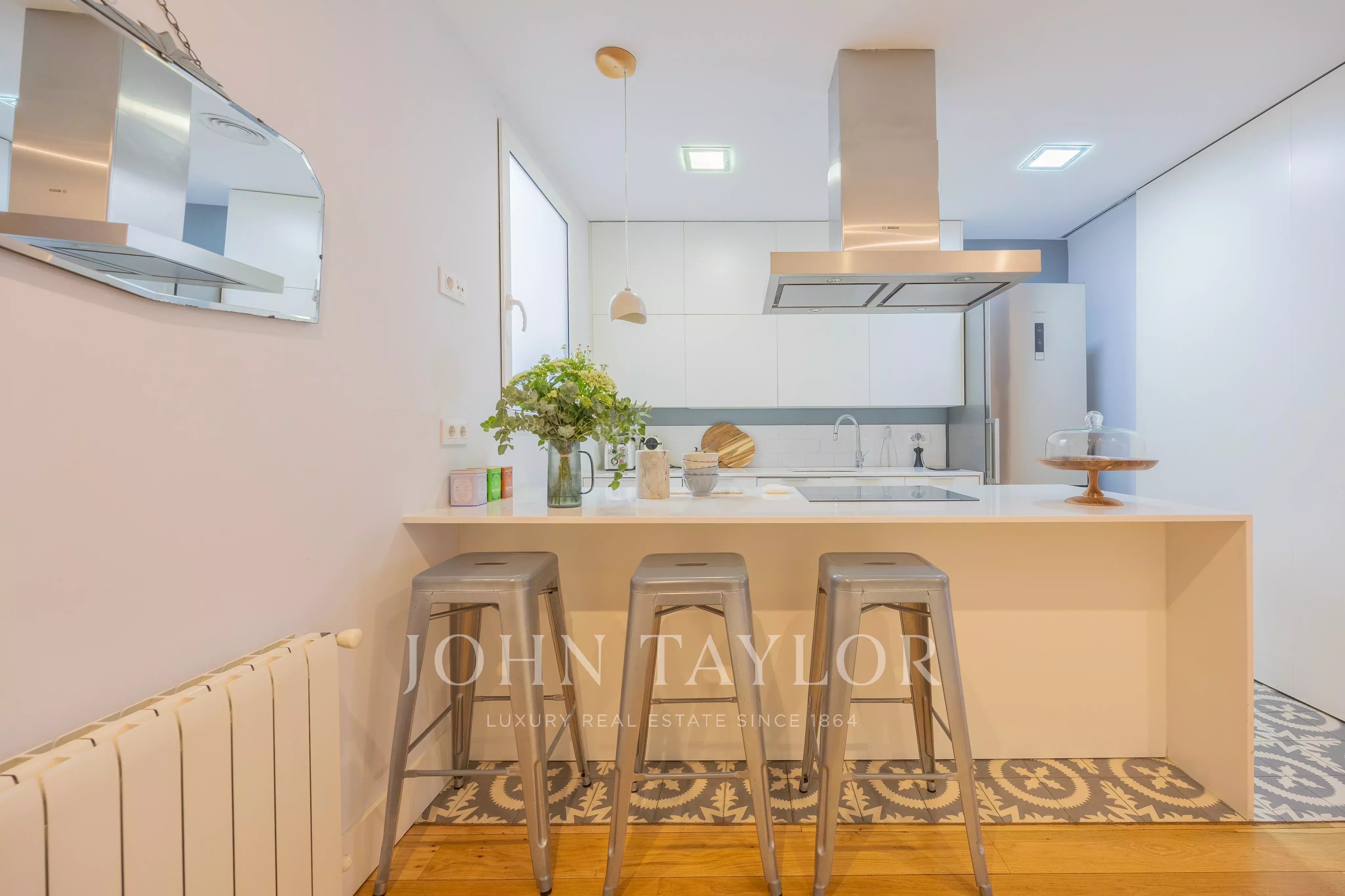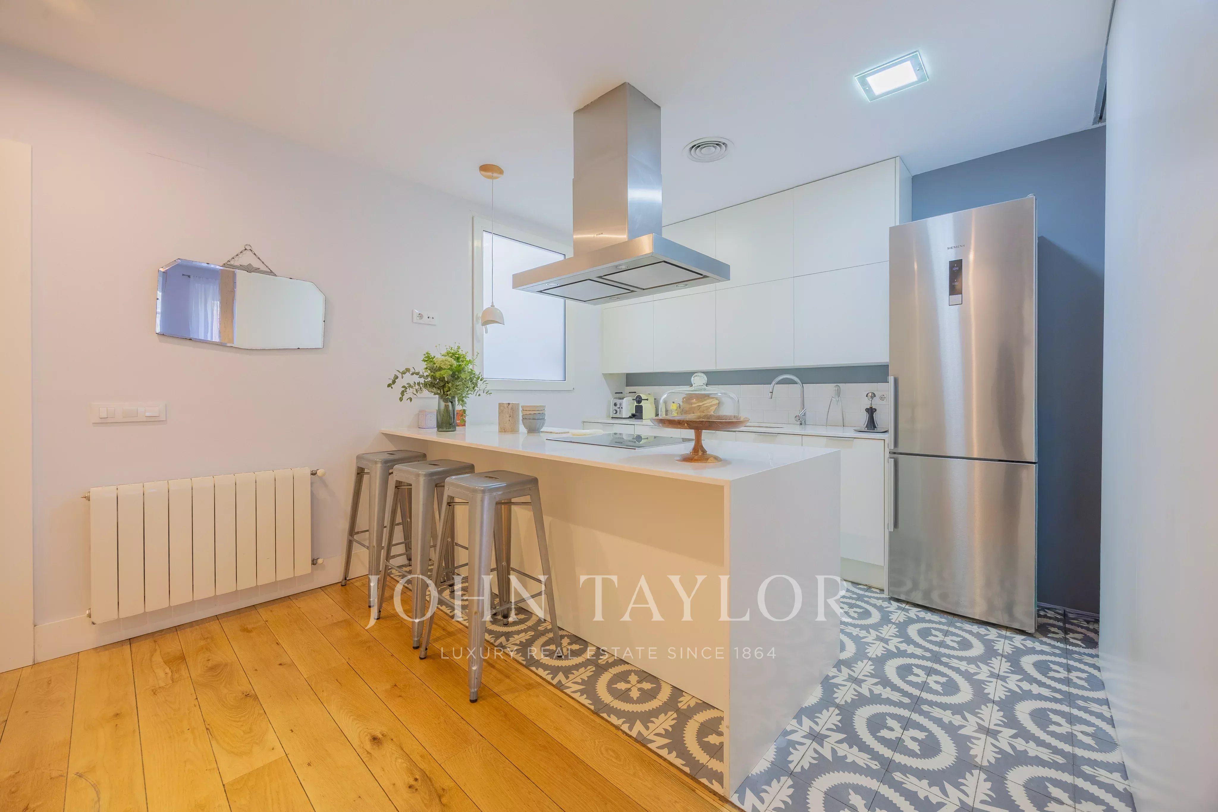 L'habitation dispose de deux chambres spacieuses, d'un salon-salle à manger lumineux avec de grandes fenêtres et d'une ambiance moderne et chaleureuse grâce à ses sols en bois et sa décoration soignée. La cuisine, entièrement équipée, s'intègre parfaitement avec la zone de séjour, offrant fonctionnalité et design contemporain. Des détails tels que la climatisation, la vidéophone et un concierges garantissent un confort et une sécurité maximaux au quotidien, créant un foyer adapté aux besoins actuels. L'appartement se distingue par sa excellente distribution, qui optimise chaque mètre carré et tire parti au maximum de la lumière naturelle.