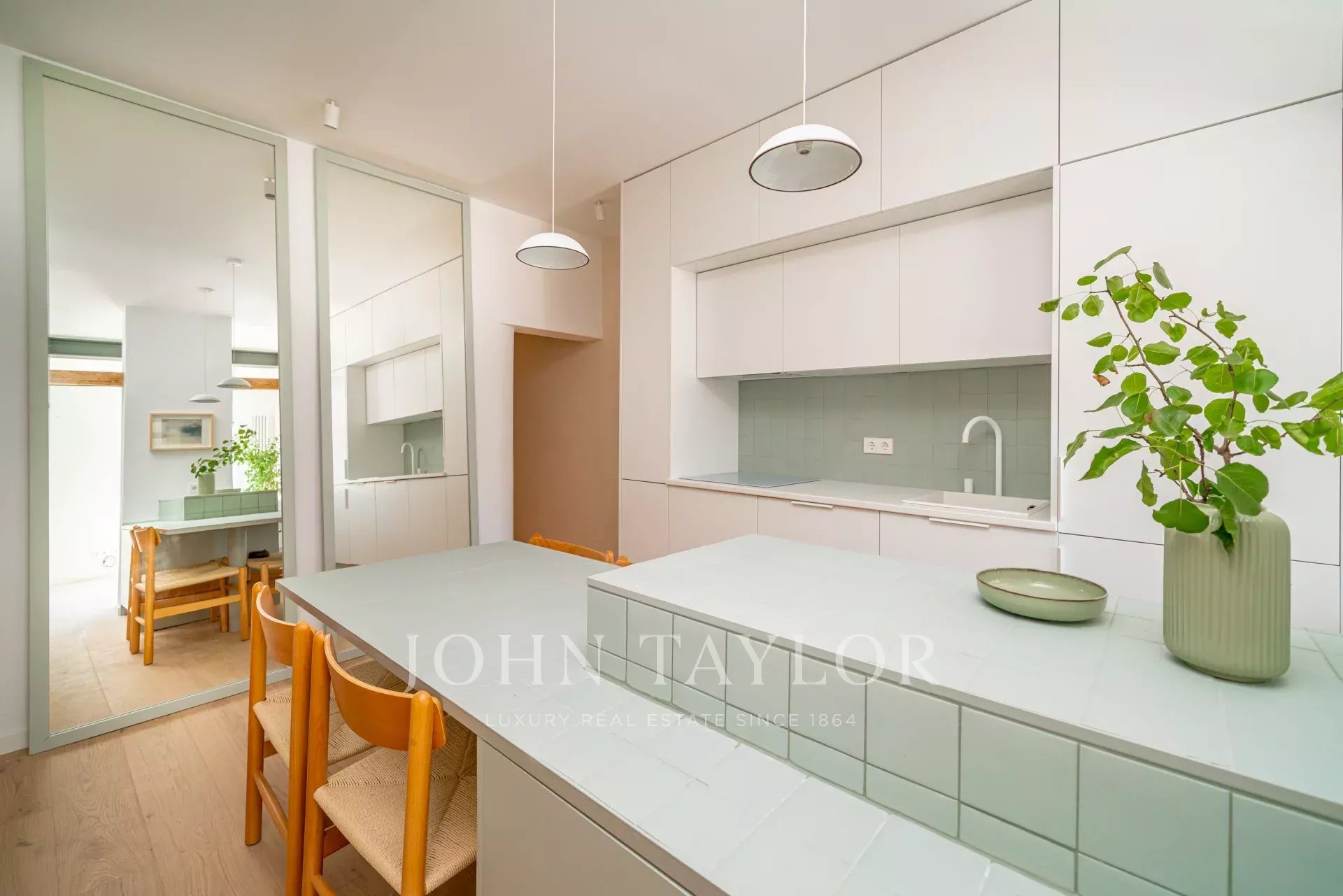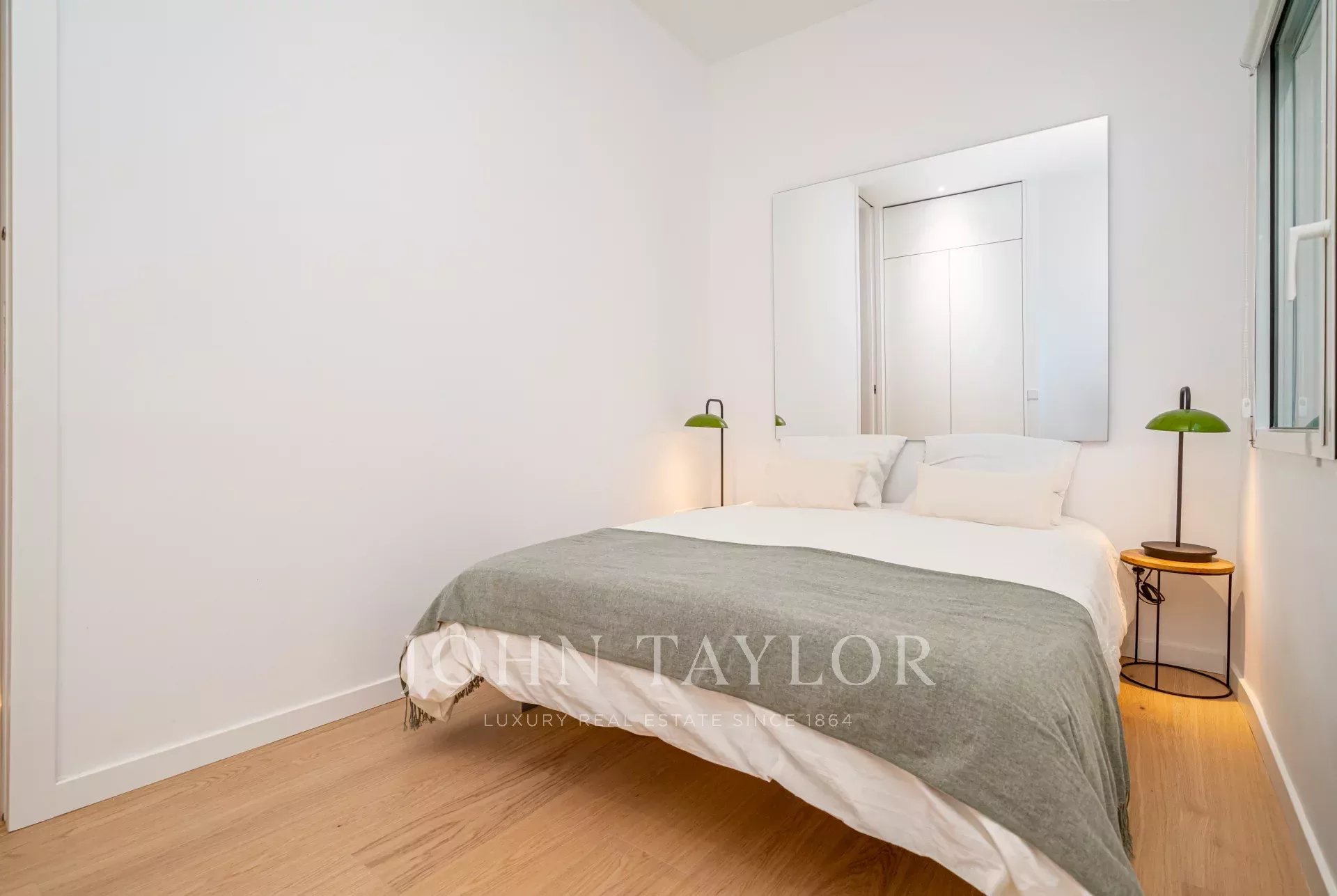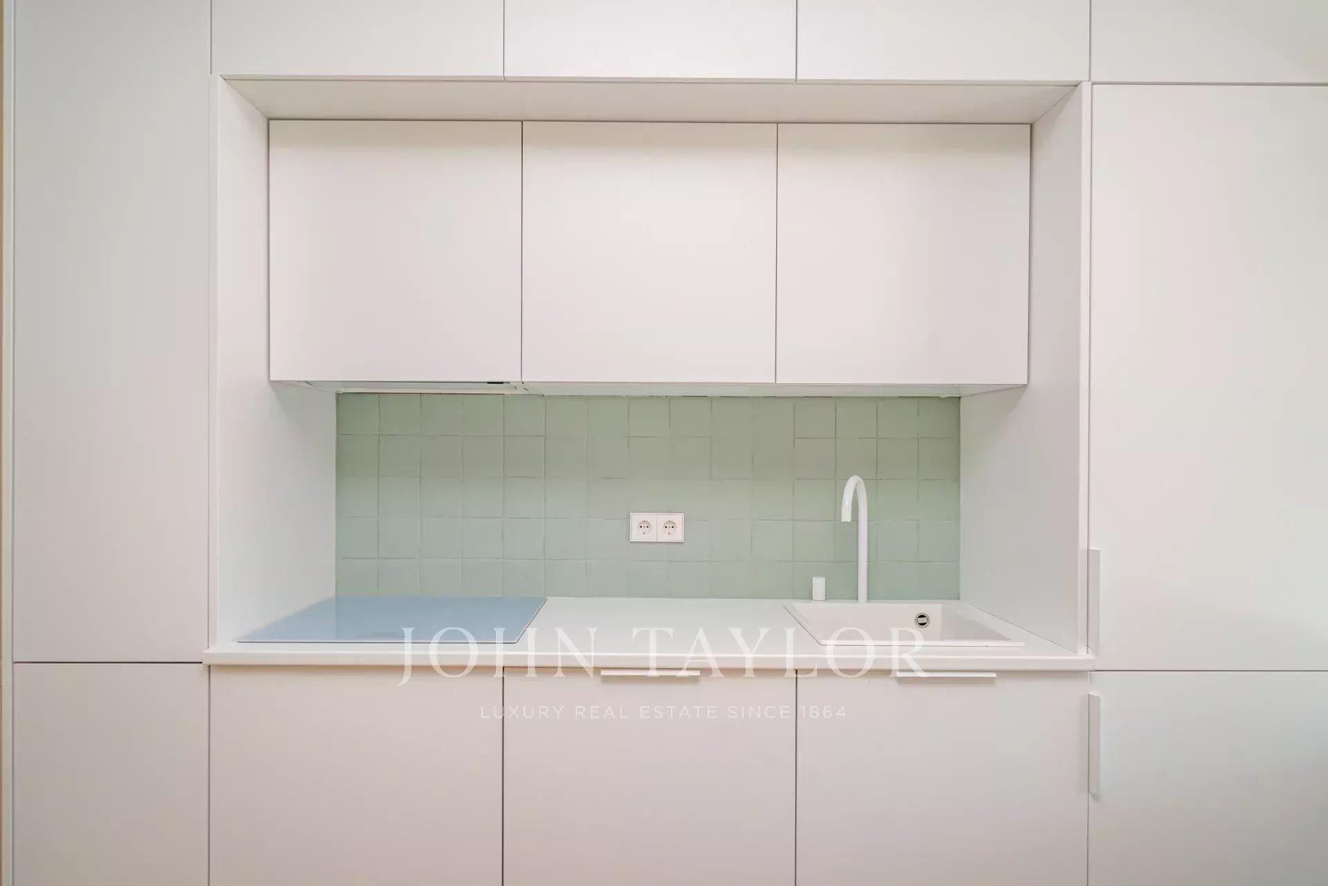 L'appartement dispose d'un beau séjour avec balcon donnant sur la rue, à côté duquel se trouve une pièce modulable en verre avec un lit caché, qui peut être utilisée comme chambre d'amis ou bureau. La cuisine entièrement équipée dispose d'un îlot et d'une table à manger. L'appartement comprend également deux autres chambres et deux salles de bains, dont la principale est une salle de bains privative.
