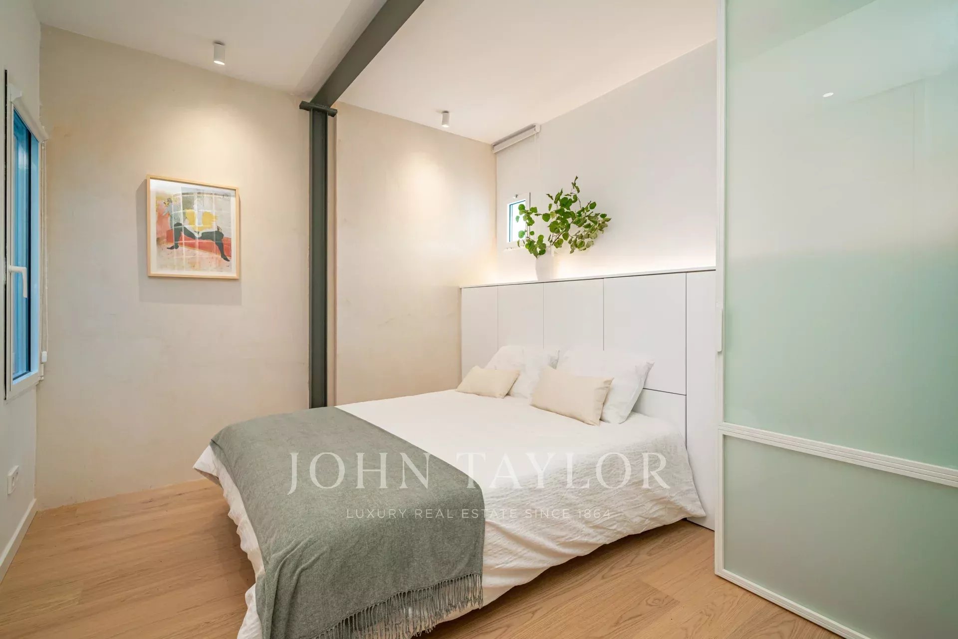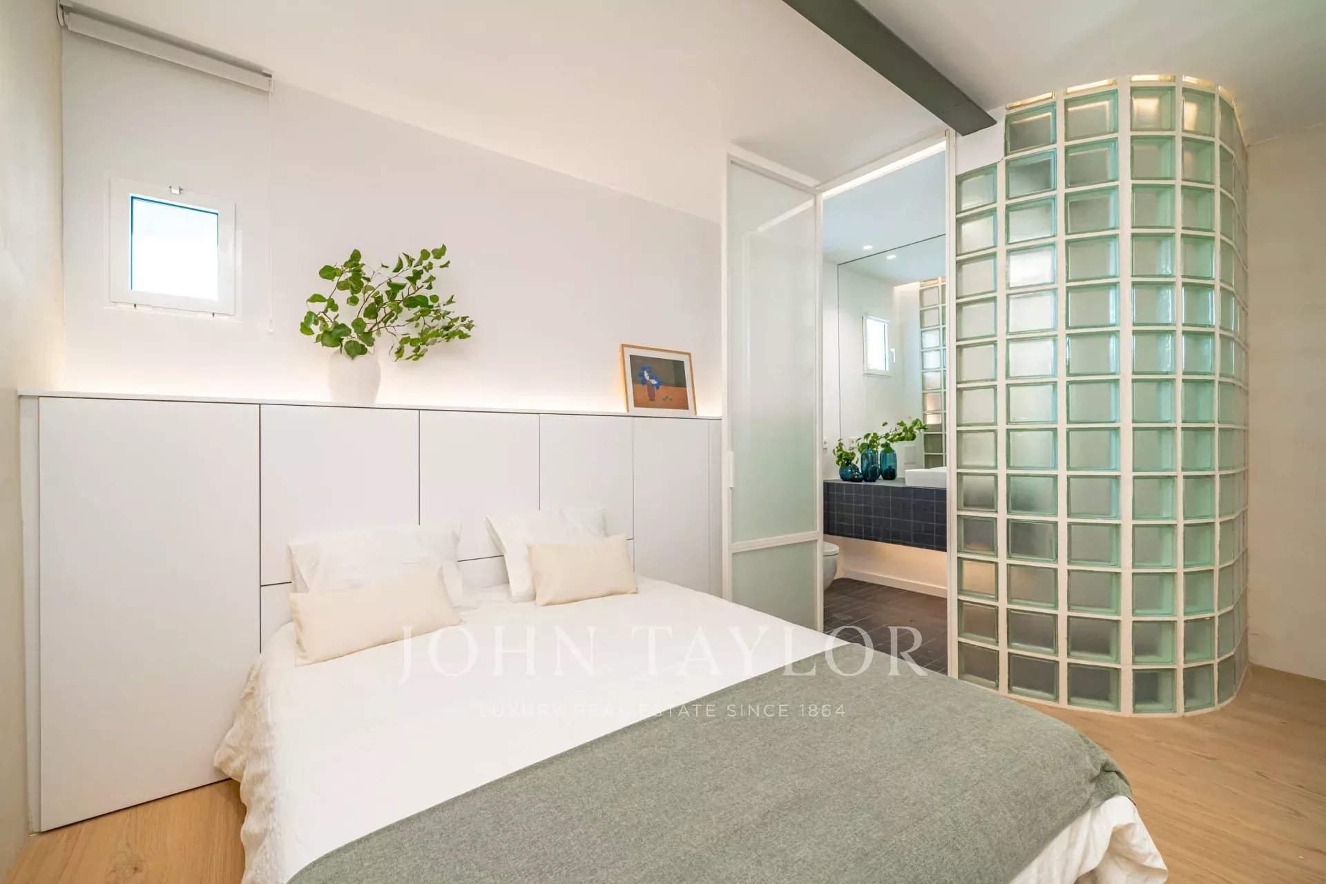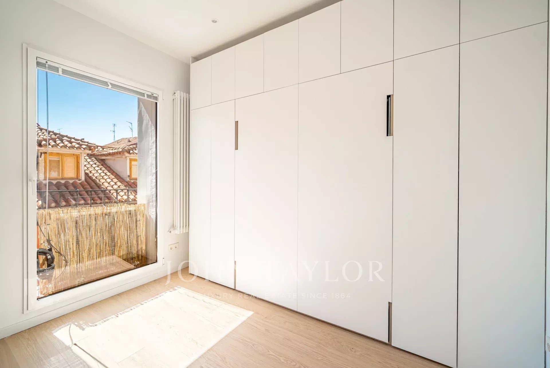 L'appartement dispose d'un beau séjour avec balcon donnant sur la rue, à côté duquel se trouve une pièce modulable en verre avec un lit caché, qui peut être utilisée comme chambre d'amis ou bureau. La cuisine entièrement équipée dispose d'un îlot et d'une table à manger. L'appartement comprend également deux autres chambres et deux salles de bains, dont la principale est une salle de bains privative.