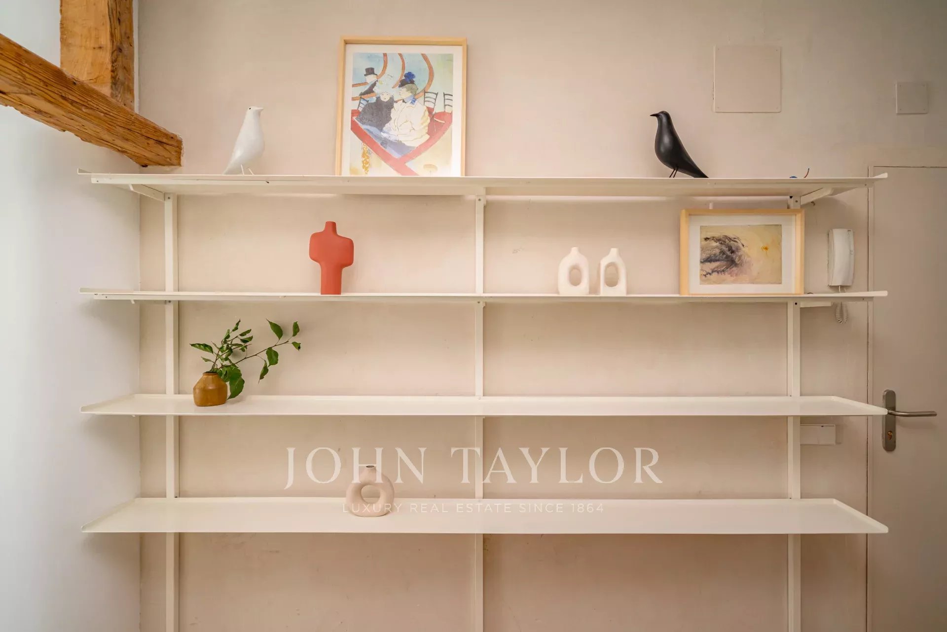 L'appartement comprend de nombreux détails : piliers et poutres en bois d'origine du bâtiment, projet d'éclairage chaleureux, mobilier sur mesure, douches en carrelage italien, etc.