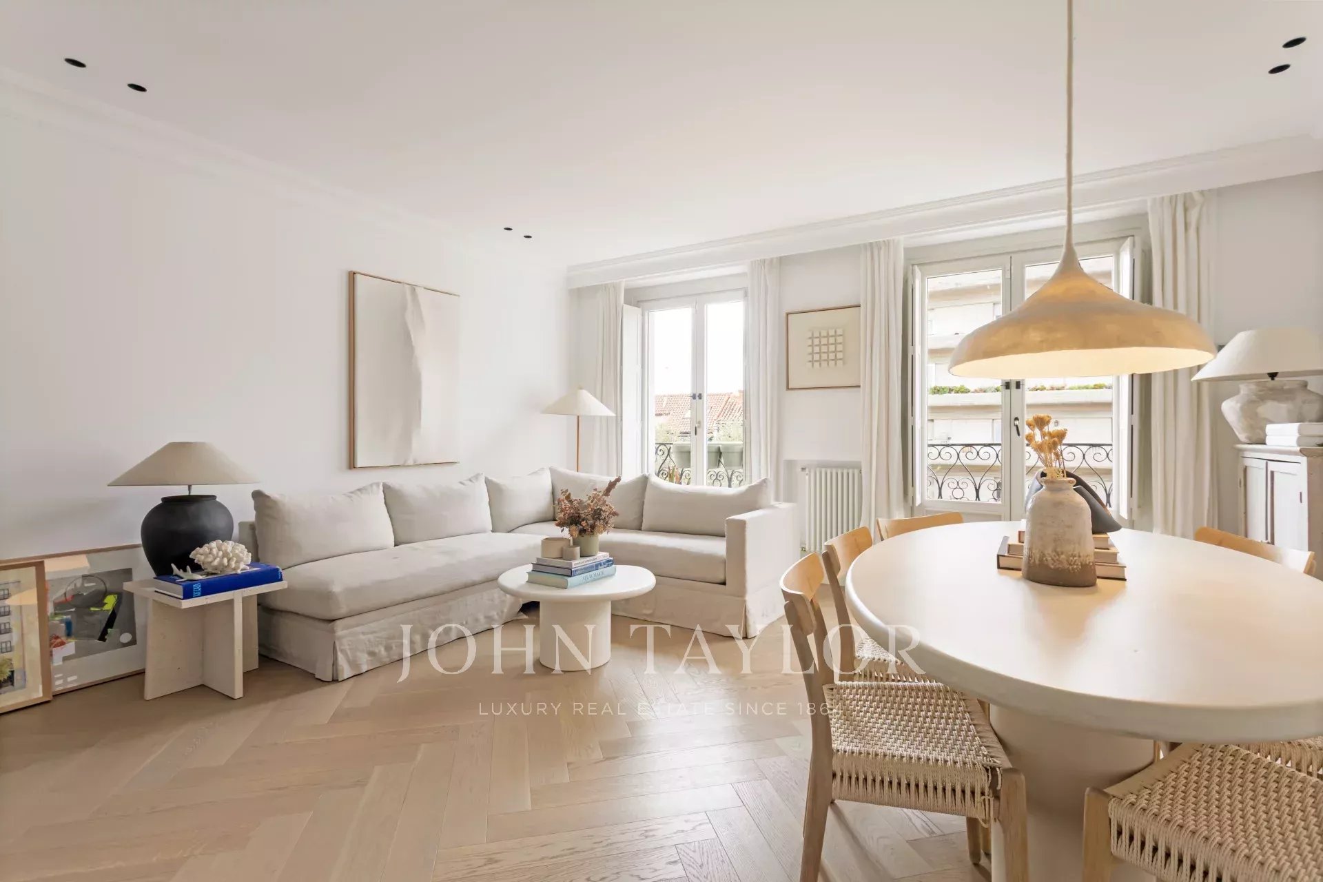 Le séjour, inondé de lumière naturelle grâce à ses fenêtres à double vitrage et ses volets en bois, offre une vue imprenable sur un haut lieu de l'urbanisme moderne, procurant un sentiment d'espace et de sérénité. L'orientation sud-ouest garantit une luminosité constante tout au long de la journée.