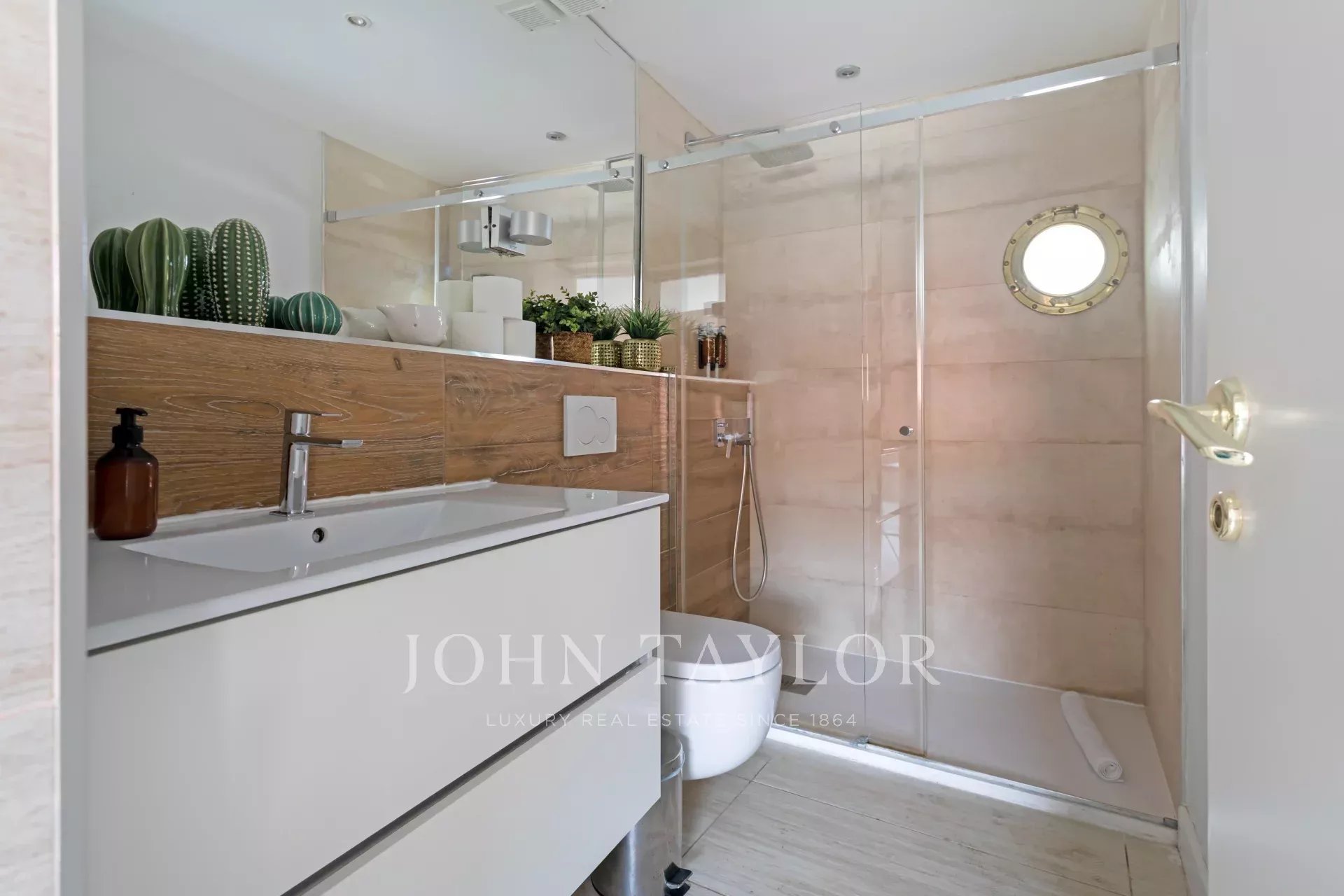 La chambre à coucher, avec lit double et placards, s'ouvre par des portes coulissantes et dispose d'une grande fenêtre qui apporte de la lumière naturelle. La salle de bains est complète, avec de nombreux rangements et une grande douche.