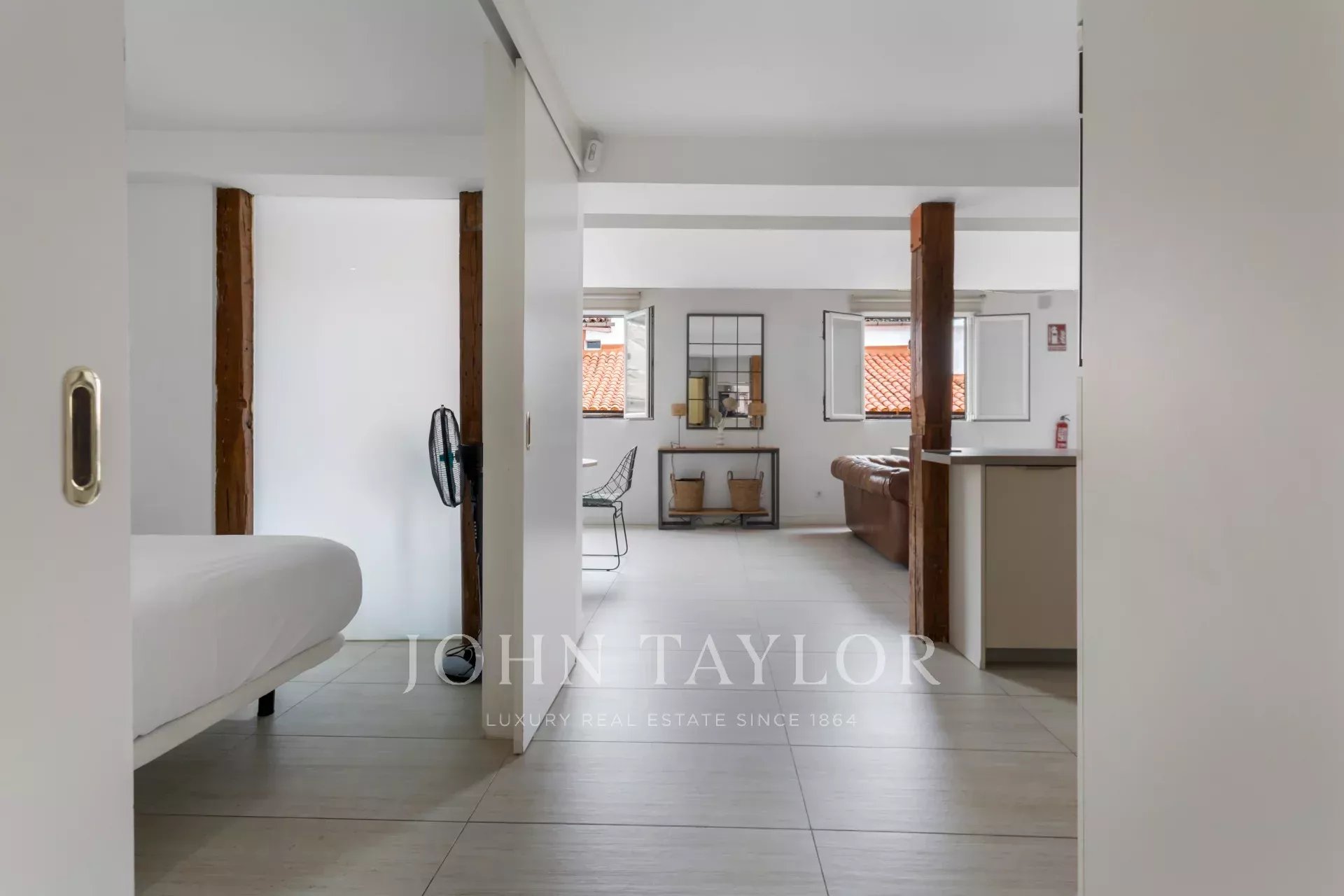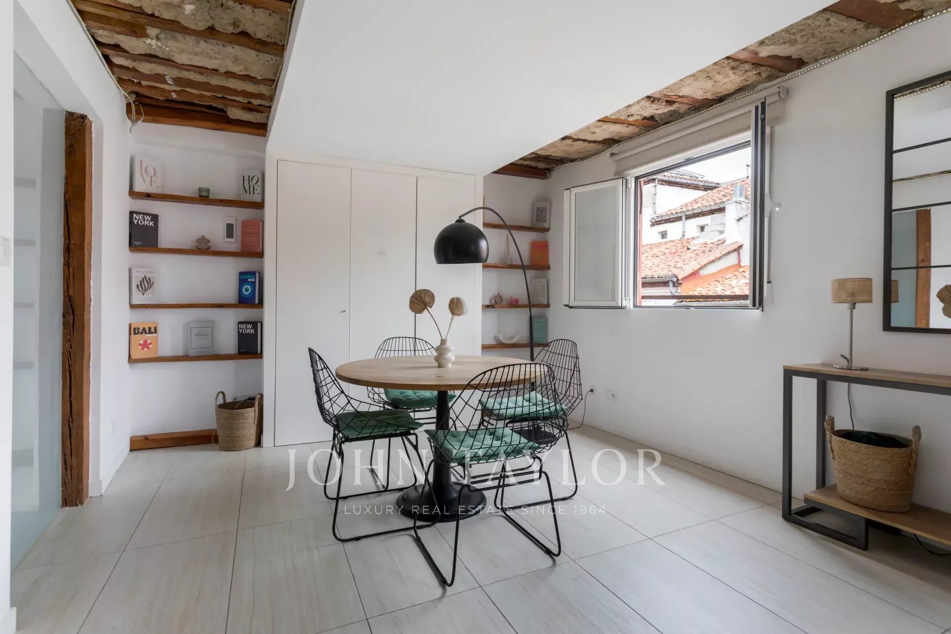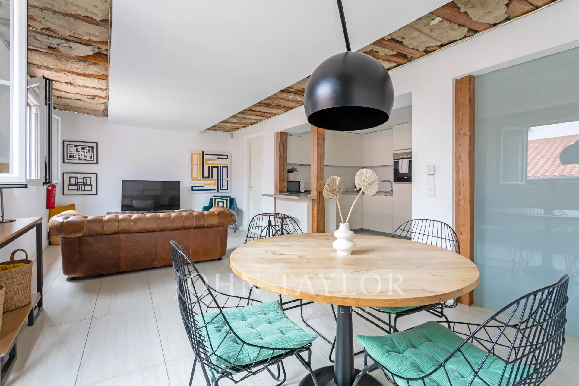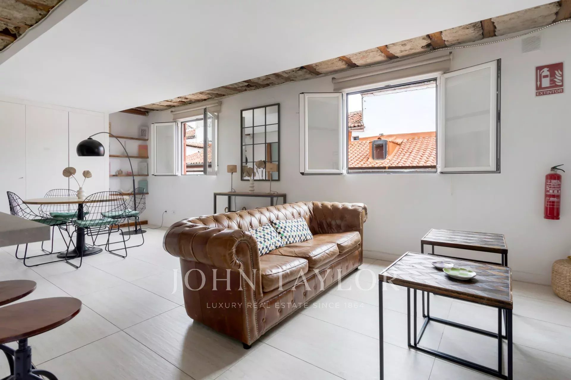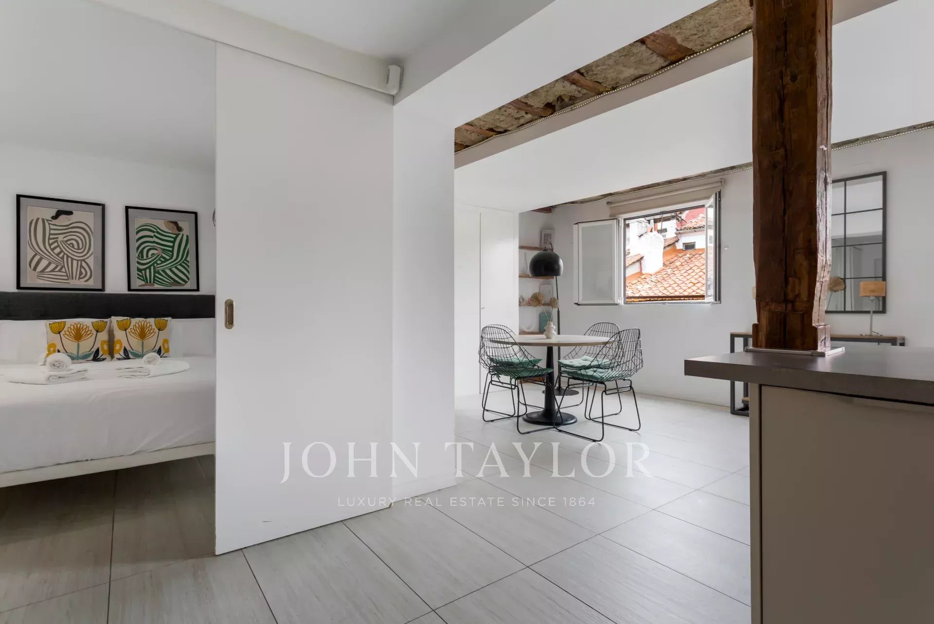 Dans l'un des quartiers les plus animés de la ville, et dans un bel immeuble classique datant de 1900, nous trouvons ce bel appartement, entièrement rénové, meublé et prêt à être habité. Il est situé au dernier étage de l'immeuble, avec deux fenêtres orientées vers le sud-est, ce qui lui permet de bénéficier d'une grande lumière naturelle. Sa rénovation intelligente permet de tirer le meilleur parti de l'espace et de préserver le caractère original de l'immeuble avec des poutres en bois apparentes sur les plafonds et les murs.