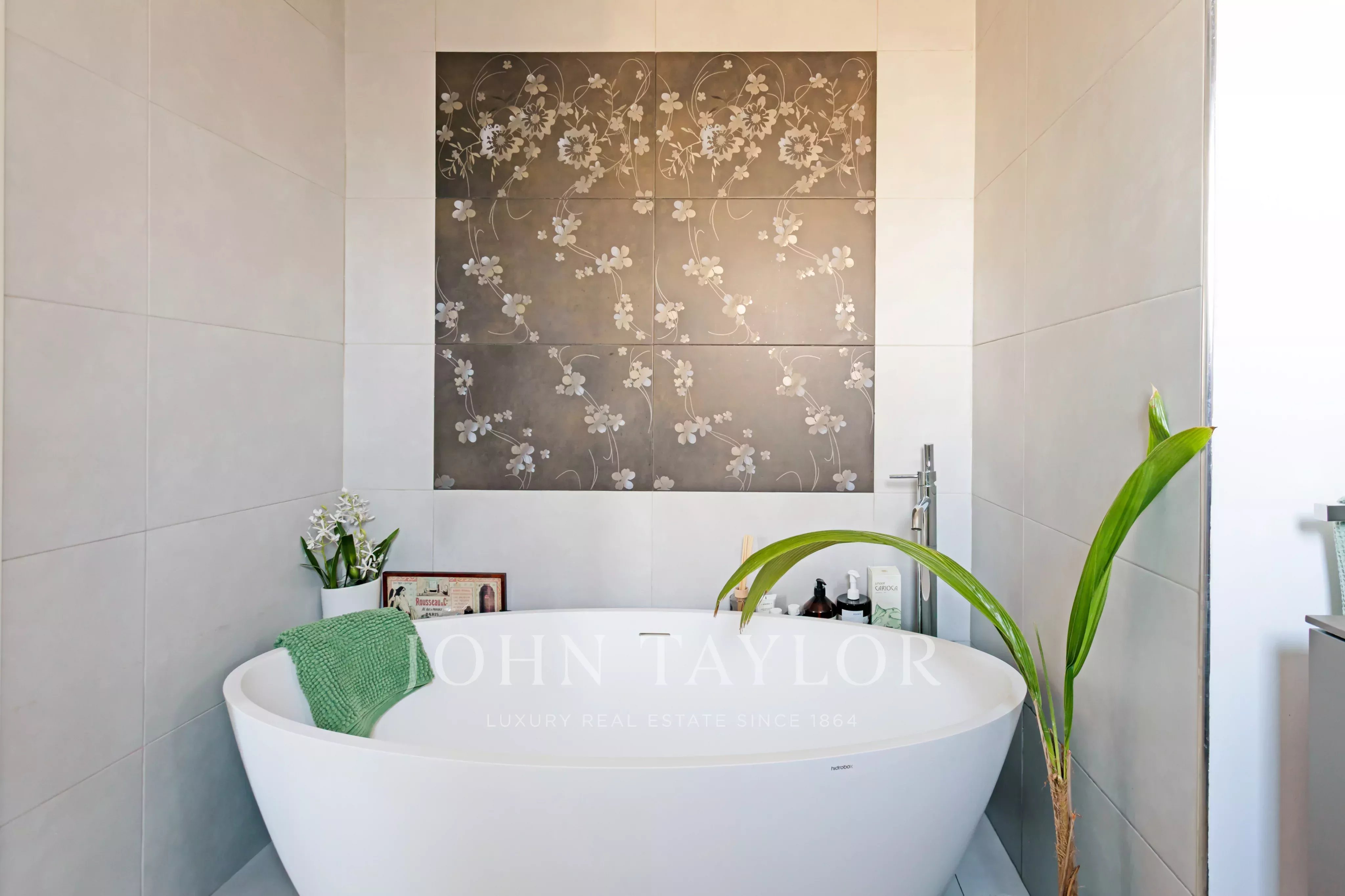 La grande cuisine est équipée d'appareils électroménagers haut de gamme, d'un coin bureau avec de grandes fenêtres qui inondent la pièce de lumière, ce qui en fait un espace fonctionnel et accueillant à la fois. Il y a une chambre de bonne avec sa propre salle de bains.