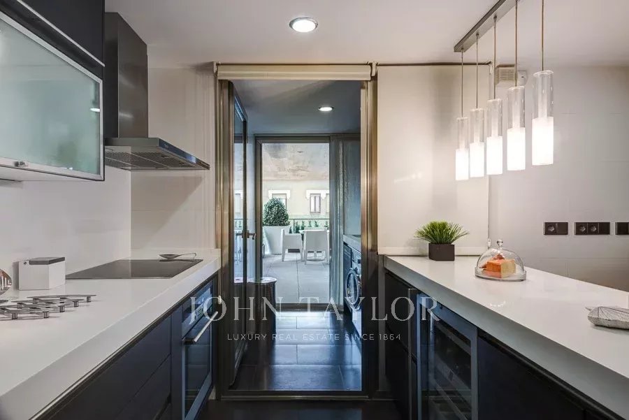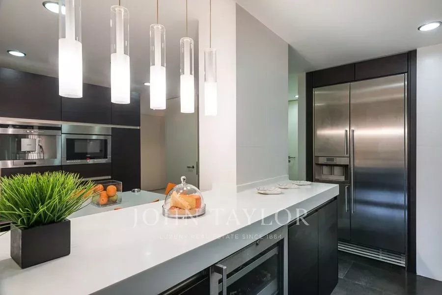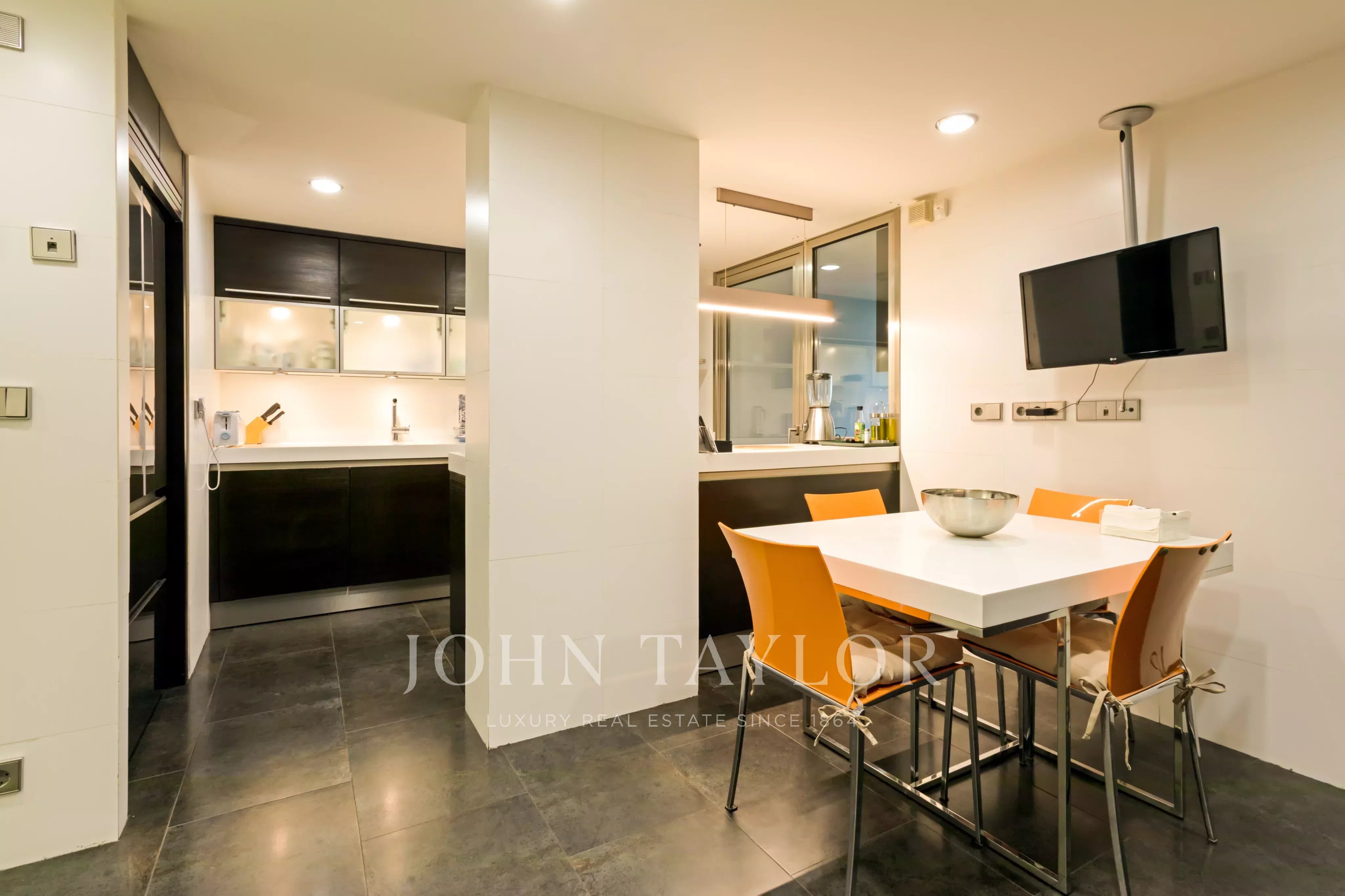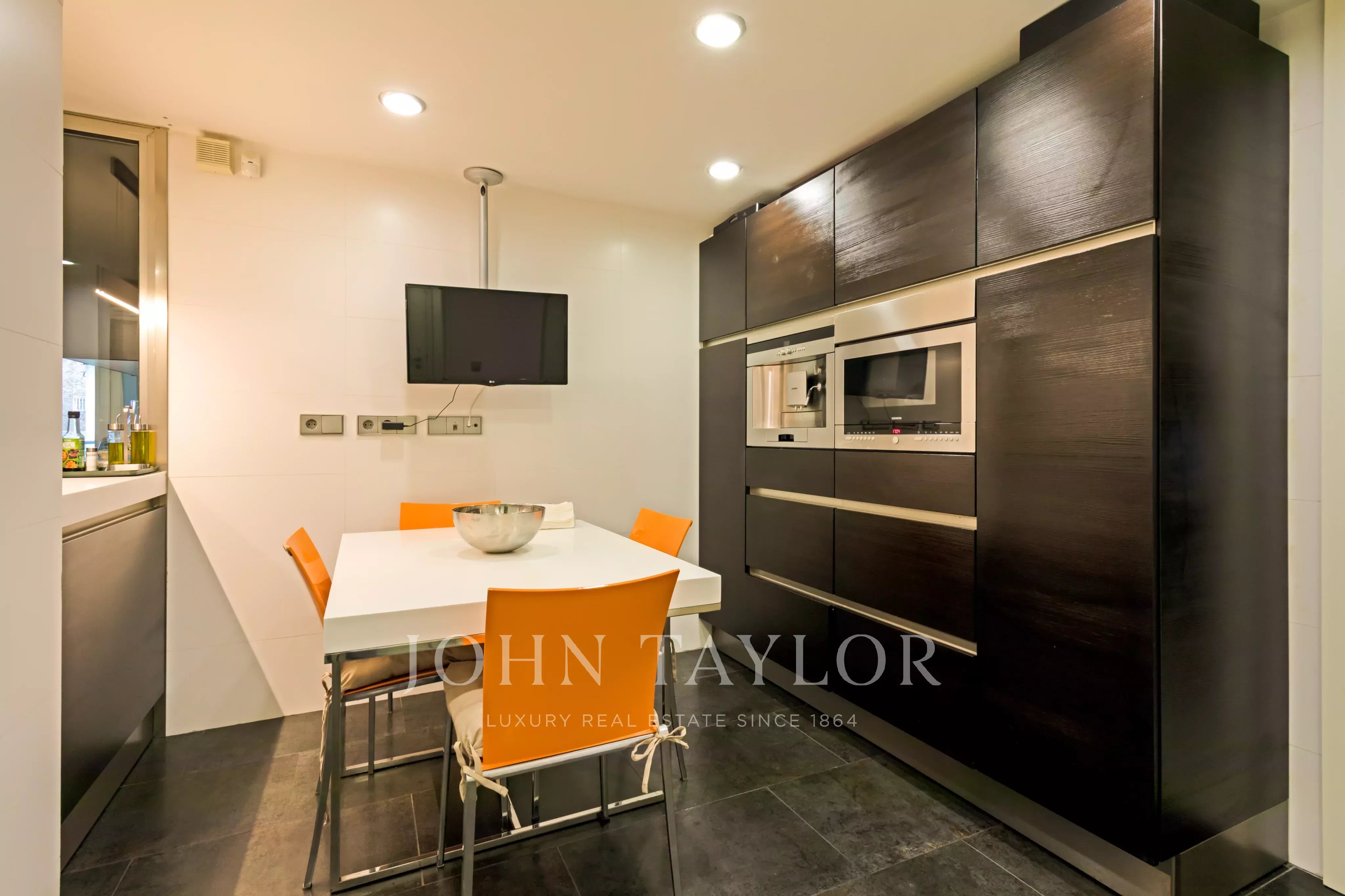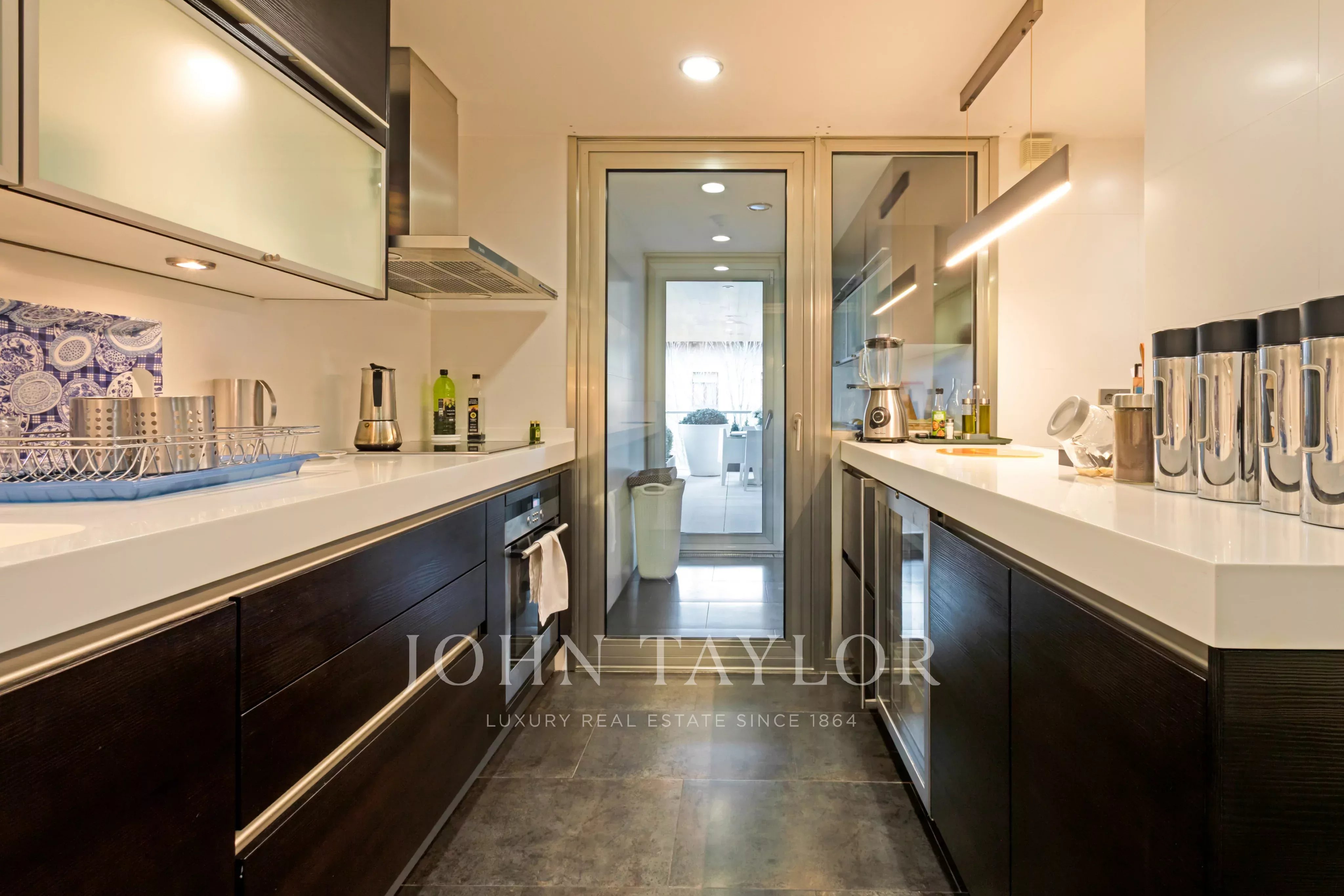 Grande cuisine entièrement équipée, avec terrasse de séjour orientée à l'est. L'espace des pièces ainsi qu'une grande capacité de stockage fournie par ses nombreux placards intégrés du sol au plafond sont à mentionner. La propriété dispose d'un chauffage individuel par le sol et d'un système de climatisation.
