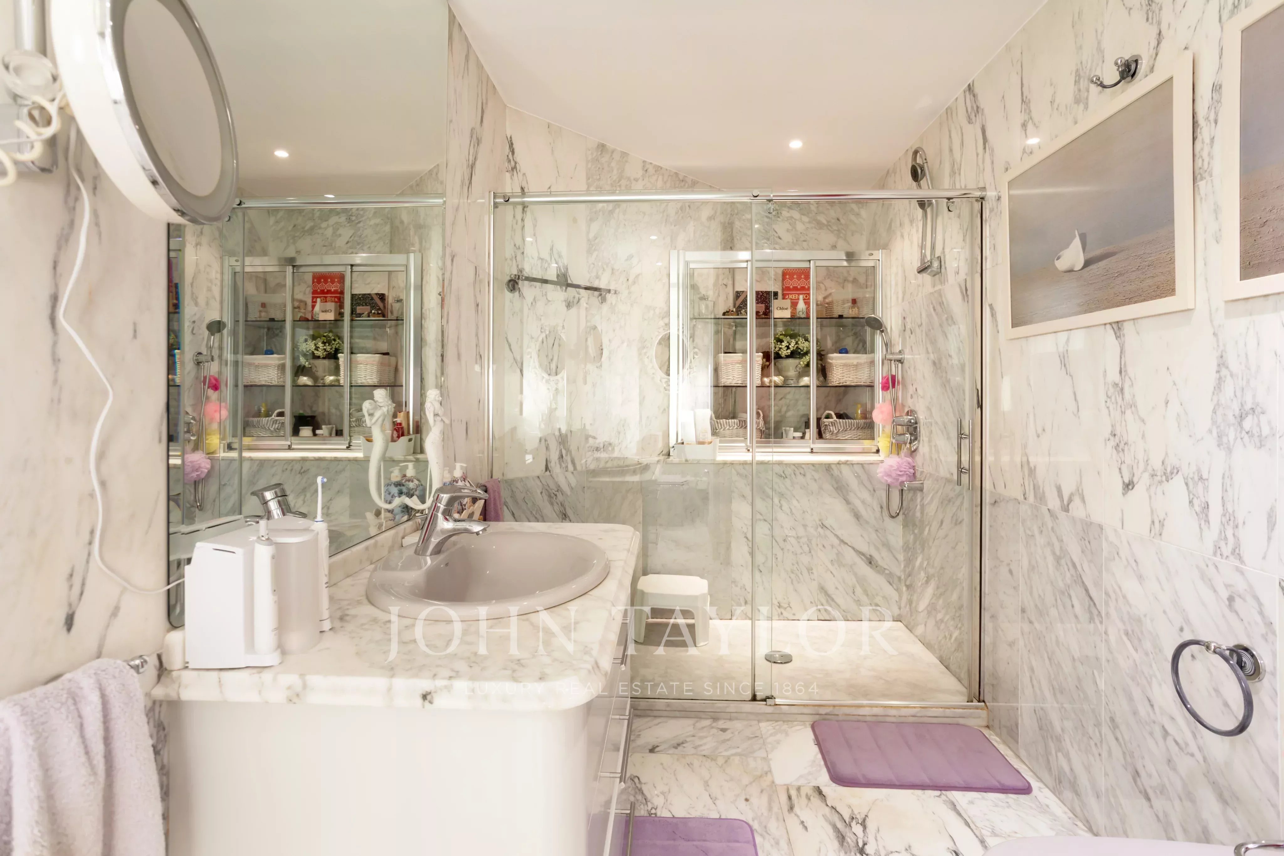 L'agencement actuel offre trois chambres aux dimensions généreuses (à l'origine quatre chambres plus une chambre de service), deux salles de bains complètes - la principale en-suite - et des toilettes pour les invités.