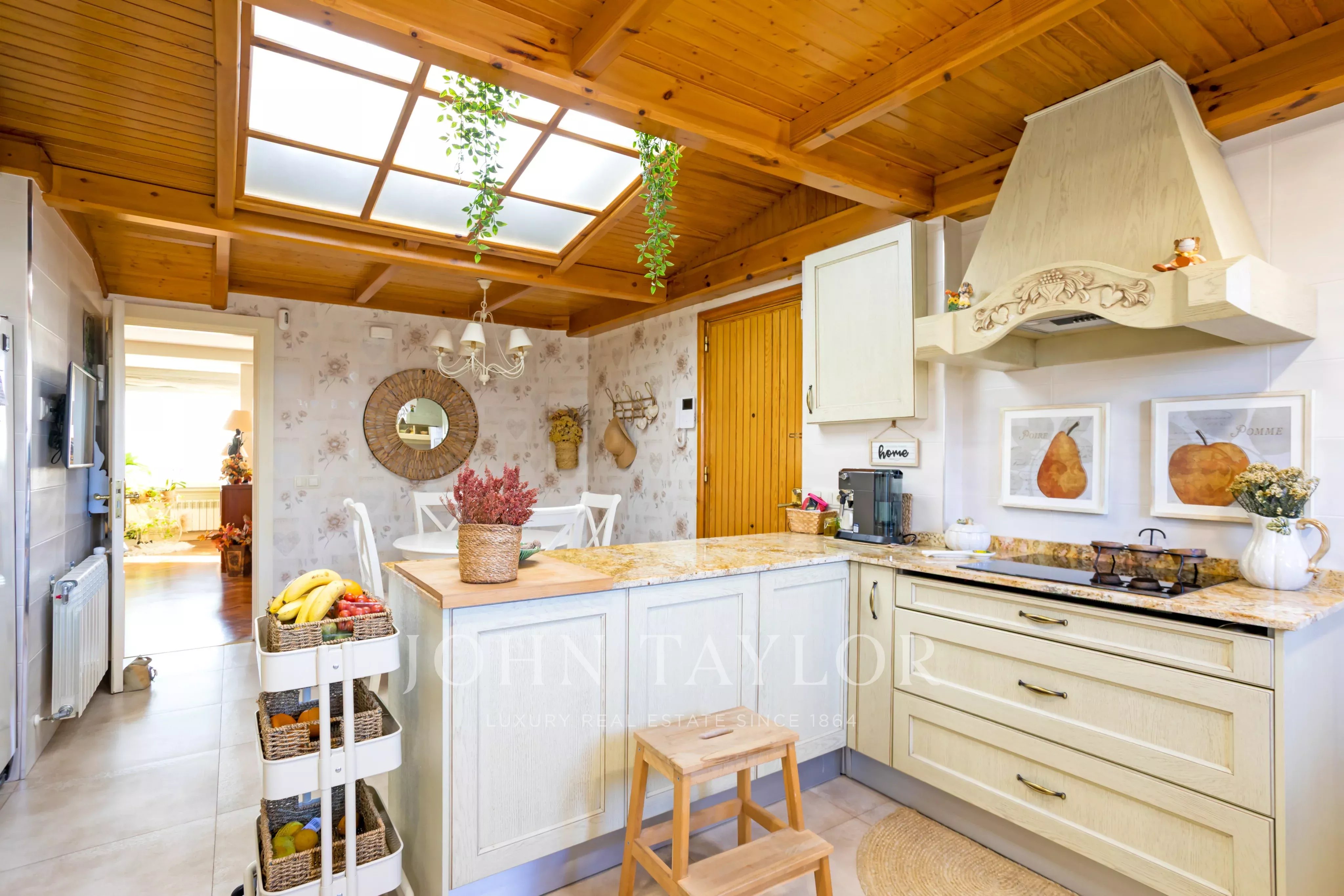 La partie sociale se compose d'un spacieux salon-salle à manger d'environ 50 m², orienté au sud et doté de grandes fenêtres qui garantissent un magnifique apport de lumière naturelle. La cuisine aux proportions généreuses dispose d'un coin bureau et d'un espace de séchage séparé.