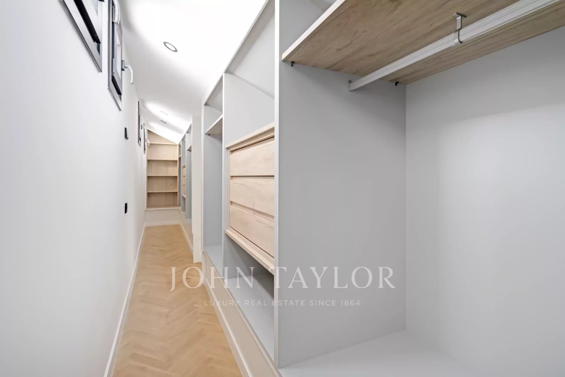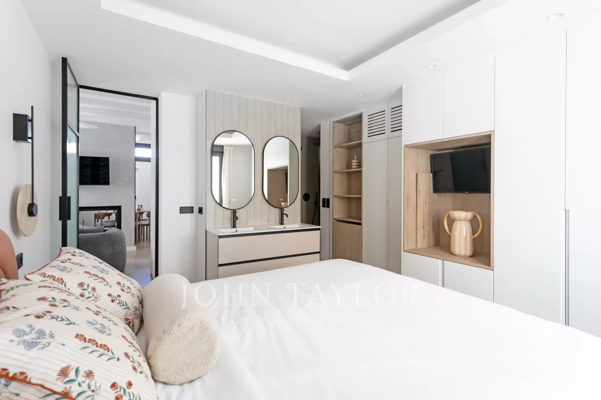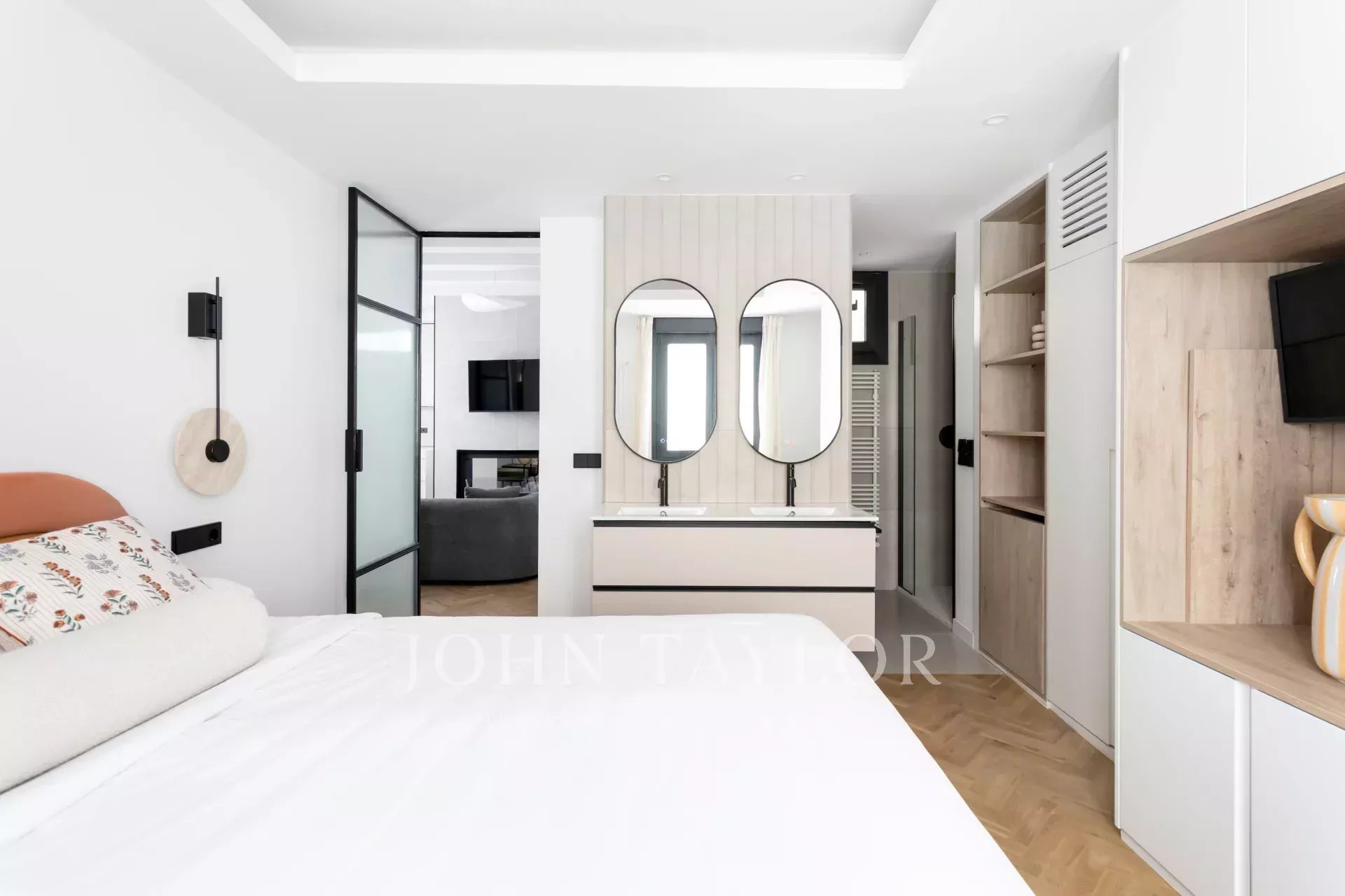 Les deux chambres, dotées de placards et de salles de bains attenantes, sont très spacieuses et bénéficient d'une lumière naturelle abondante. La chambre principale dispose d'un dressing à l'étage supérieur.