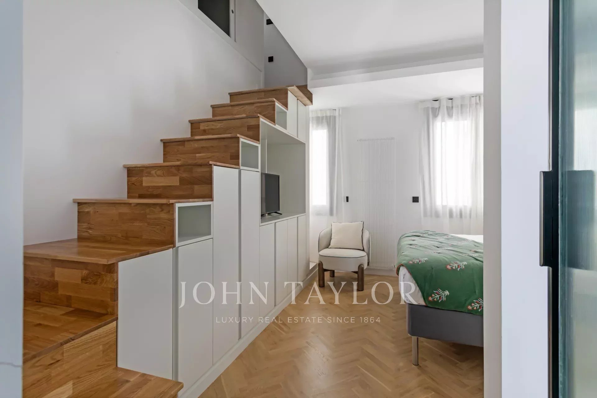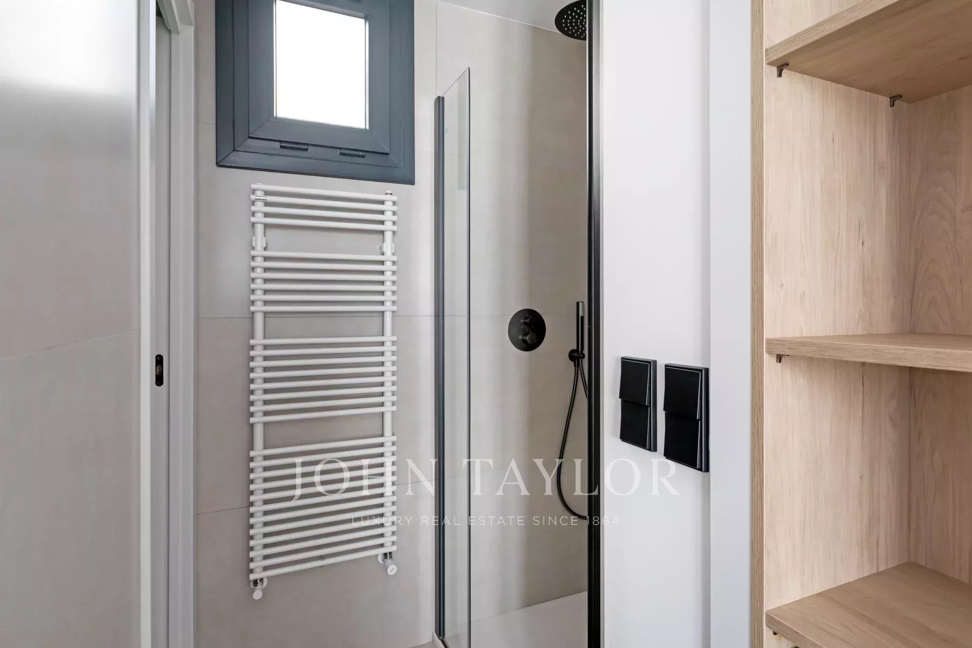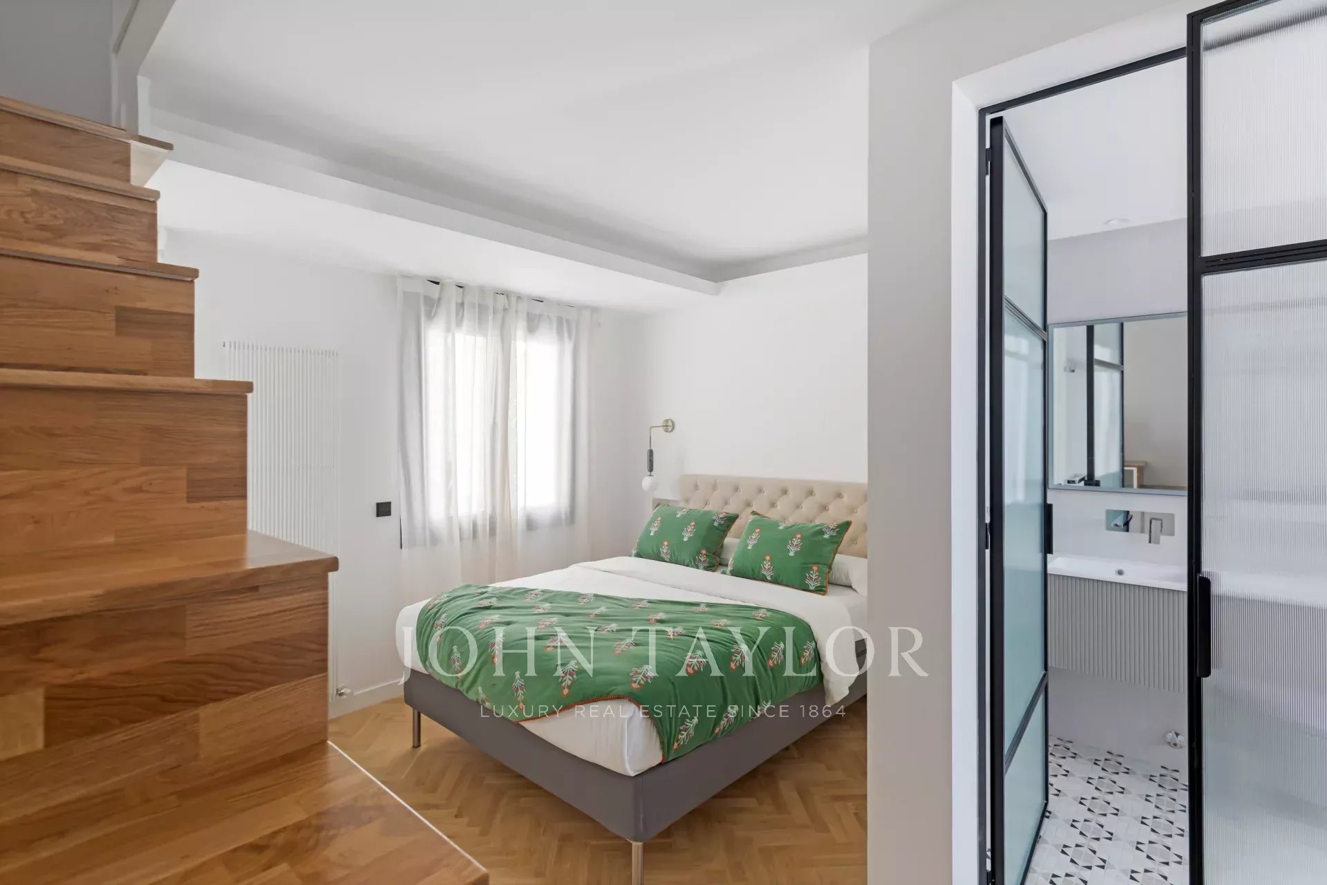 Les deux chambres, dotées de placards et de salles de bains attenantes, sont très spacieuses et bénéficient d'une lumière naturelle abondante. La chambre principale dispose d'un dressing à l'étage supérieur.
