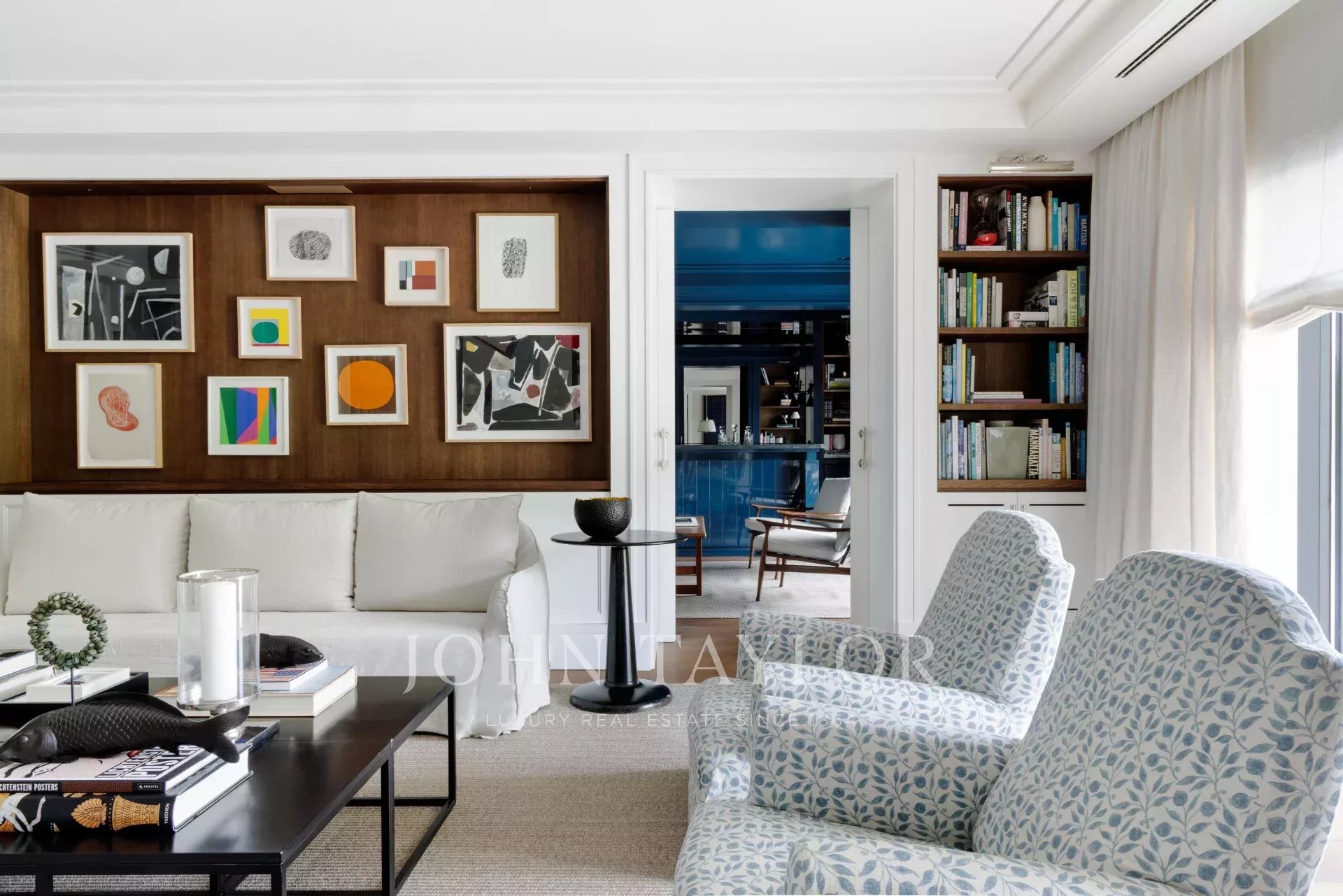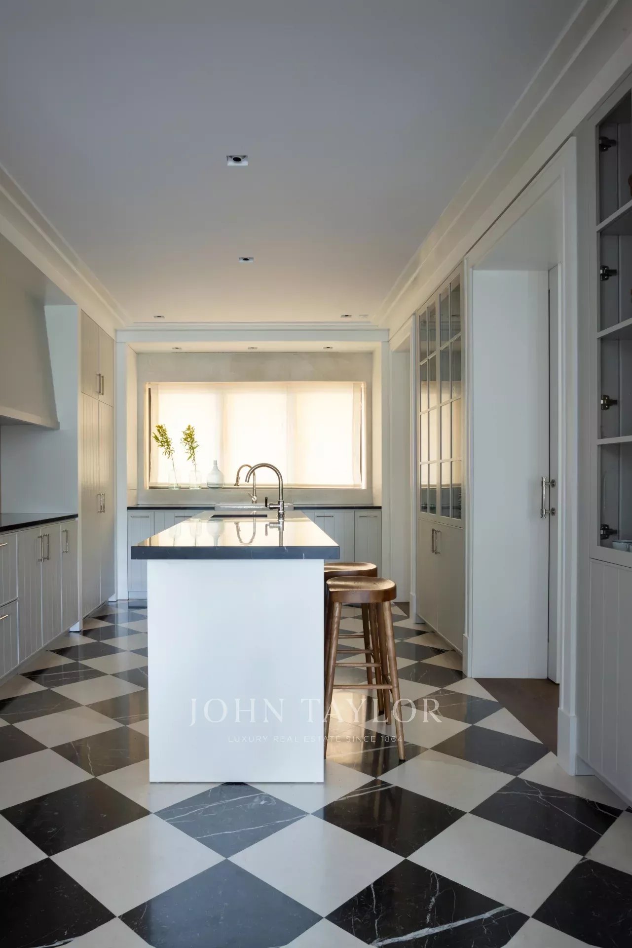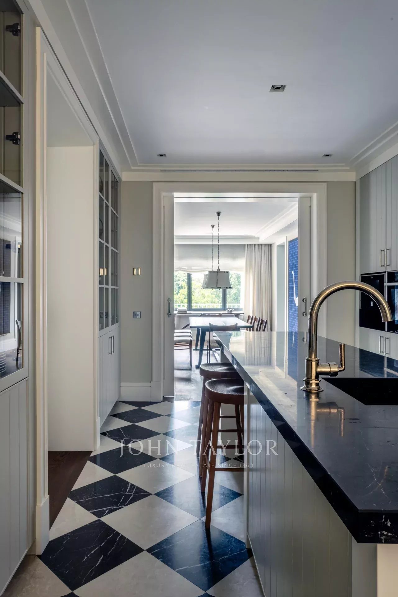 Chaque pièce a été réalisée avec une précision exceptionnelle. Les parquets en noyer à rainures et languettes, l'harmonie graphique du marbre 12x12 noir et blanc et la cuisine conçue comme une pièce sculpturale - marbre Marquina, îlot central et équipement GAGGENAU - définissent une esthétique raffinée et cohérente.