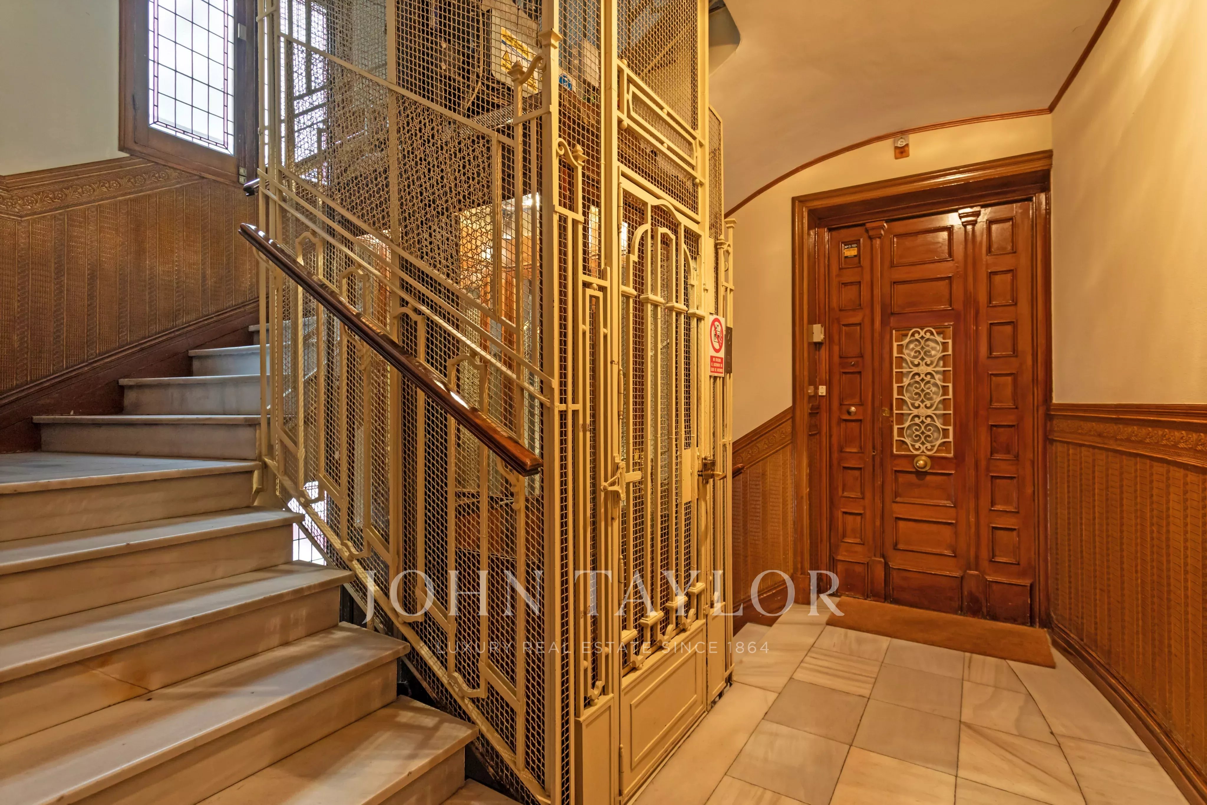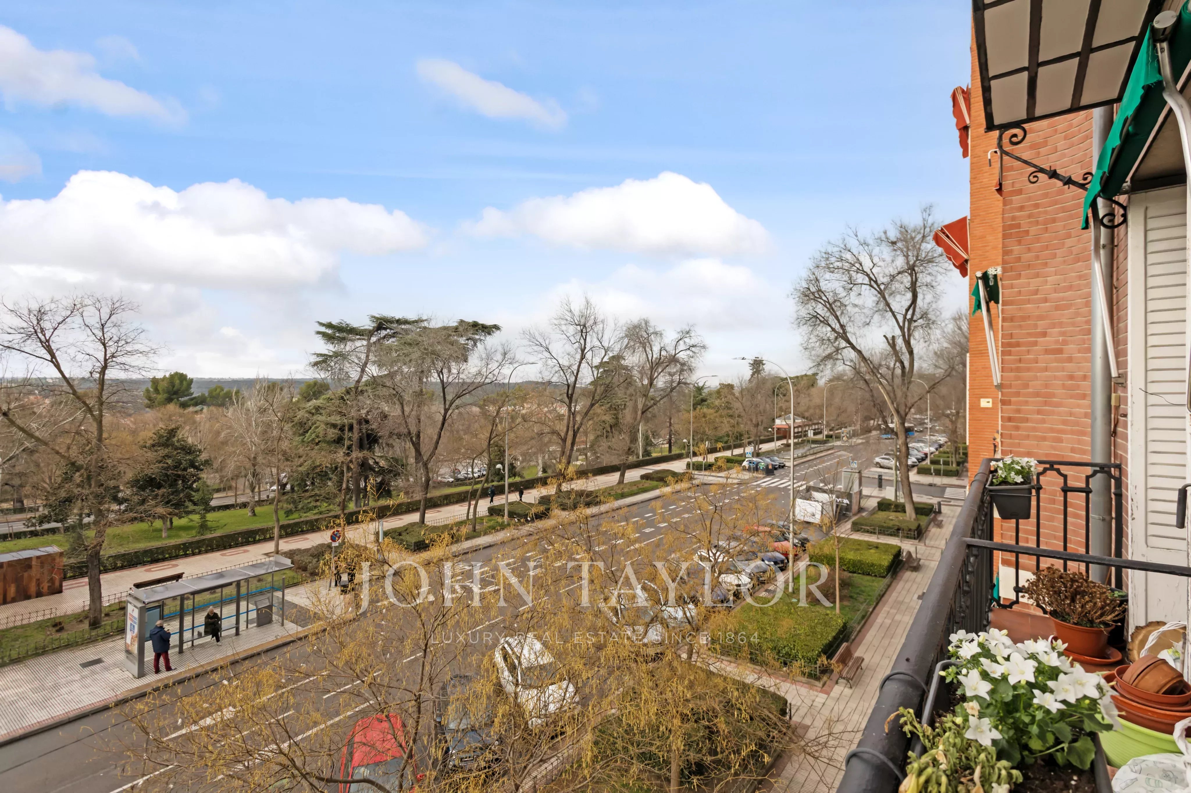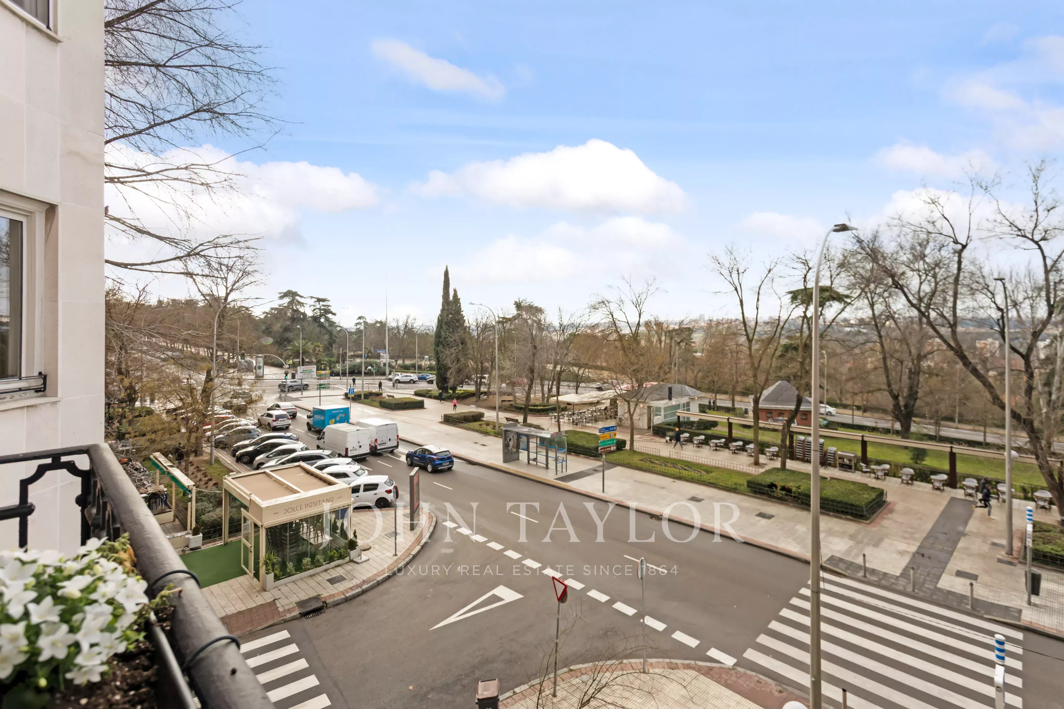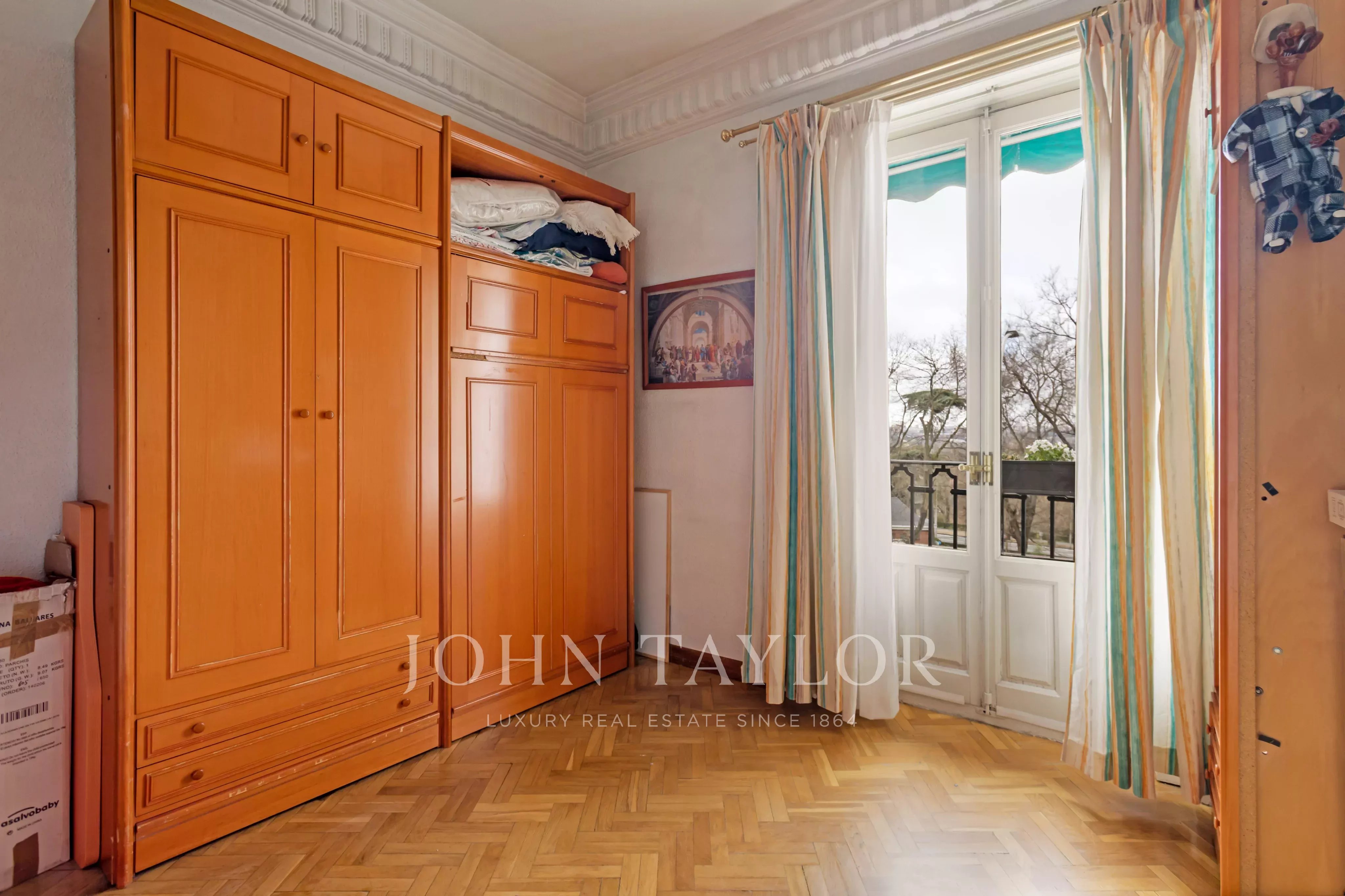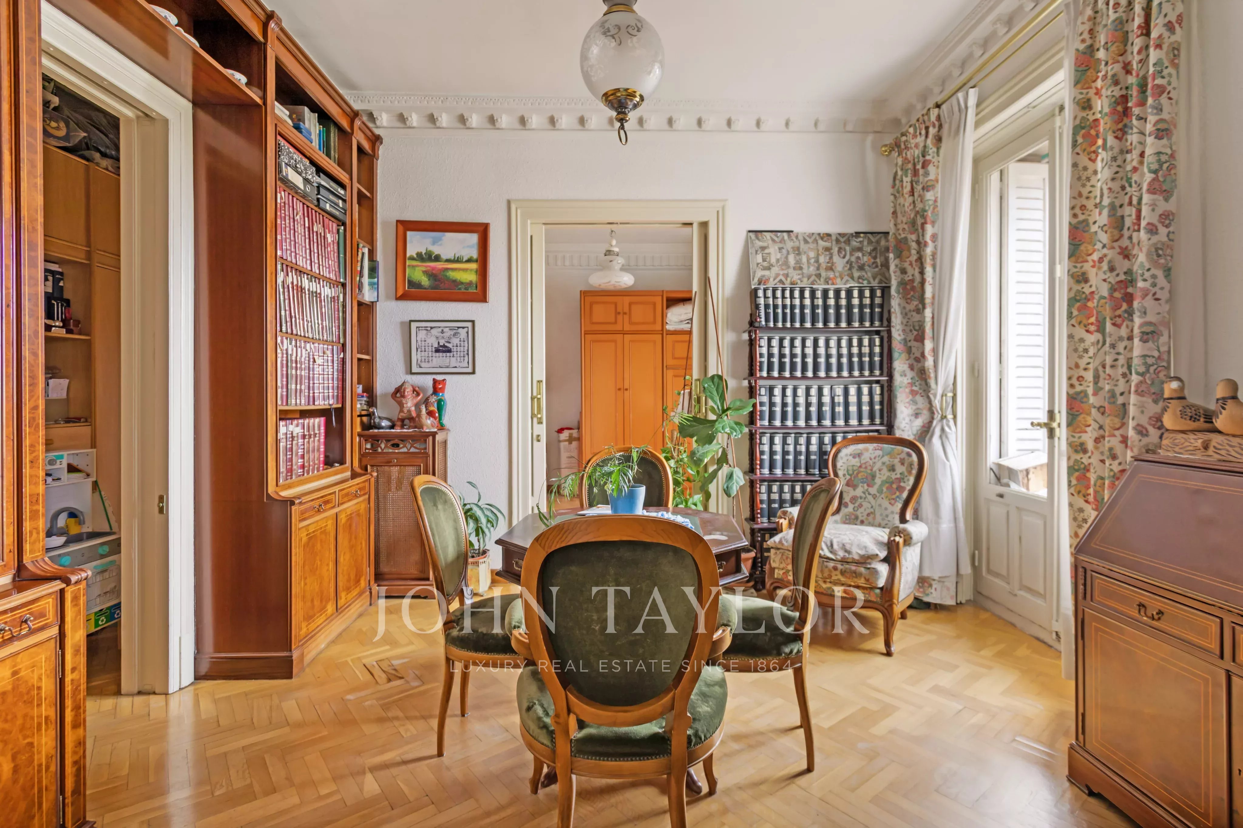 La propriété se distingue par son caractère majestueux, ses hauts plafonds, ses moulures classiques et son architecture qui évoque l'élégance d'un authentique appartement palatial. Le salon, spacieux et baigné de lumière naturelle, s'ouvre sur d'imposants balcons avec vue directe sur le parc, un espace protégé qui garantit une intimité absolue et des vues inaltérables dans le temps.