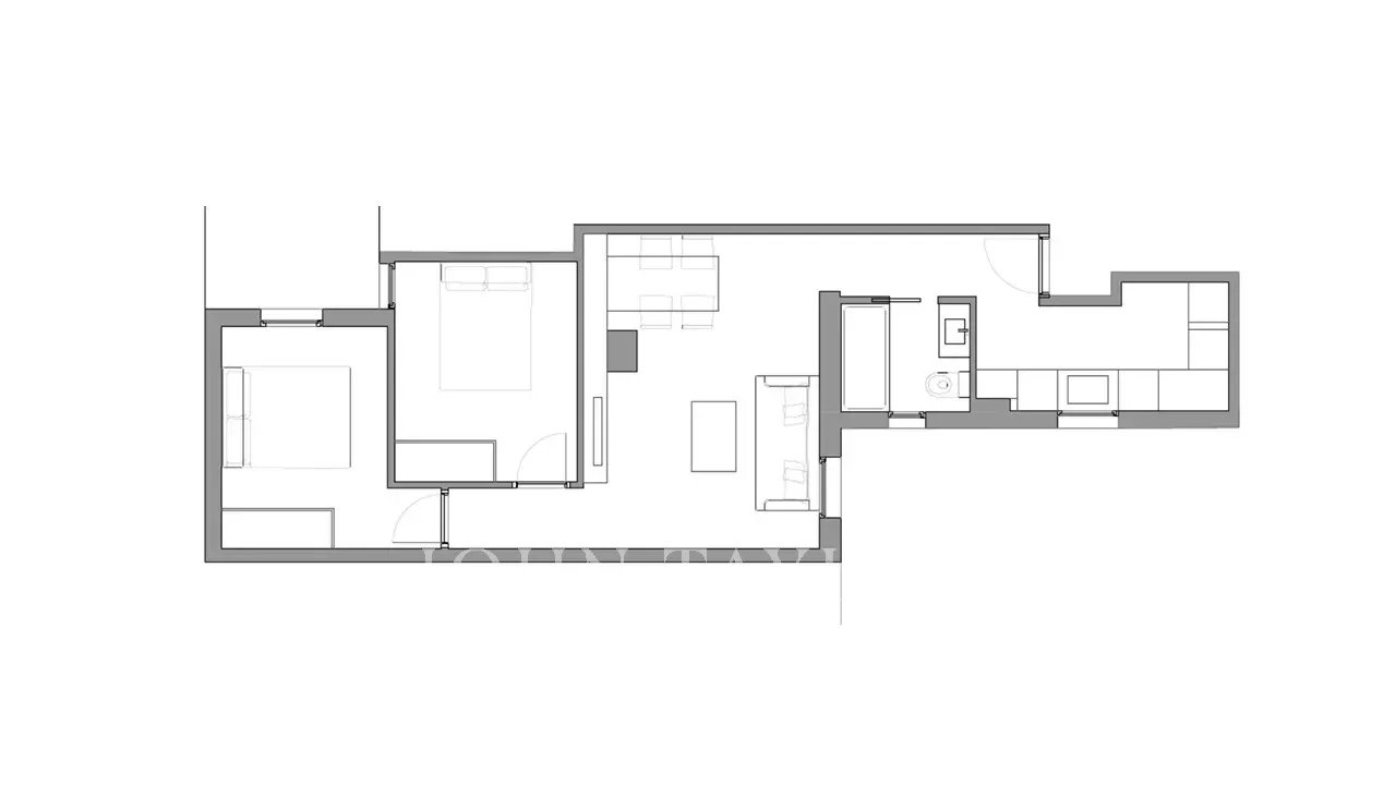 La zone sociale est un espace ouvert avec un salon, une salle à manger et une cuisine entièrement équipée. Il y a deux chambres doubles et une salle de bain.