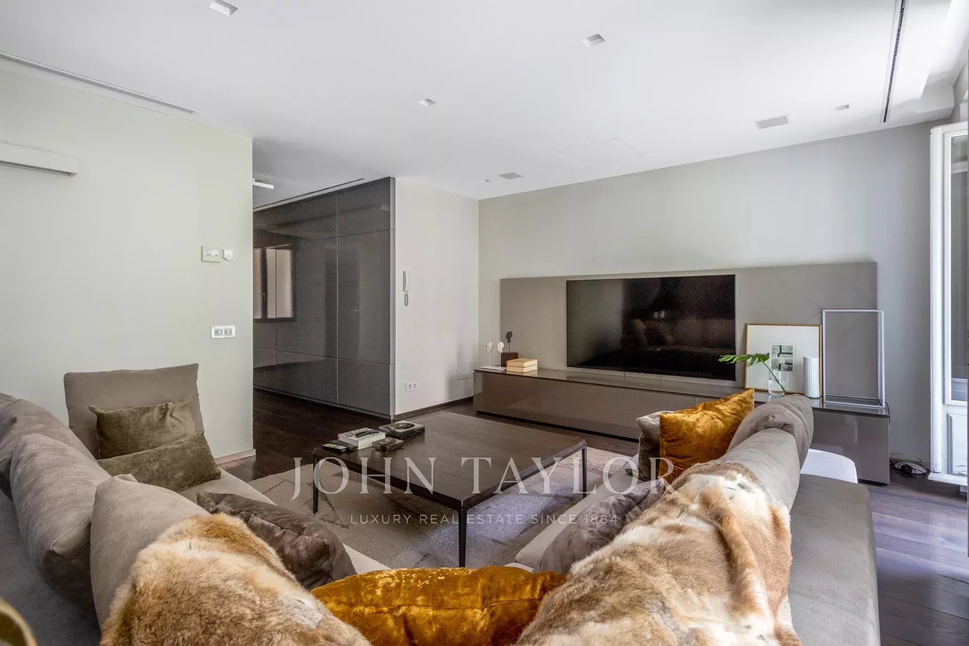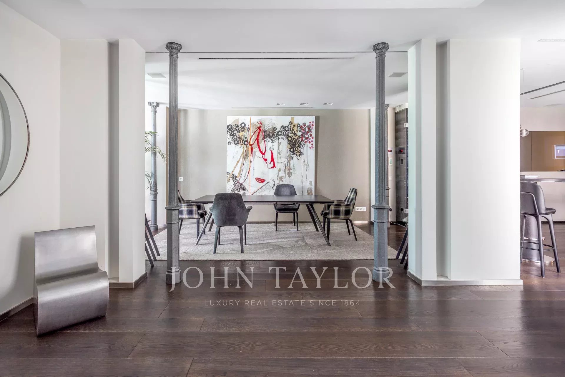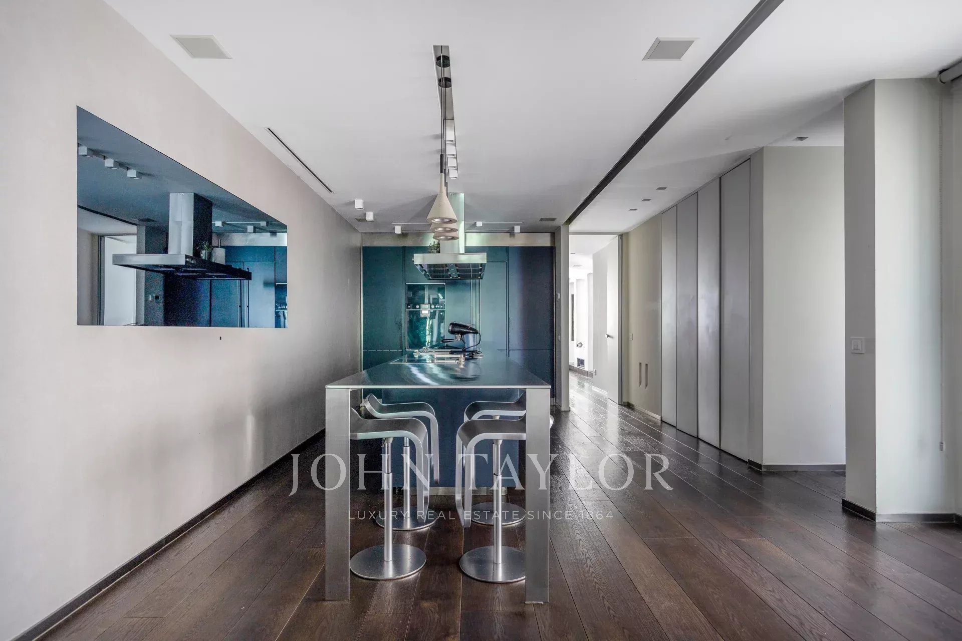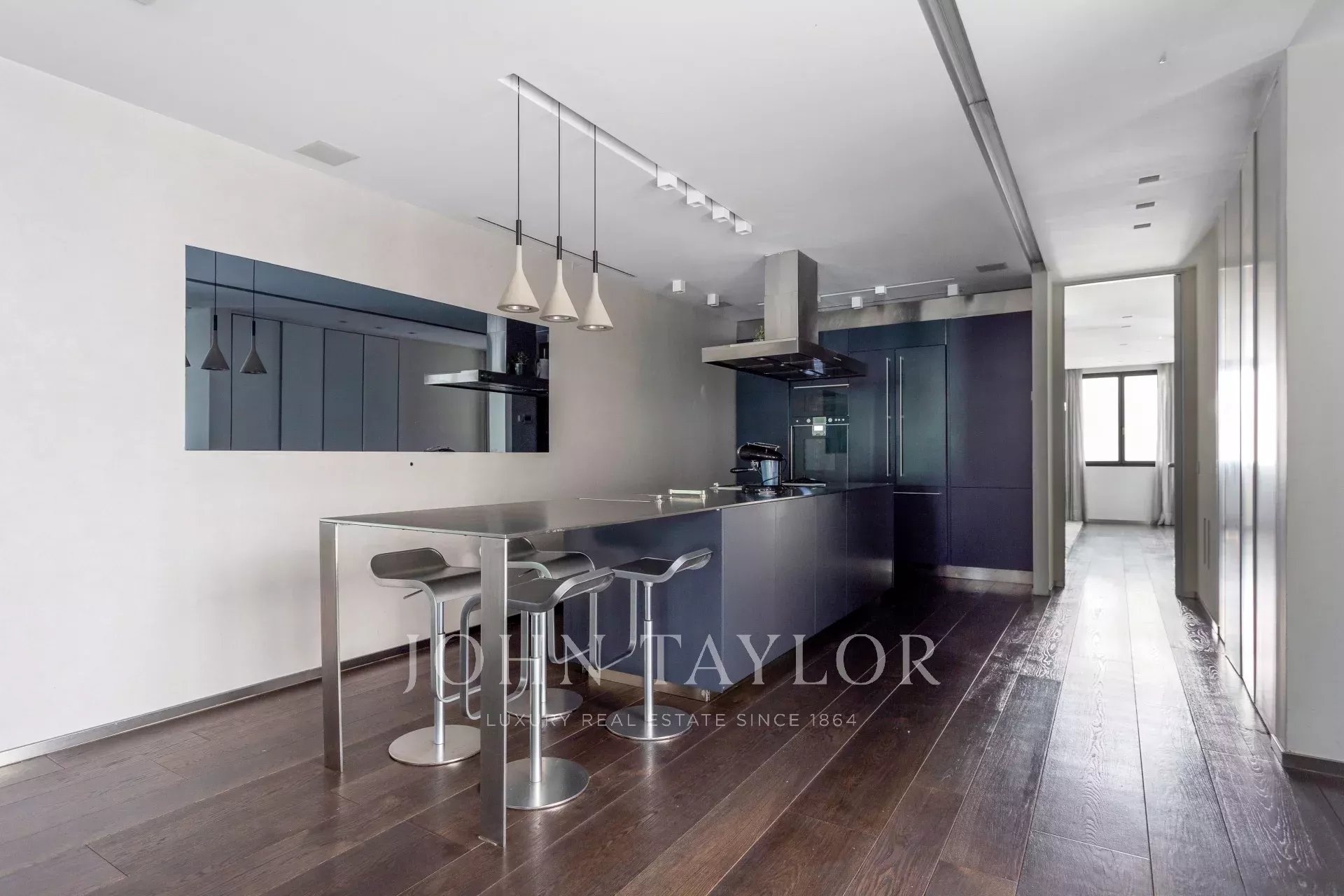 L'appartement dispose d'un espace social ouvert comprenant un salon avec deux balcons et un point de vue sur la rue, une grande salle à manger, des toilettes pour les invités et une cuisine moderne Gaggenau entièrement équipée des meilleurs appareils électroménagers.