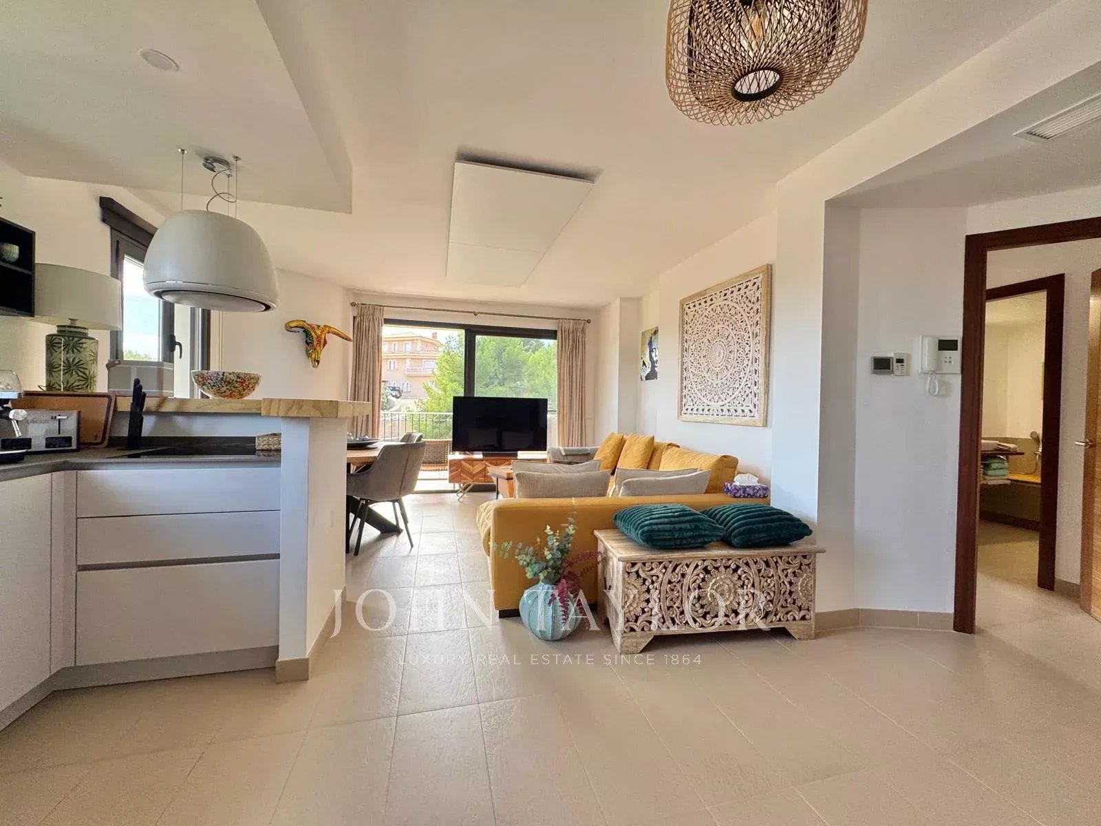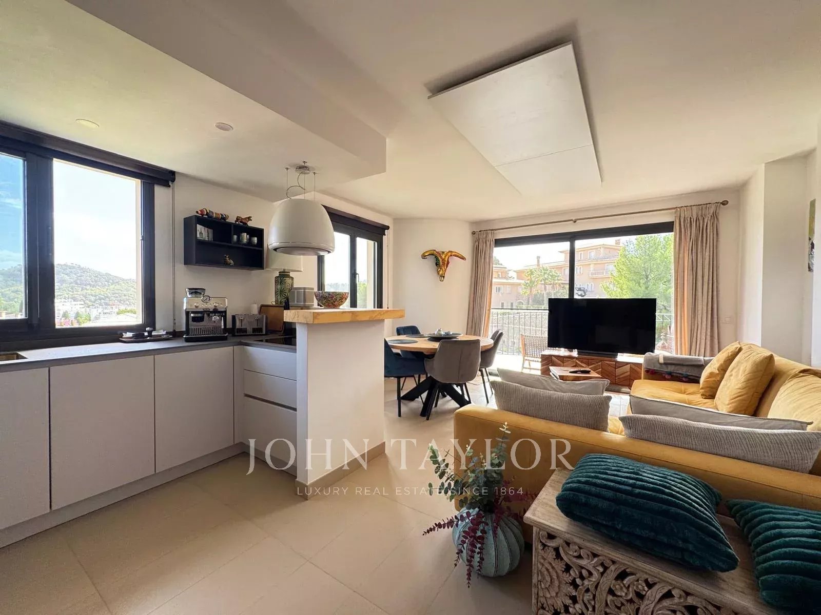 Au dernier étage d'un élégant immeuble avec ascenseur se trouve ce spectaculaire penthouse, véritable havre de paix et de style dans l'un des coins les plus recherchés du sud-ouest de Majorque. Dès le premier instant, le confort est garanti grâce aux deux places de parking privées situées juste devant la porte d'entrée, sous un porche pratique. Dès l'entrée, la maison surprend par sa luminosité et son agencement soigné. La spacieuse chambre principale offre une salle de bains en suite et des vues dégagées qui invitent à la rêverie, créant une atmosphère de détente absolue. À l'autre bout de l'appartement, il y a une deuxième chambre double, idéale pour les invités ou les membres de la famille, qui garantit l'intimité et le confort. Il y a également une troisième pièce qui peut être utilisée comme chambre simple, bureau ou pièce polyvalente, accompagnée d'une deuxième salle de bains avec douche. La cuisine ouverte se distingue par son design moderne et fonctionnel, équipée d'appareils haut de gamme et d'un élégant plan de travail en pierre naturelle. Elle s'intègre parfaitement à l'espace de vie, un salon-salle à manger baigné de lumière naturelle, qui se connecte directement à la terrasse principale et devient le cœur de la maison.