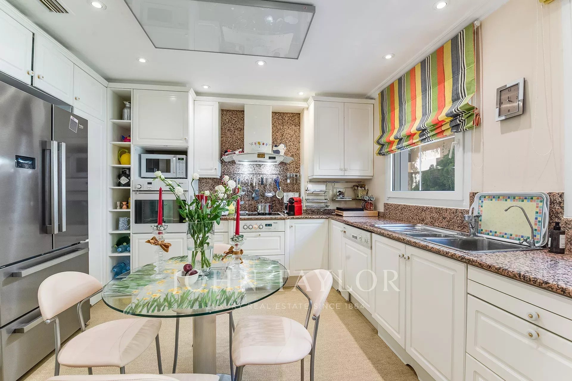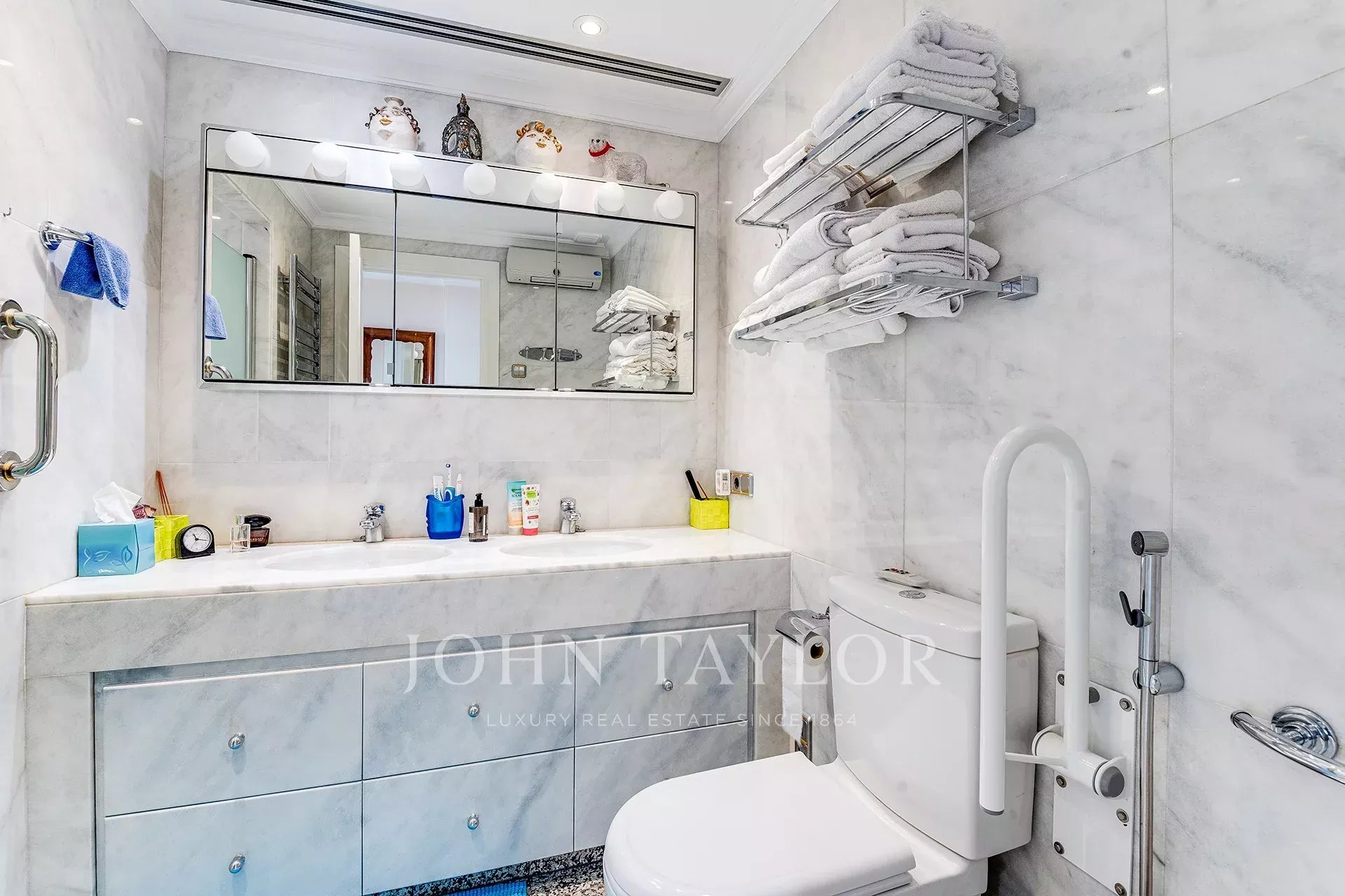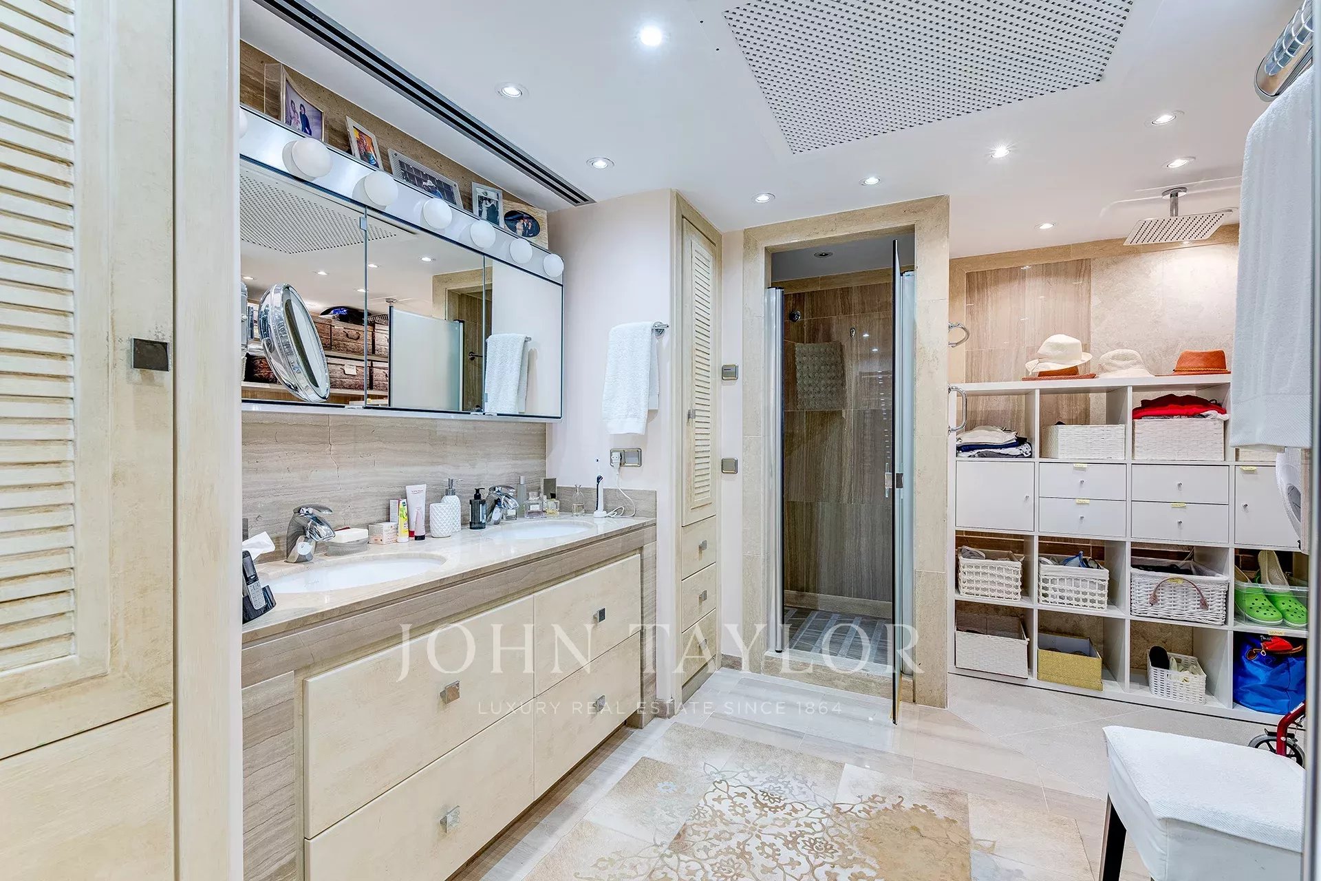 L'appartement spacieux comprend un grand salon avec accès à une terrasse ensoleillée, une cuisine, des toilettes, deux chambres partageant une salle de bains et une grande chambre principale avec dressing et salle de bains en suite.