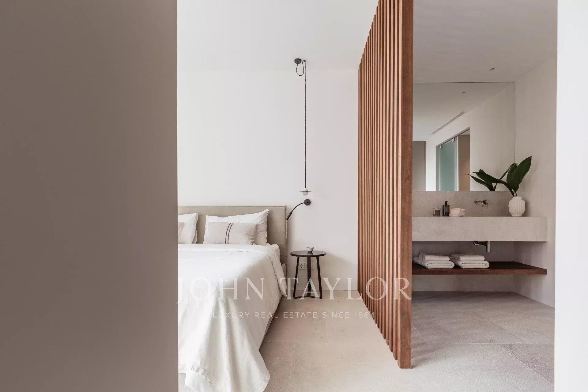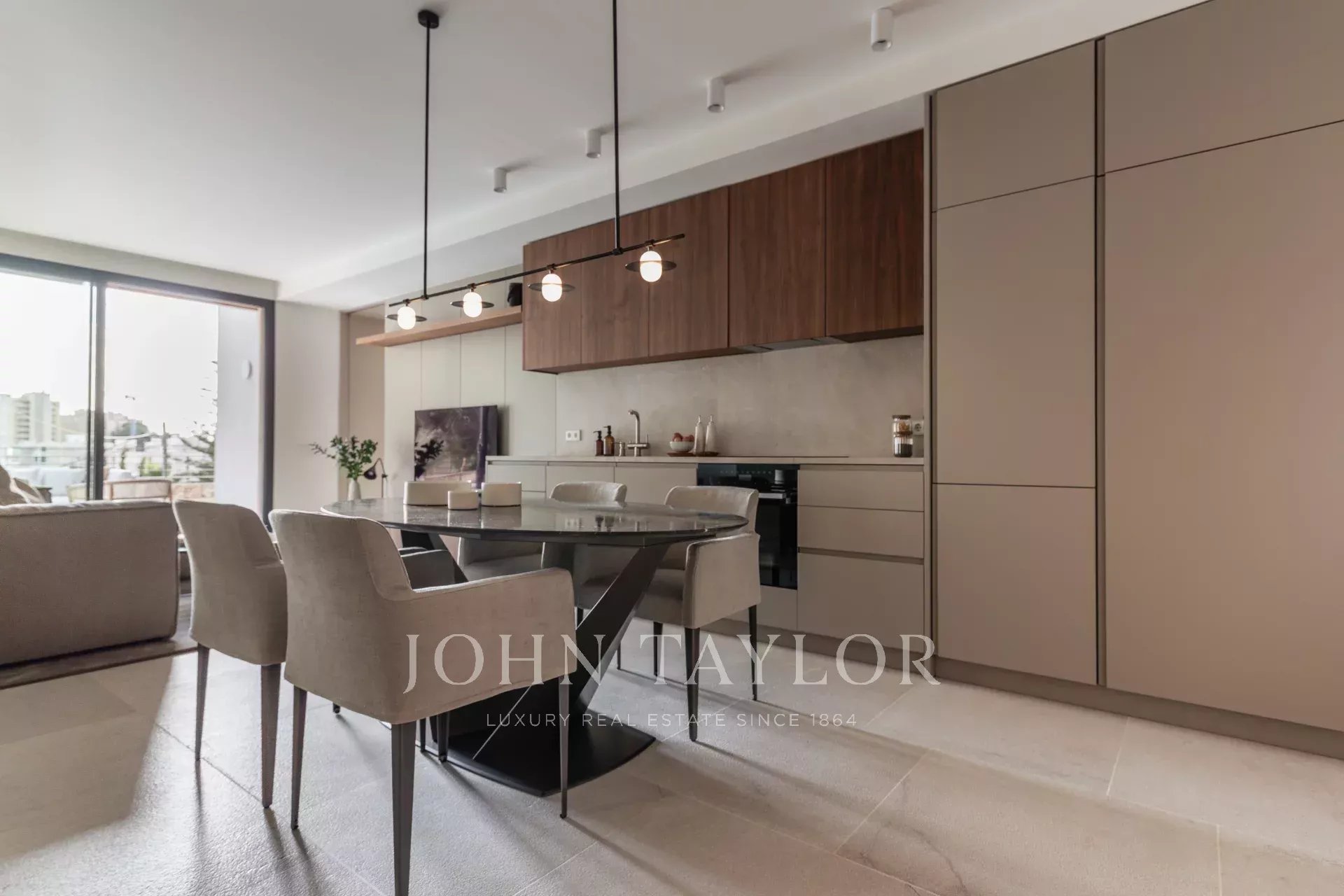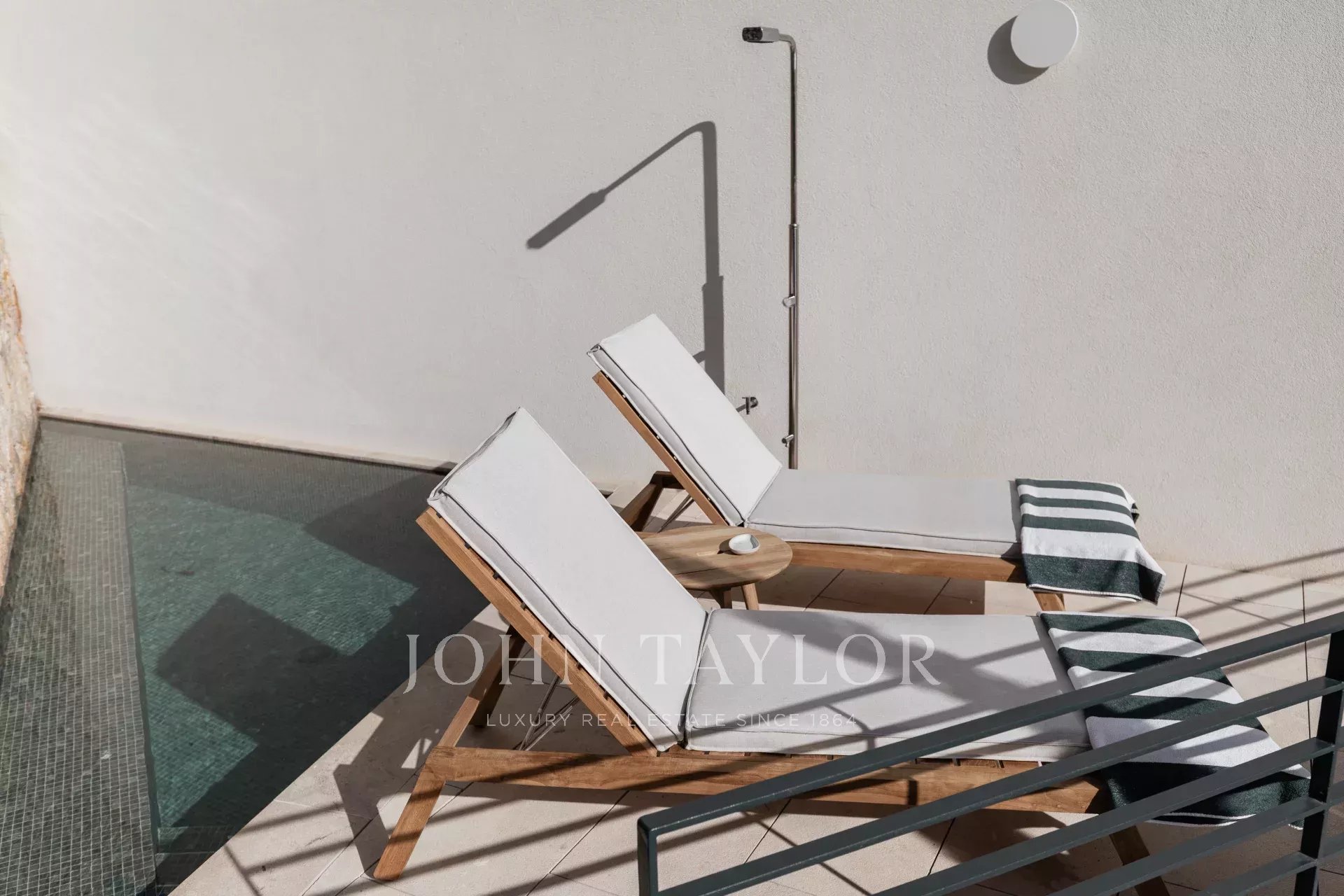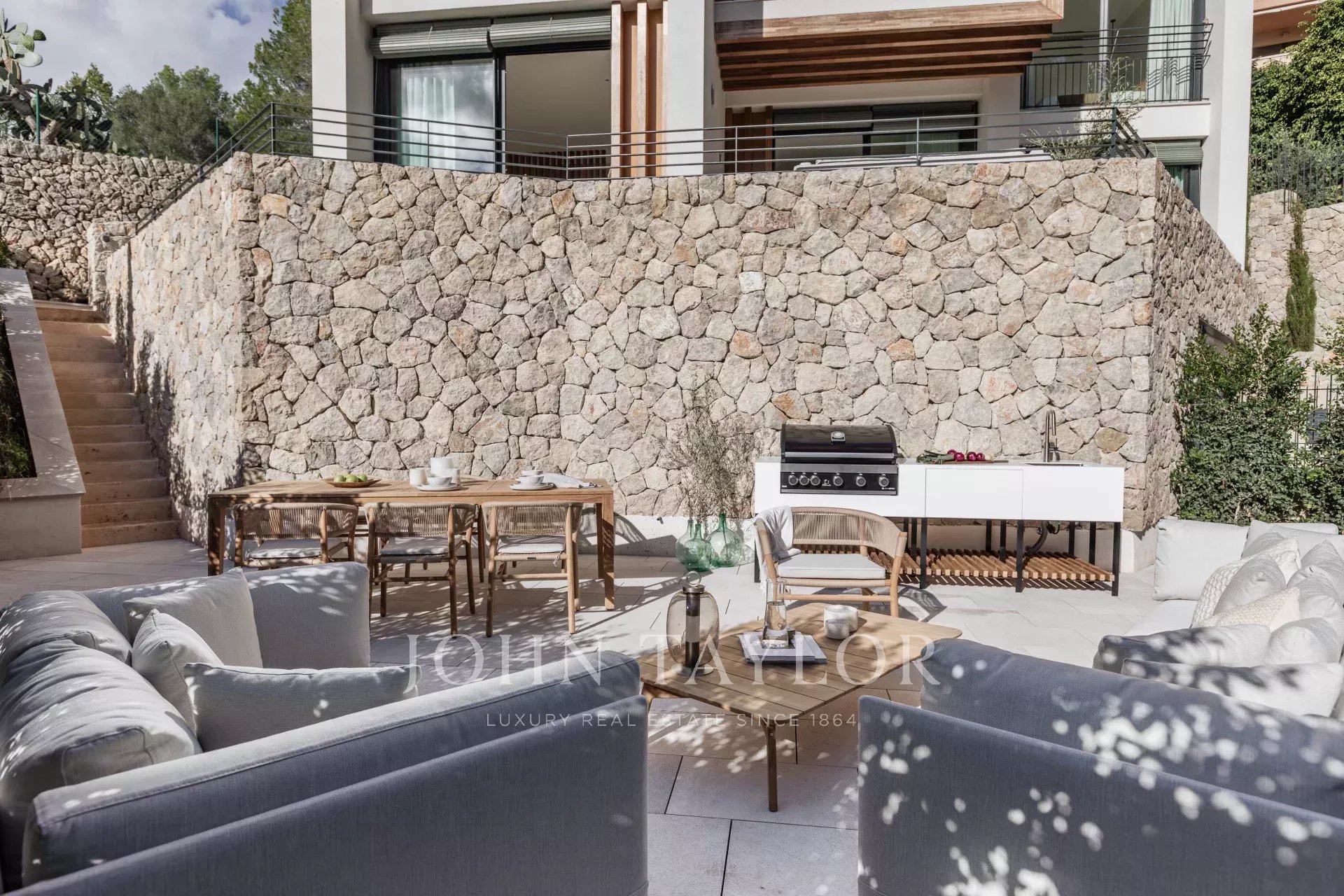 Cet appartement du premier étage comprend une suite parentale avec une salle de bains attenante, une deuxième chambre et une salle de bains, une cuisine ouverte, une salle à manger et un salon avec un accès direct à une spacieuse terrasse privée de 113 m2 et à l'espace piscine, qui mène à un jardin de 50 m2. La propriété est complétée par une buanderie privée et des installations de stockage.