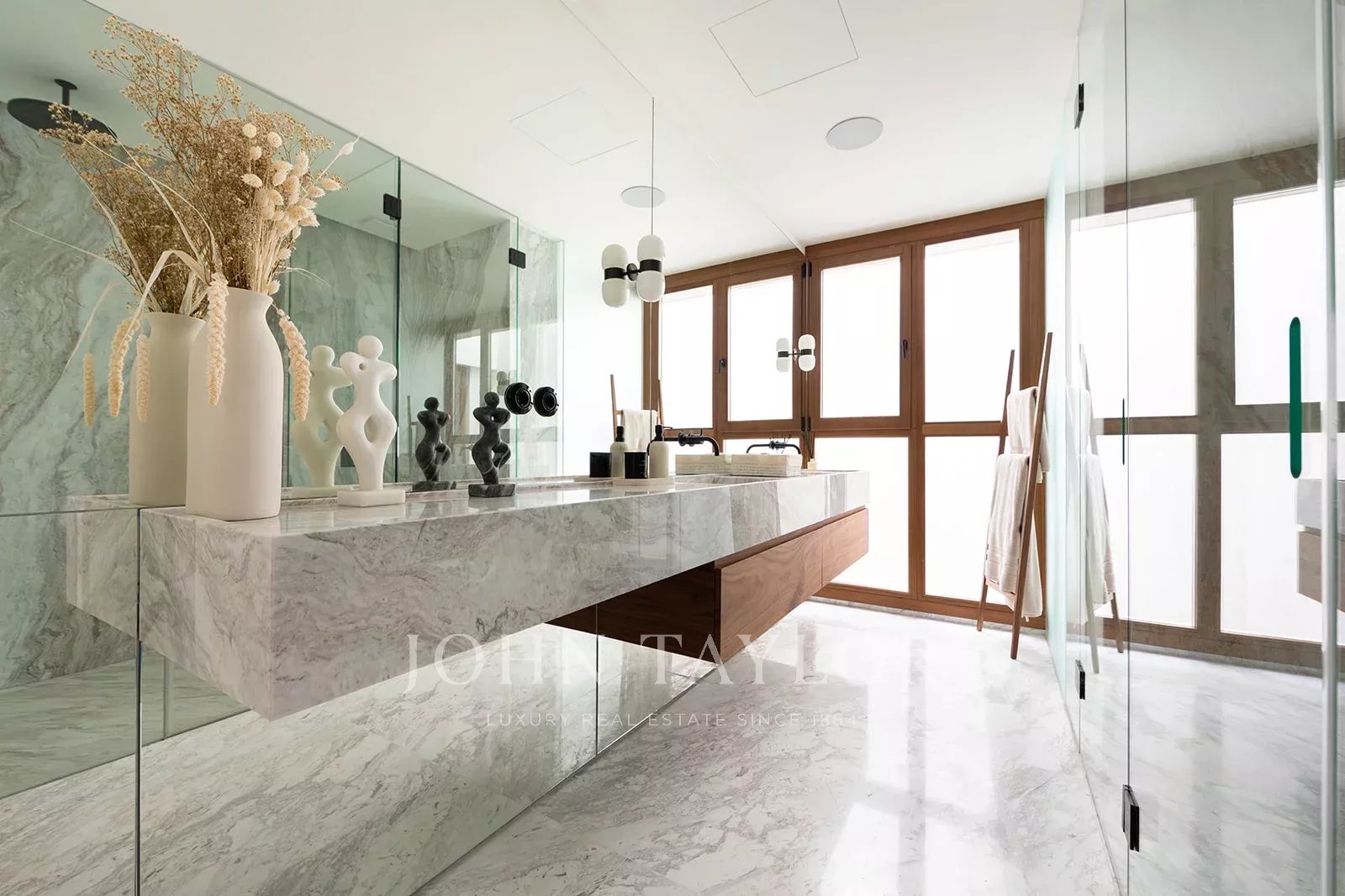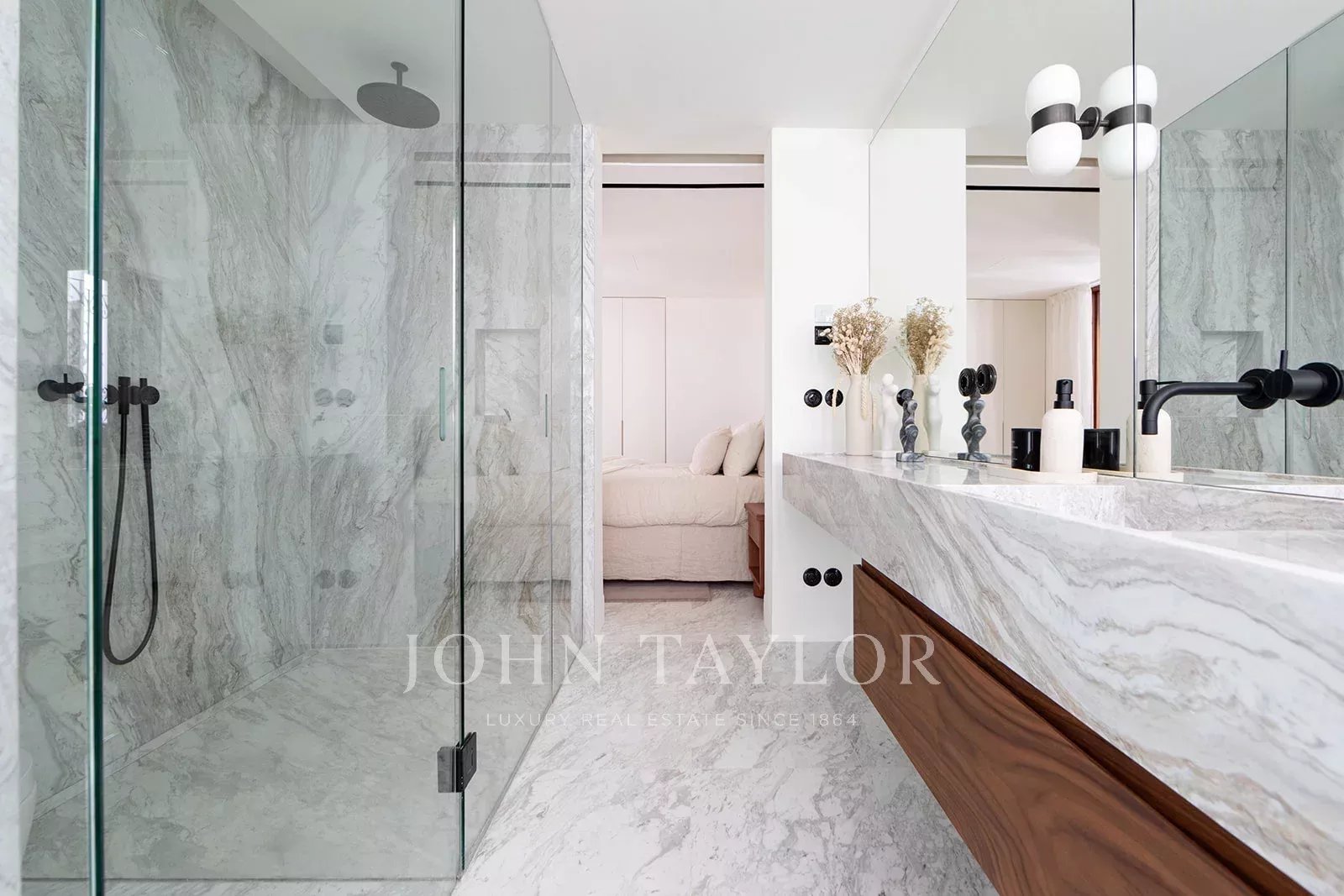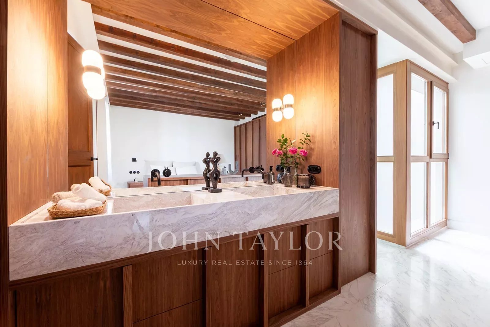 Ce duplex exceptionnel de trois chambres et trois salles de bains est réparti sur les deux derniers étages de l'immeuble et comprend un toit-terrasse sensationnel offrant une vue imprenable sur les toits de la ville. Au niveau inférieur, une grande salle de séjour lumineuse avec des carreaux de sol anciens et des poutres en bois apparentes est située à l'avant du bâtiment, avec deux balcons donnant sur la rue. À l'arrière se trouvent deux chambres spacieuses avec salle de bains attenante. La chambre principale dispose de fenêtres donnant sur le patio central, d'armoires encastrées et de carreaux de Majorque au sol, tandis que la deuxième chambre est dotée de portes vitrées permettant à la lumière de pénétrer depuis le patio. Les deux salles de bains sont luxueusement décorées de marbre Volakas et de bois de noyer, avec des douches à l'italienne et des meubles à double vasque avec évier en marbre intégré. Au niveau supérieur, la cuisine, la salle à manger et le salon s'articulent autour de deux côtés du patio central. Des fenêtres pleine hauteur donnant sur la cour et un puits de lumière à l'arrière baignent cet espace de lumière naturelle. La cuisine épurée, en noyer, avec un îlot en marbre et un évier intégré, est équipée d'appareils électroménagers Gaggenau de première qualité, y compris un réfrigérateur à vin. Ce niveau comprend également une grande troisième chambre avec un plafond mansardé, une salle de douche attenante et une pièce de rangement. Les sols en marbre Volakas, les boiseries et les poutres apparentes s'étendent à tout ce niveau, lui conférant un attrait élégant et intemporel. De là, des escaliers mènent à une terrasse ensoleillée de 76 m2 offrant une vue imprenable sur l'église Santa Eulalia, la cathédrale et le château de Bellver. Répartie sur plusieurs niveaux, c'est un endroit privilégié pour profiter du soleil les jours d'hiver et des chaudes nuits d'été au-dessus de l'agitation de la ville. La propriété est équipée d'un chauffage par le sol et d'une climatisation centrale.