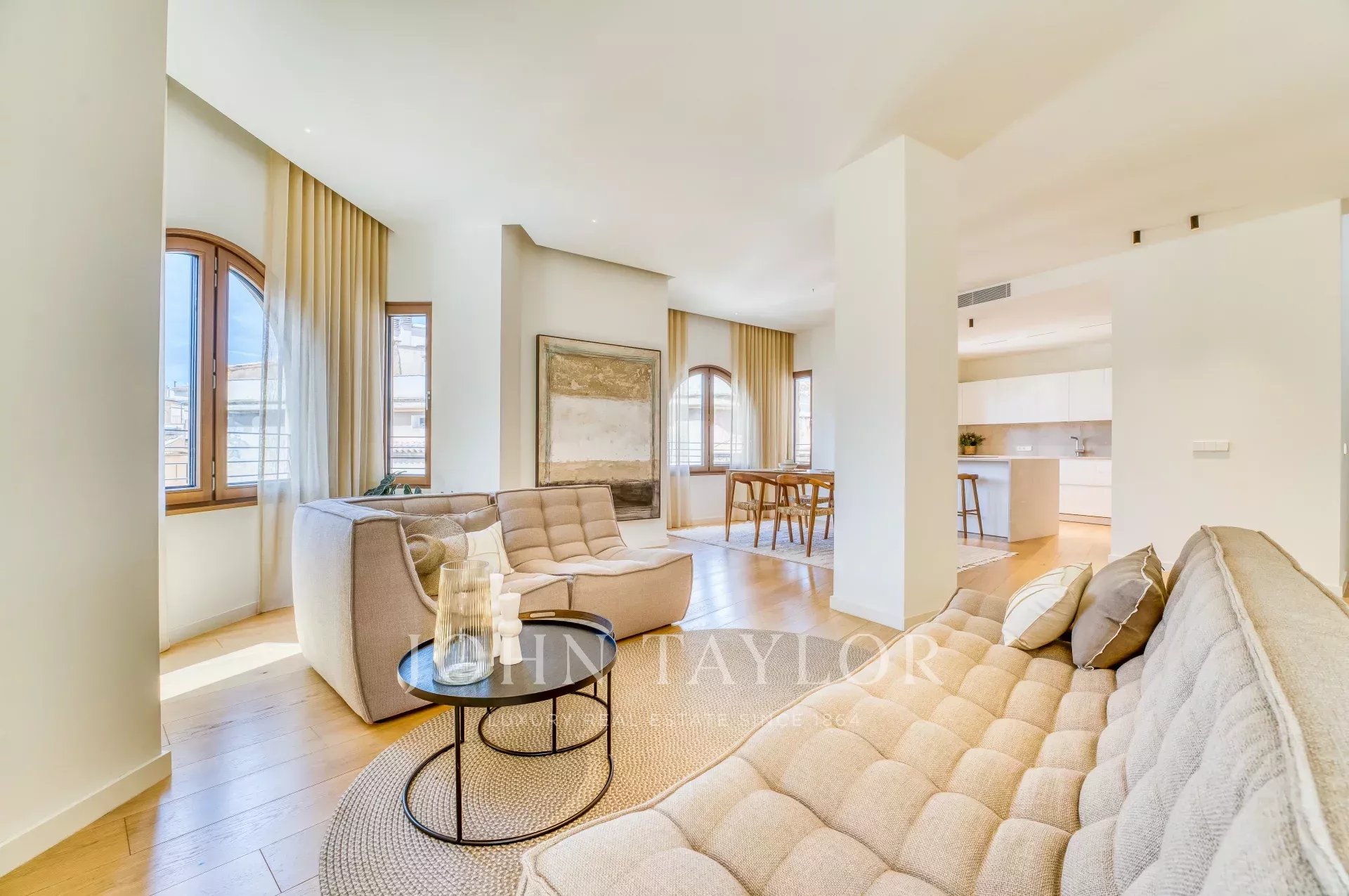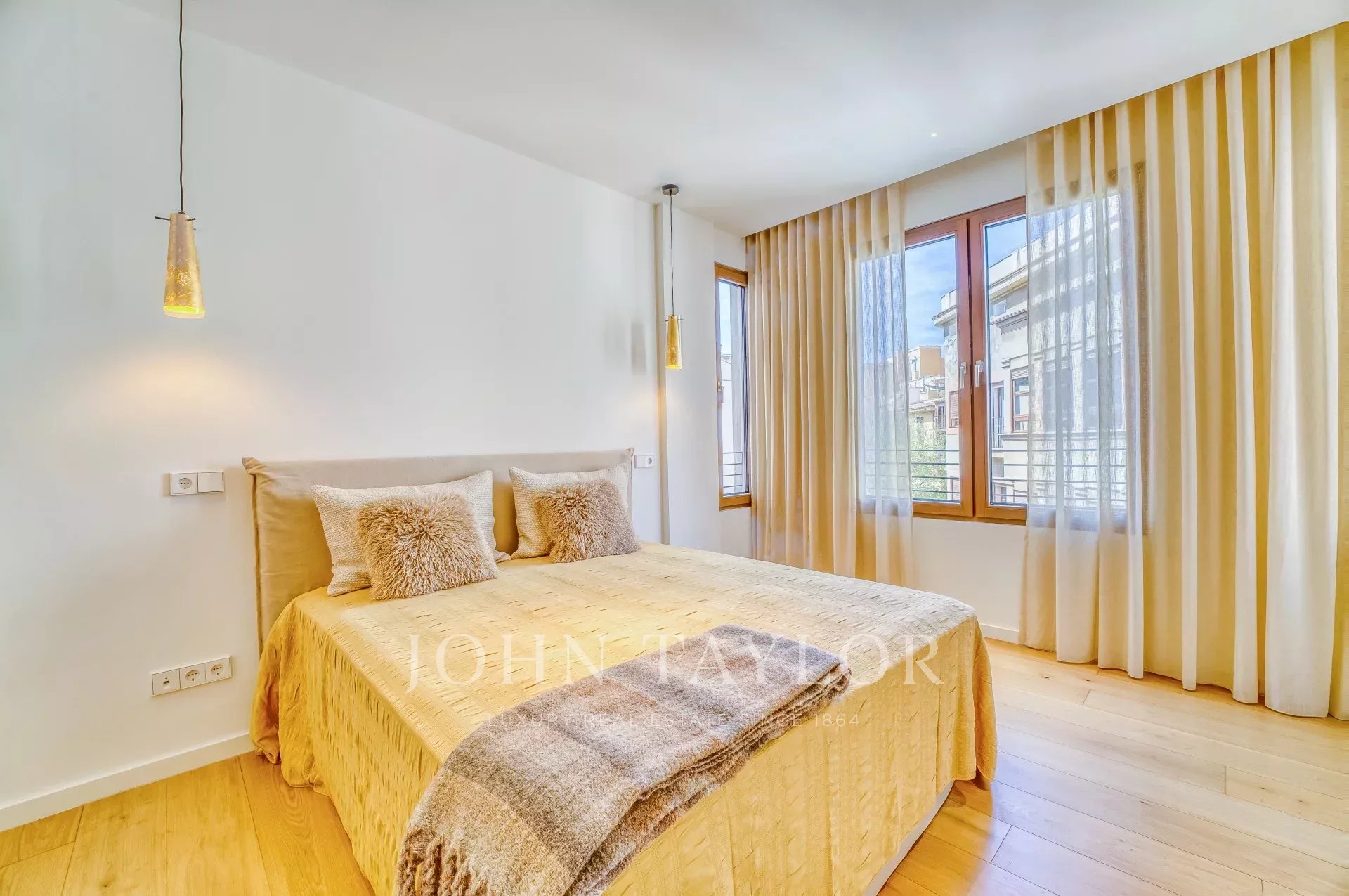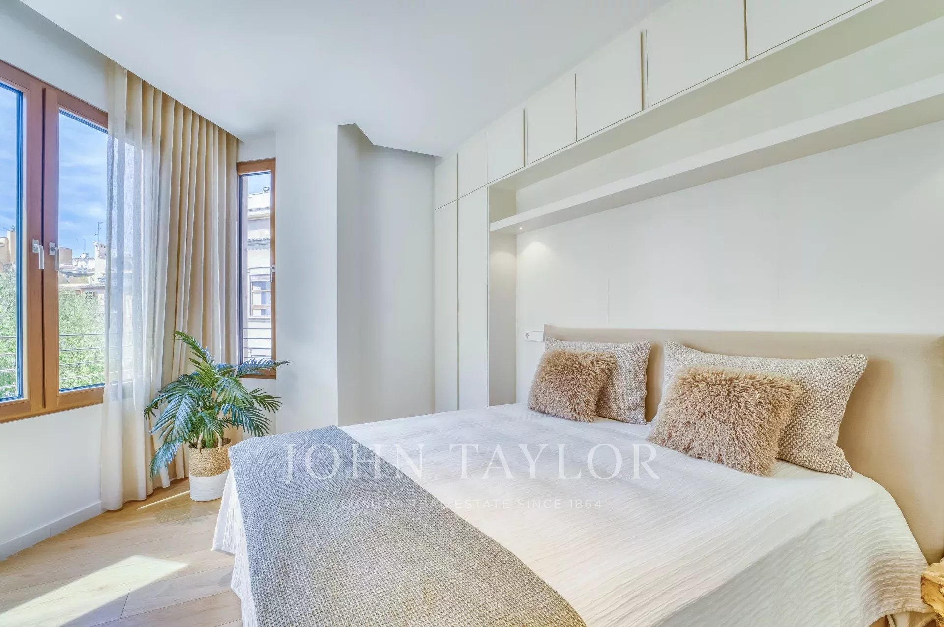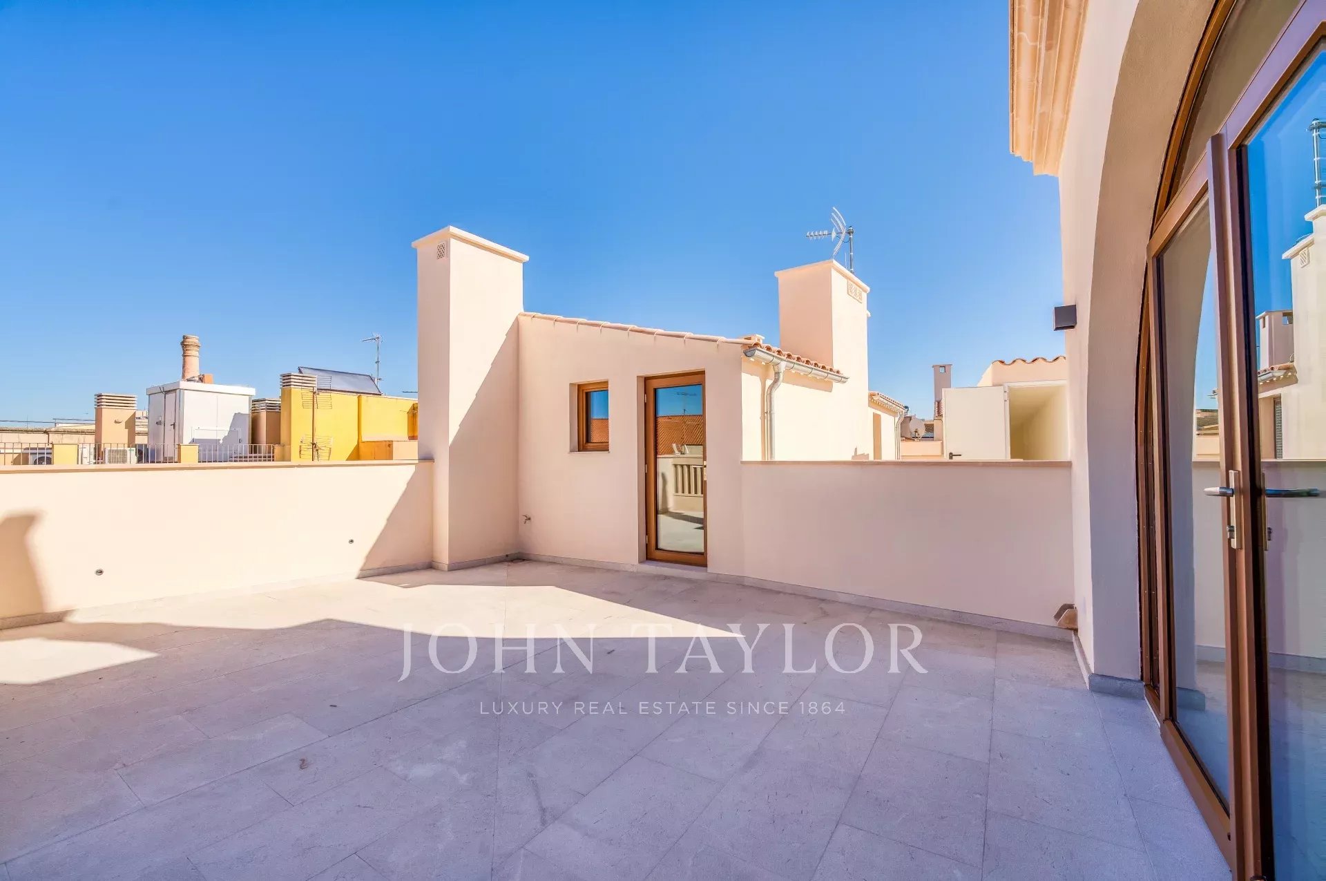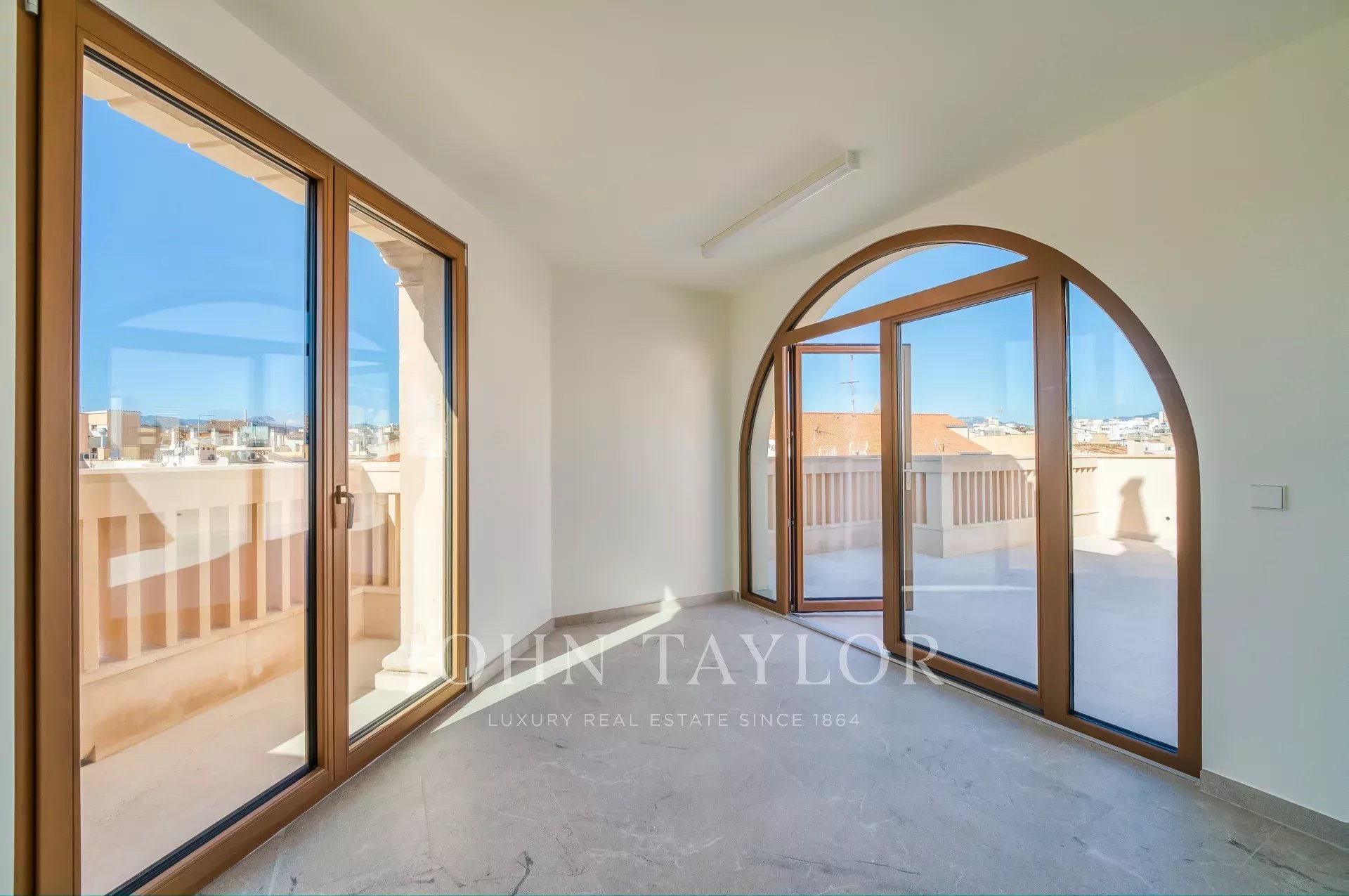 Situé sur une place tranquille au cœur de la vieille ville de Palma, ce luxueux penthouse en duplex comprend deux chambres à coucher, trois salles de bains (deux en-suite, une salle de bains pour les invités), une buanderie ainsi qu'une terrasse sur le toit unique en son genre. Tandis que le niveau d'entrée offre un vaste plan ouvert pour la cuisine, la salle à manger et le salon, les chambres à coucher créent une intimité tranquille au niveau inférieur. Les grandes fenêtres personnalisées, le parquet et les tons chauds de l'intérieur assurent un environnement confortable dans toutes les pièces. L'un des points forts de la propriété est la terrasse privée sur le toit avec une tour spectaculaire, qui est accessible directement par l'appartement. De là, vous pourrez profiter de vues panoramiques sur la vieille ville et la mer. Pour votre confort, l'ensemble du penthouse est équipé d'un chauffage au sol, de la climatisation et de la domotique. Si nécessaire, un garage situé dans le même bâtiment peut être acheté en supplément.