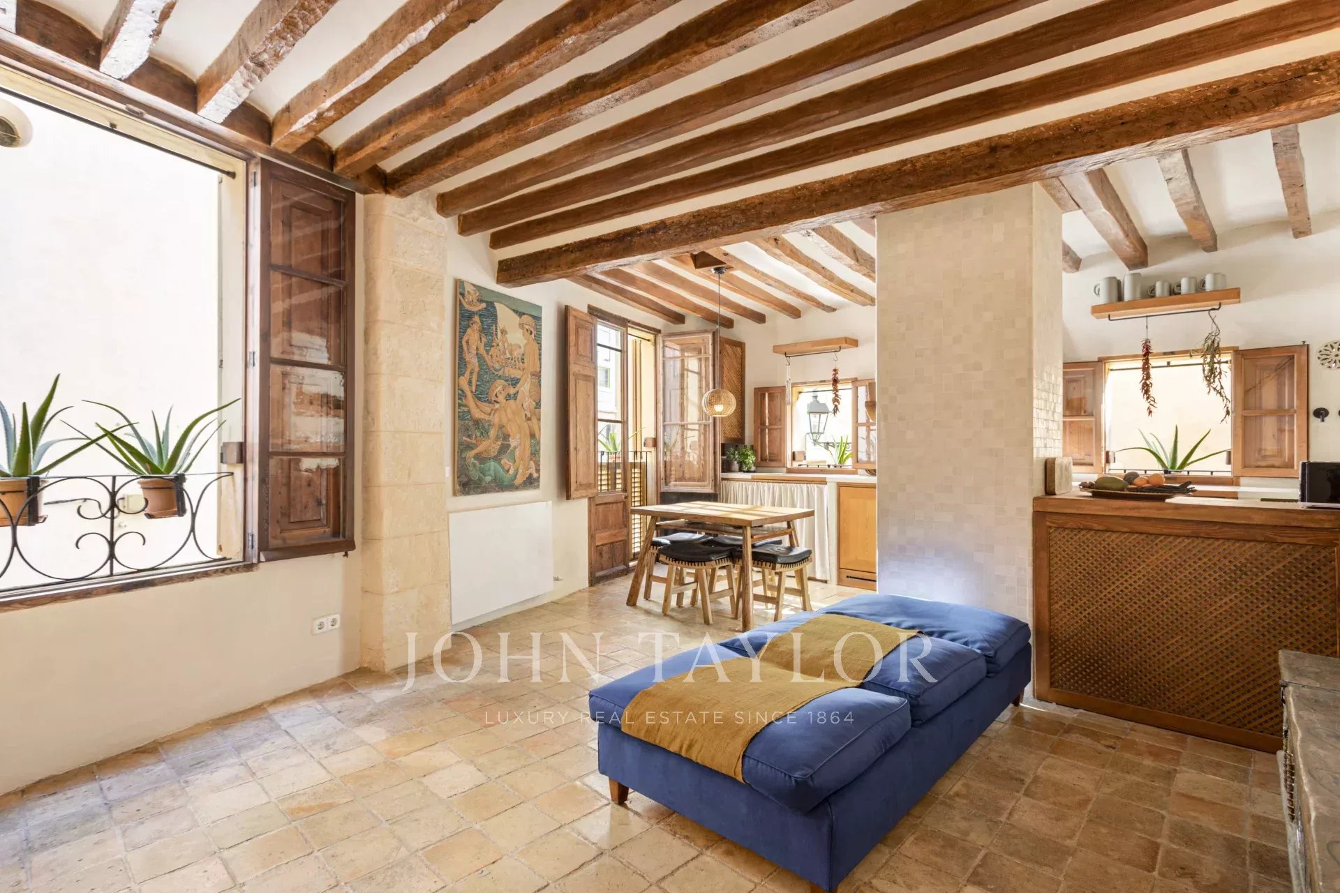 Située au cœur de la vieille ville de Palma, dans le quartier historique de La Calatrava, cette propriété, rénovée en 2024, allie le charme du XIIIe siècle au confort moderne. À quelques pas de la cathédrale de Palma et des jardins des évêques, cette maison est répartie sur trois étages et un sous-sol, offrant polyvalence et style pour la vie urbaine. La propriété dispose de deux entrées et le rez-de-chaussée peut être utilisé comme bureau ou chambre d'amis avec une salle de bains. Le premier étage comprend une cuisine confortable ouverte sur le salon, tandis que le deuxième étage abrite une chambre principale avec une salle de bains attenante. Le sous-sol offre un espace supplémentaire pour la buanderie et le stockage, ce qui garantit une commodité au quotidien. Avec des sols en terre cuite et des poutres en bois, dont certaines proviennent de la cathédrale de Palma, cette propriété allie tradition majorquine et modernité, avec un chauffage central au gaz, l'air conditionné et un ascenseur domestique/alimentaire. Sa situation privilégiée vous permet de profiter de l'atmosphère animée du centre de Palma, avec un accès facile aux sites culturels, aux cafés et aux boutiques exclusives.