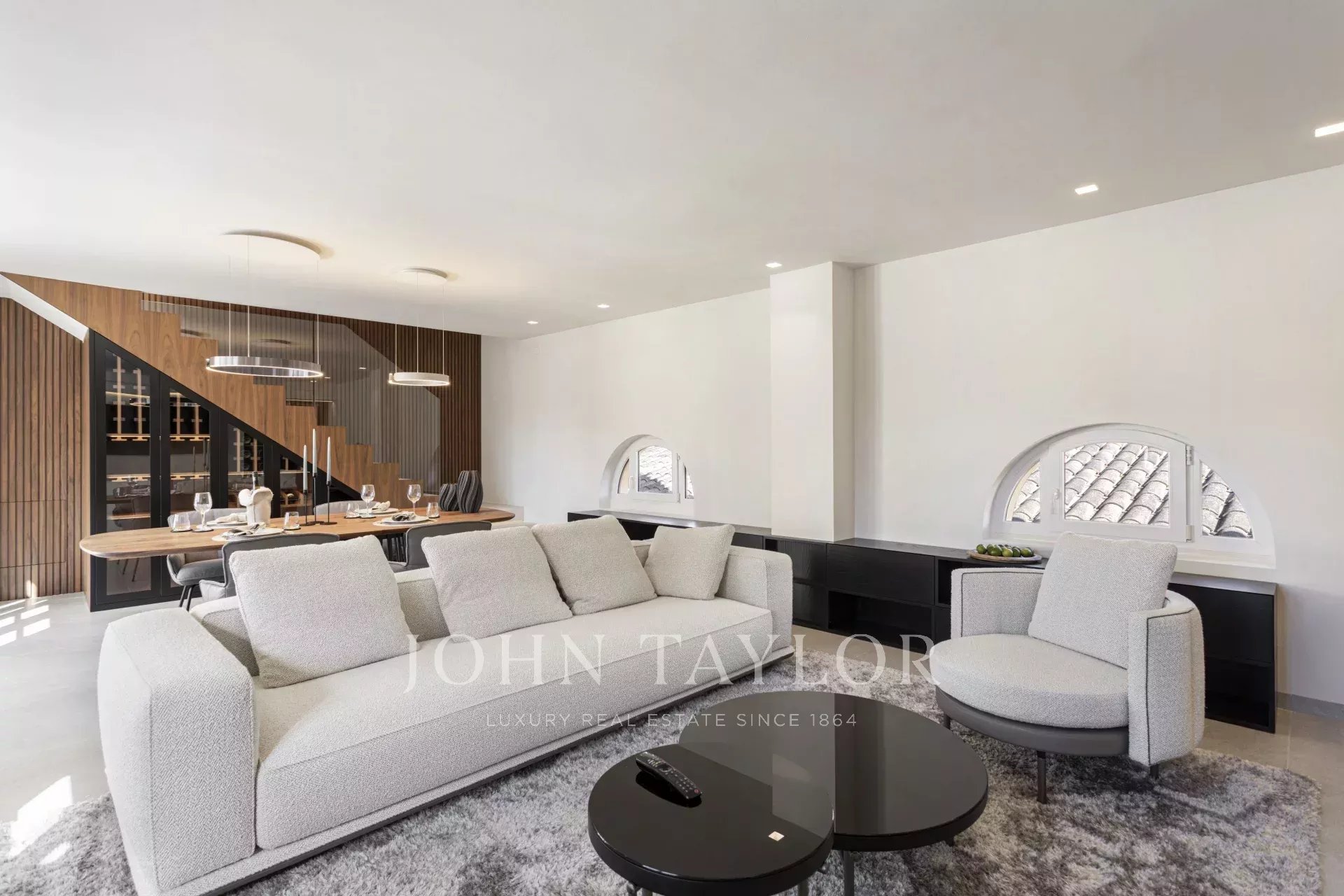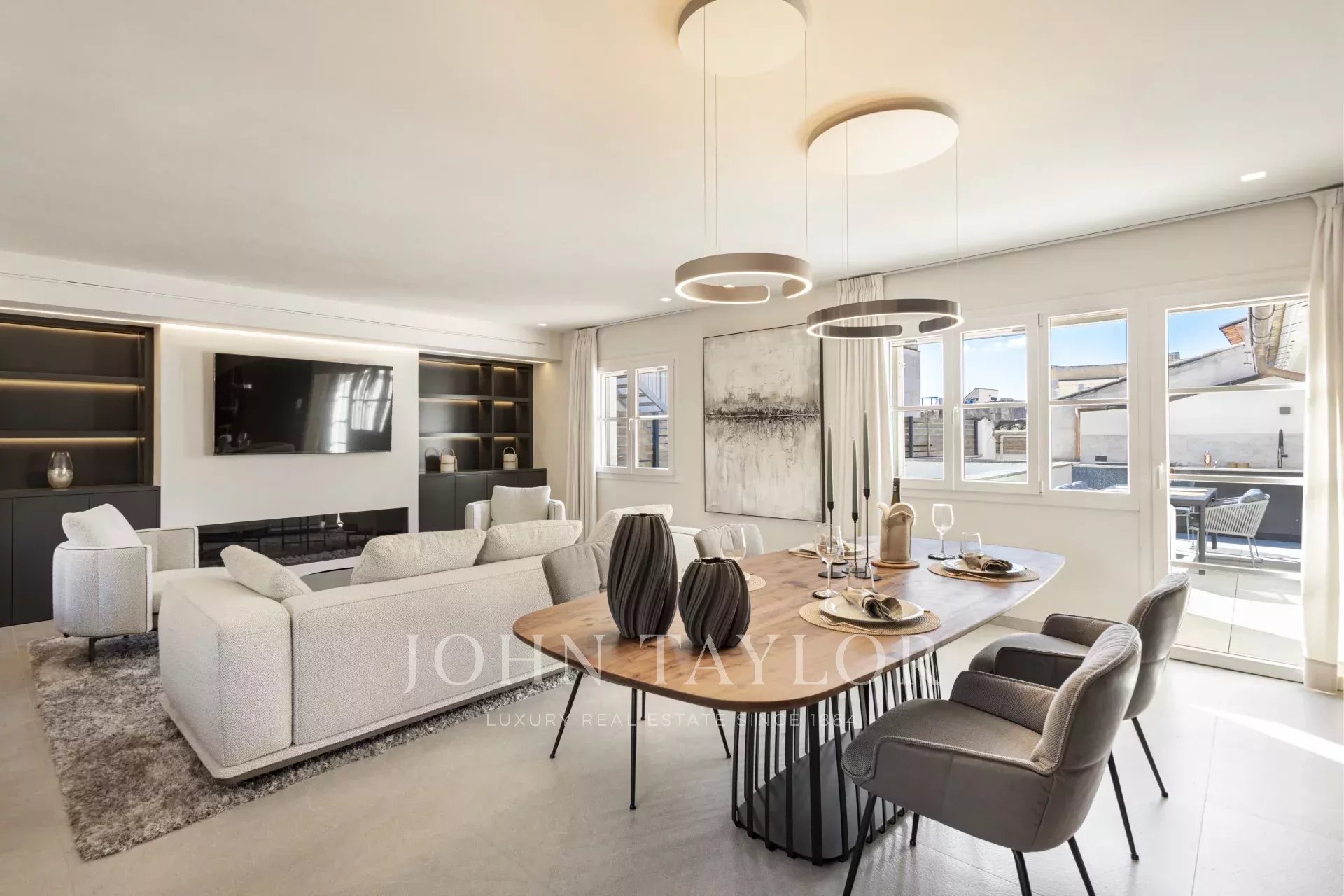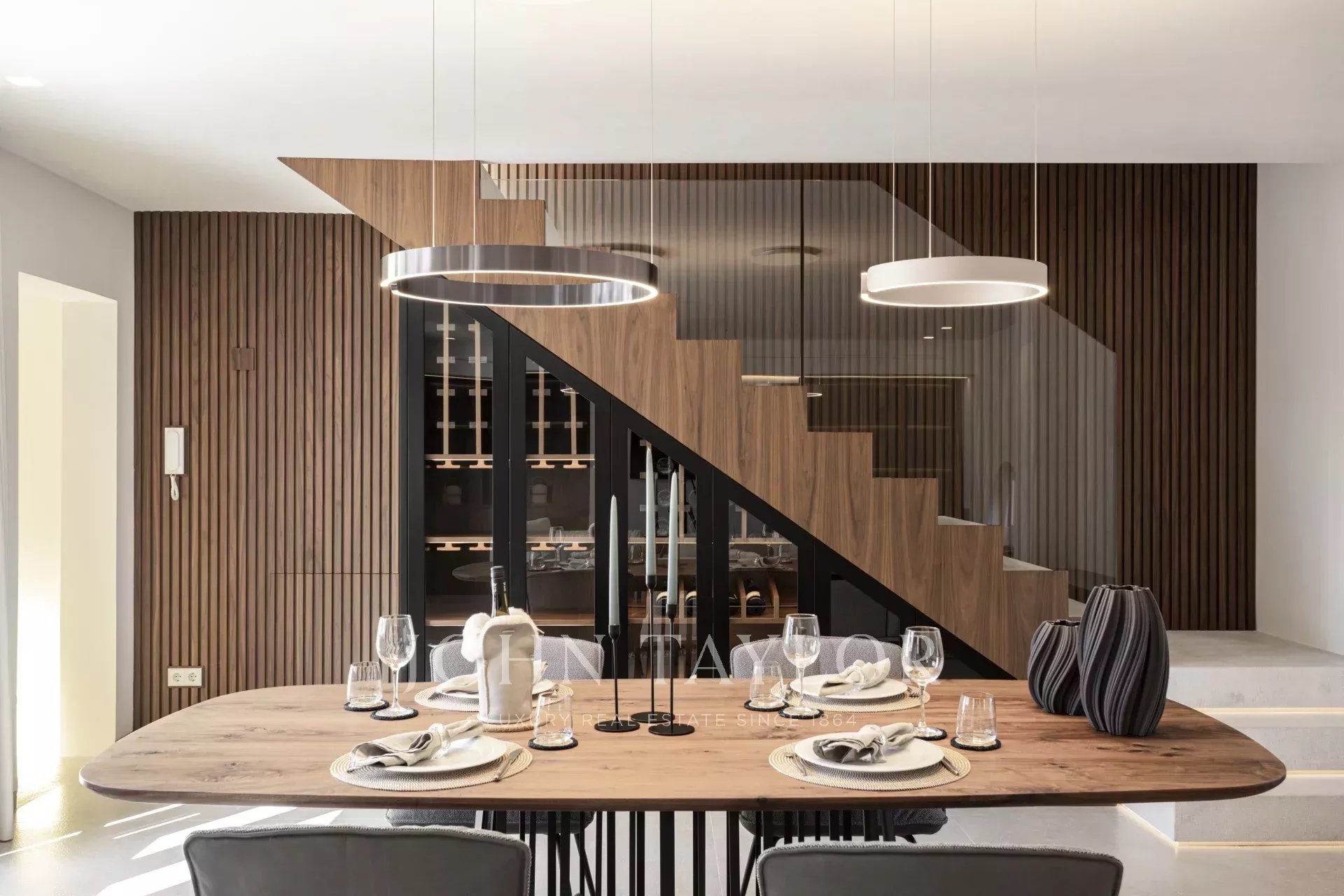 D'une superficie totale de 243 m², dont 58,9 m² de terrasses, l'appartement vous accueille avec un élégant hall d'entrée menant aux chambres : une chambre principale avec salle de bains privative et deux chambres supplémentaires partageant une élégante salle de bains. Au niveau supérieur, un spacieux salon et salle à manger avec cheminée à gaz et présentoir à vin sur mesure s'ouvre sur la terrasse adjacente - le cadre idéal pour des soirées élégantes ou des moments de détente sous les étoiles.