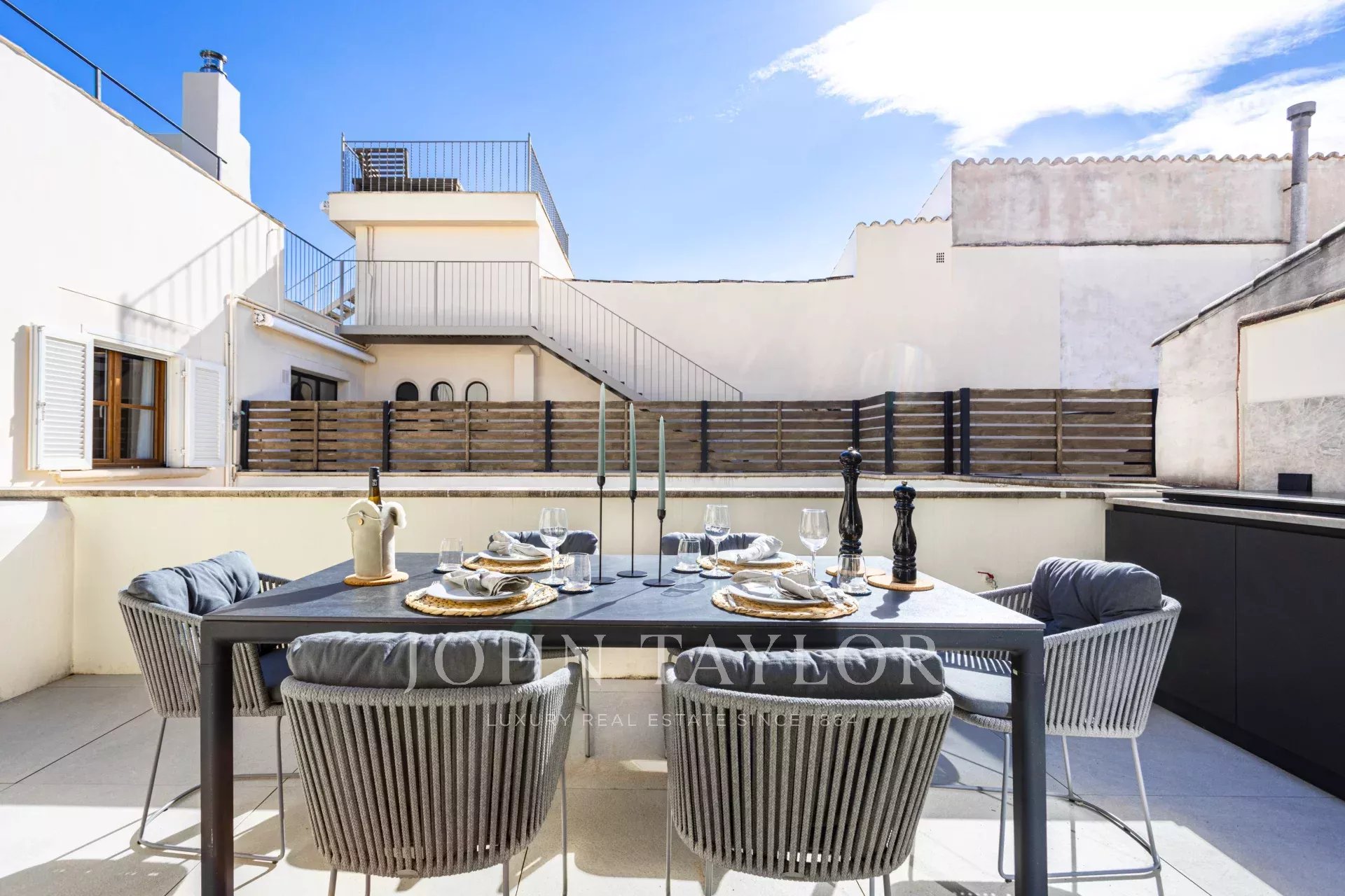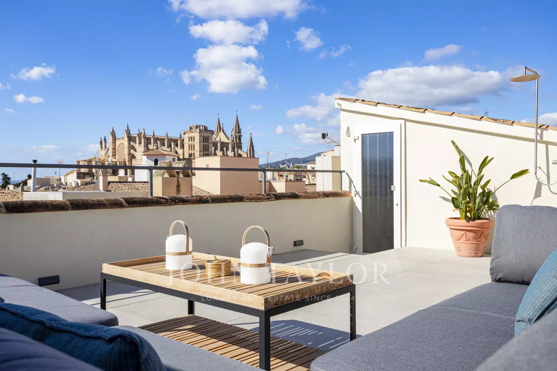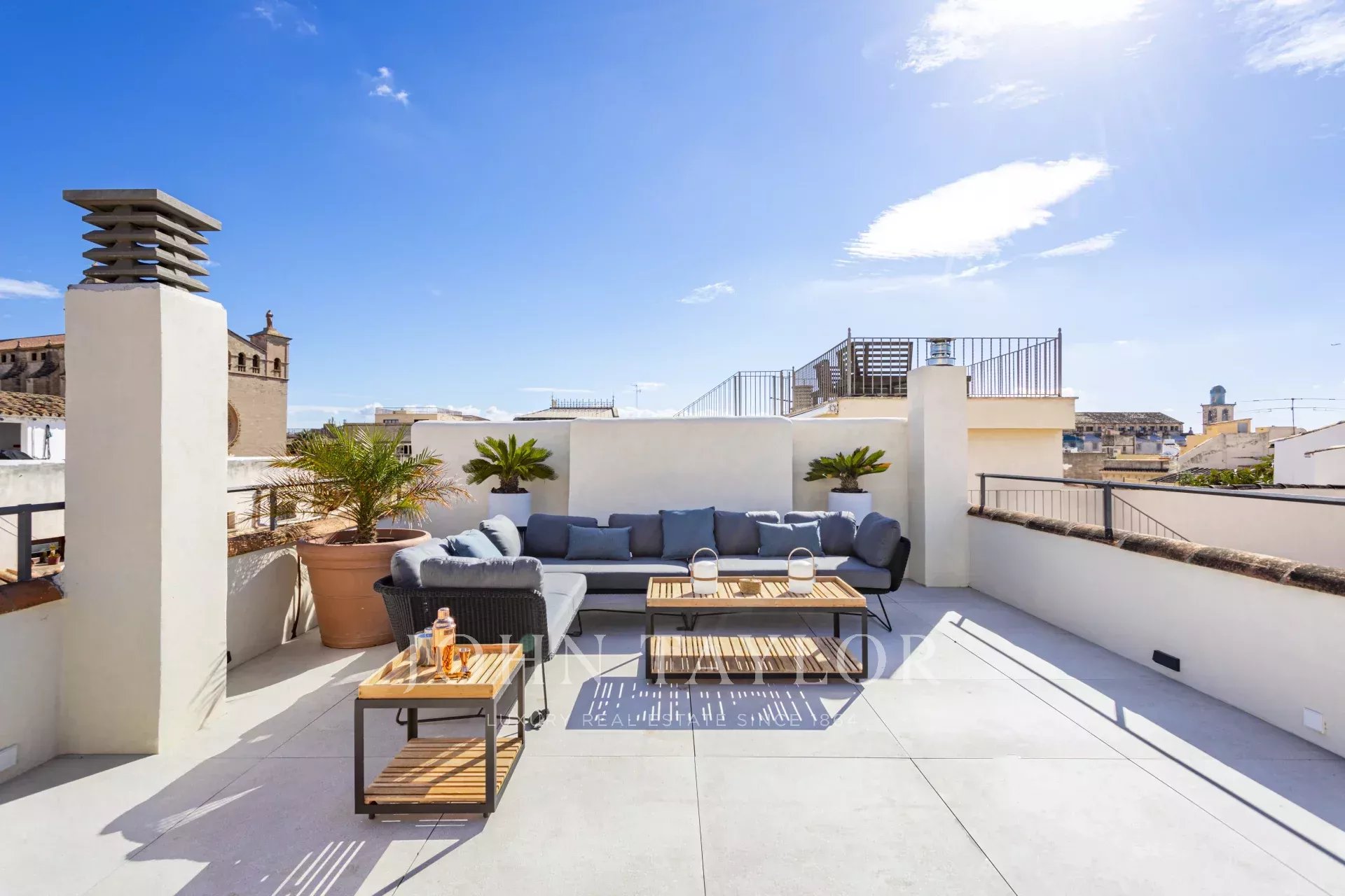 La cuisine design séparée est équipée d'appareils haut de gamme Gaggenau, Bora et Liebherr, et offre également un accès direct à la terrasse, où une cuisine extérieure avec barbecue invite à profiter de la vie méditerranéenne dans toute sa splendeur. Un escalier mène de la salle de séjour à la terrasse sur le toit, qui offre des vues panoramiques à couper le souffle sur la cathédrale, la mer et la ligne d'horizon de Palma, ornée d'églises historiques telles que Santa Eulalia et Sant Francesc. Pré-installé pour une piscine ou un jacuzzi, cet espace constitue une oasis privée au-dessus des toits de la vieille ville.