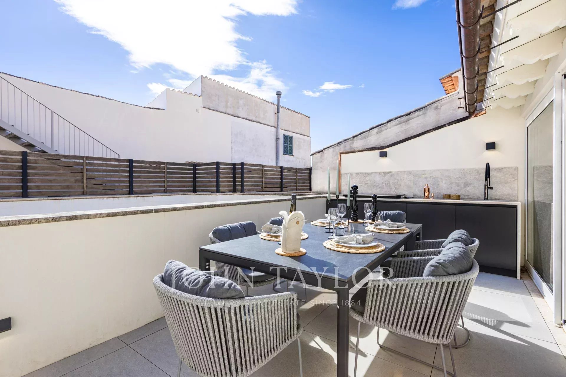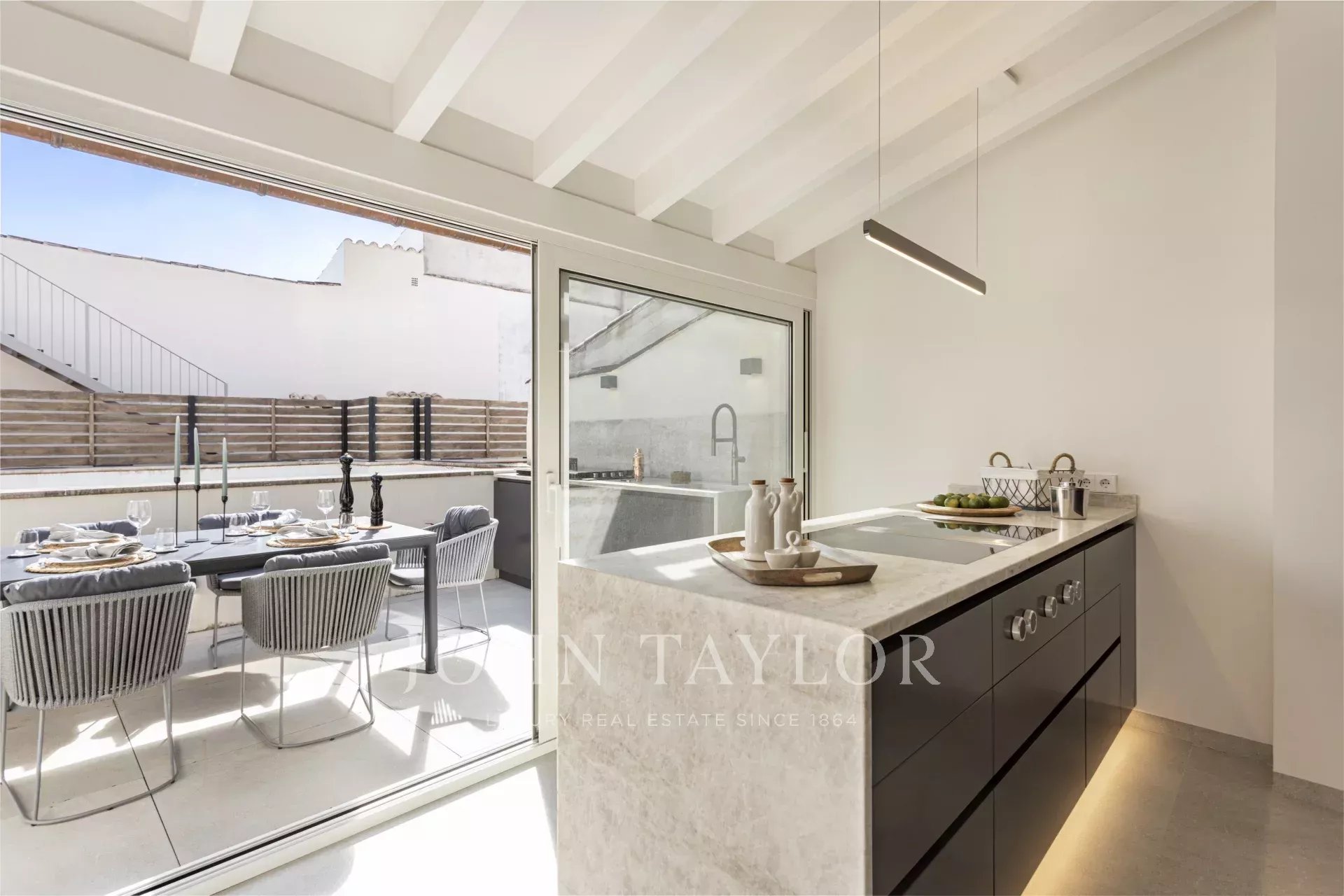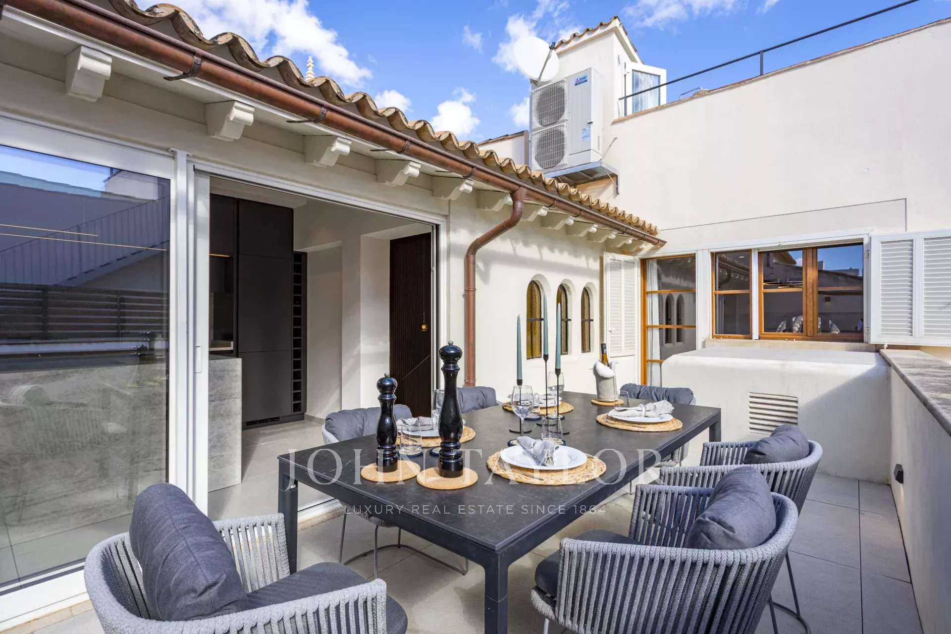 La cuisine design séparée est équipée d'appareils haut de gamme Gaggenau, Bora et Liebherr, et offre également un accès direct à la terrasse, où une cuisine extérieure avec barbecue invite à profiter de la vie méditerranéenne dans toute sa splendeur. Un escalier mène de la salle de séjour à la terrasse sur le toit, qui offre des vues panoramiques à couper le souffle sur la cathédrale, la mer et la ligne d'horizon de Palma, ornée d'églises historiques telles que Santa Eulalia et Sant Francesc. Pré-installé pour une piscine ou un jacuzzi, cet espace constitue une oasis privée au-dessus des toits de la vieille ville.