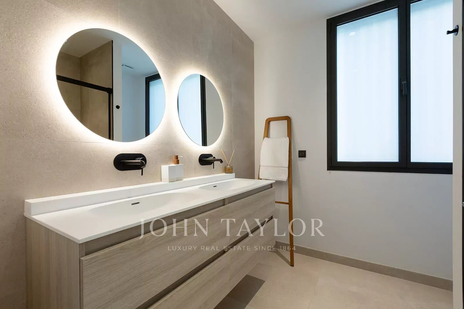 Les deux chambres sont spacieuses et baignées de lumière naturelle. La suite principale dispose d'un accès direct à la terrasse et d'une salle de bains privative. Les deux salles de bains sont conçues avec des détails élégants, notamment des douches en verre, un éclairage d'ambiance, des lavabos à surface solide avec de grands tiroirs et des miroirs à LED qui allient style et praticité.