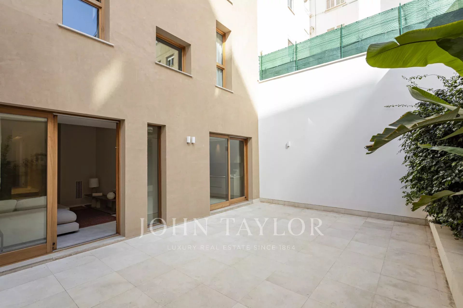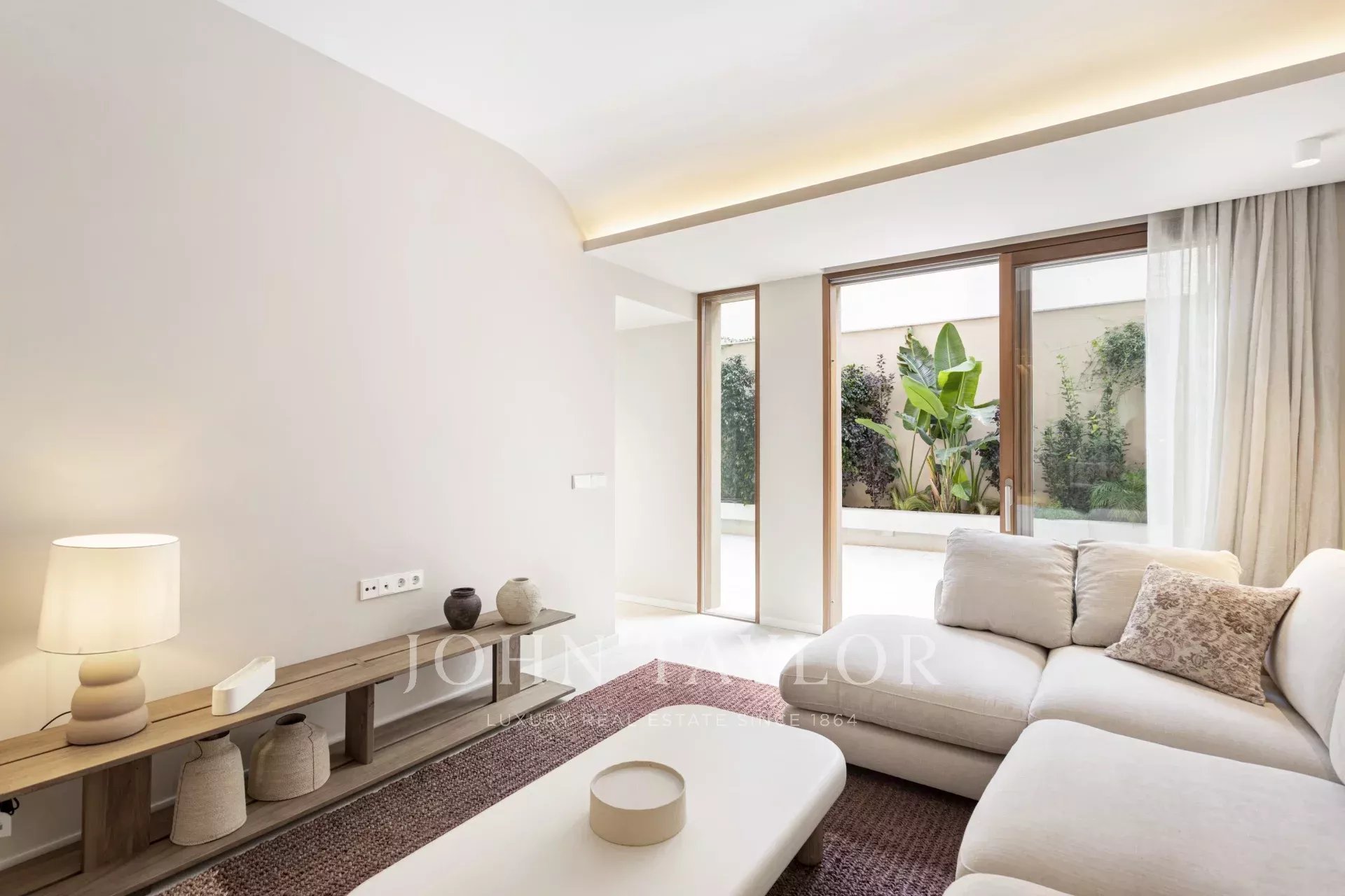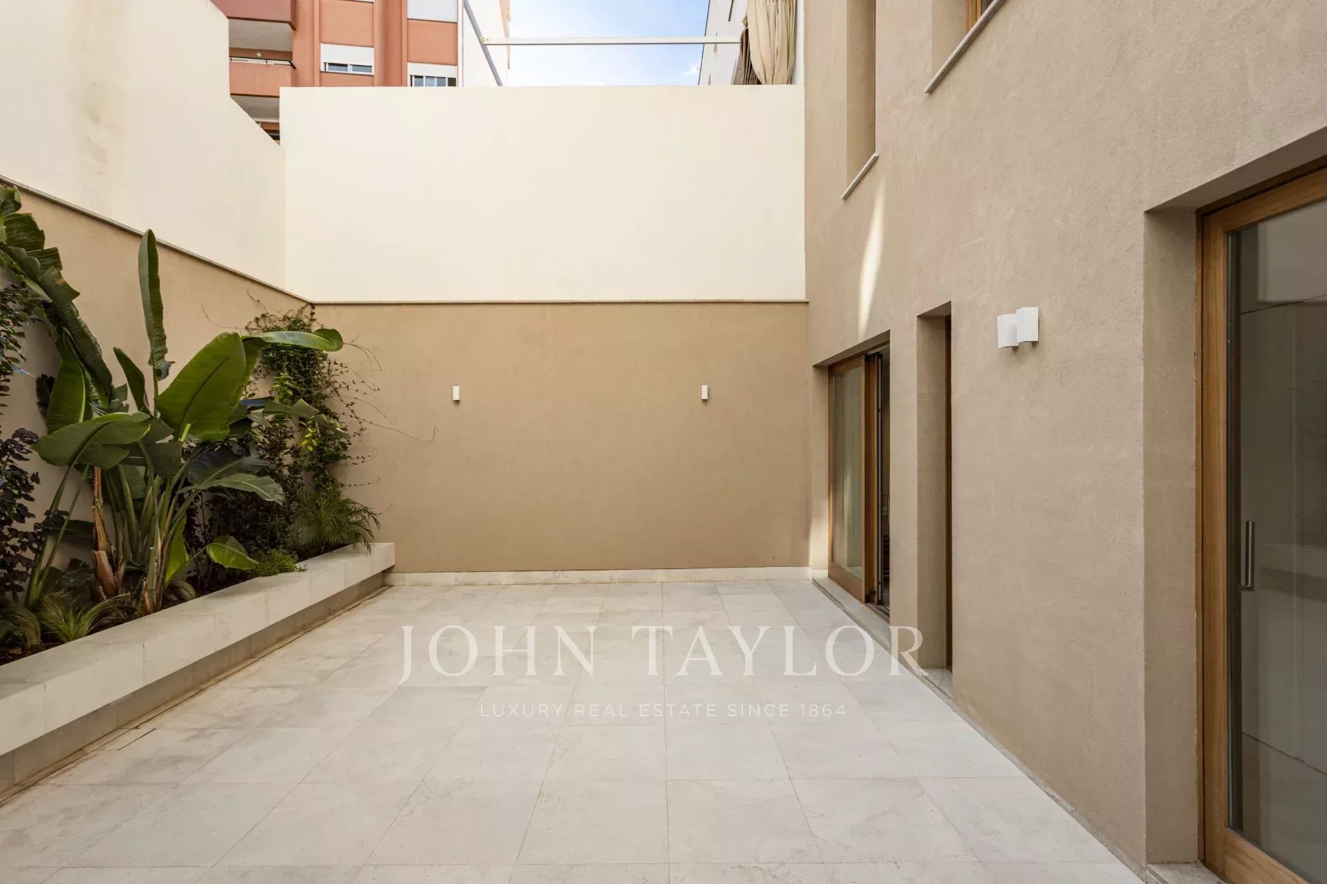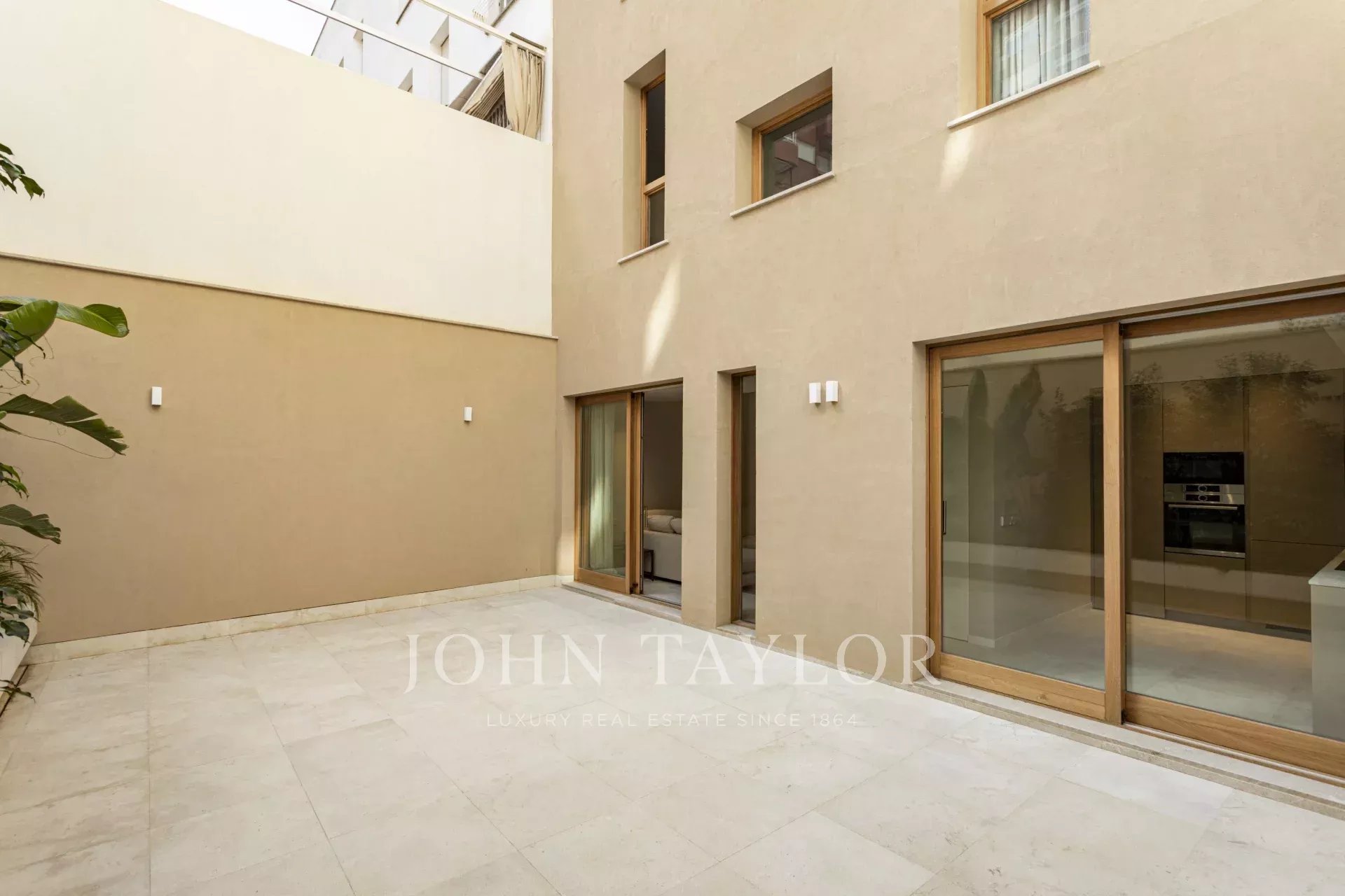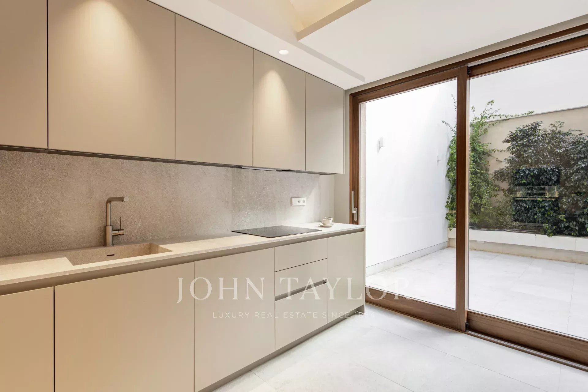 L'appartement du rez-de-chaussée comprend deux chambres, deux salles de bains, dont une en suite, une cuisine ouverte, un salon-salle à manger avec accès direct à la terrasse de 30m2.