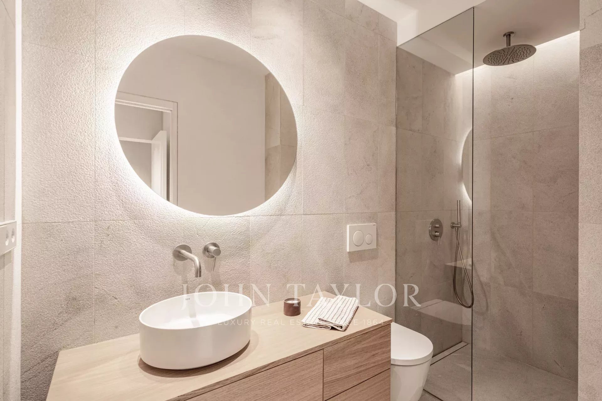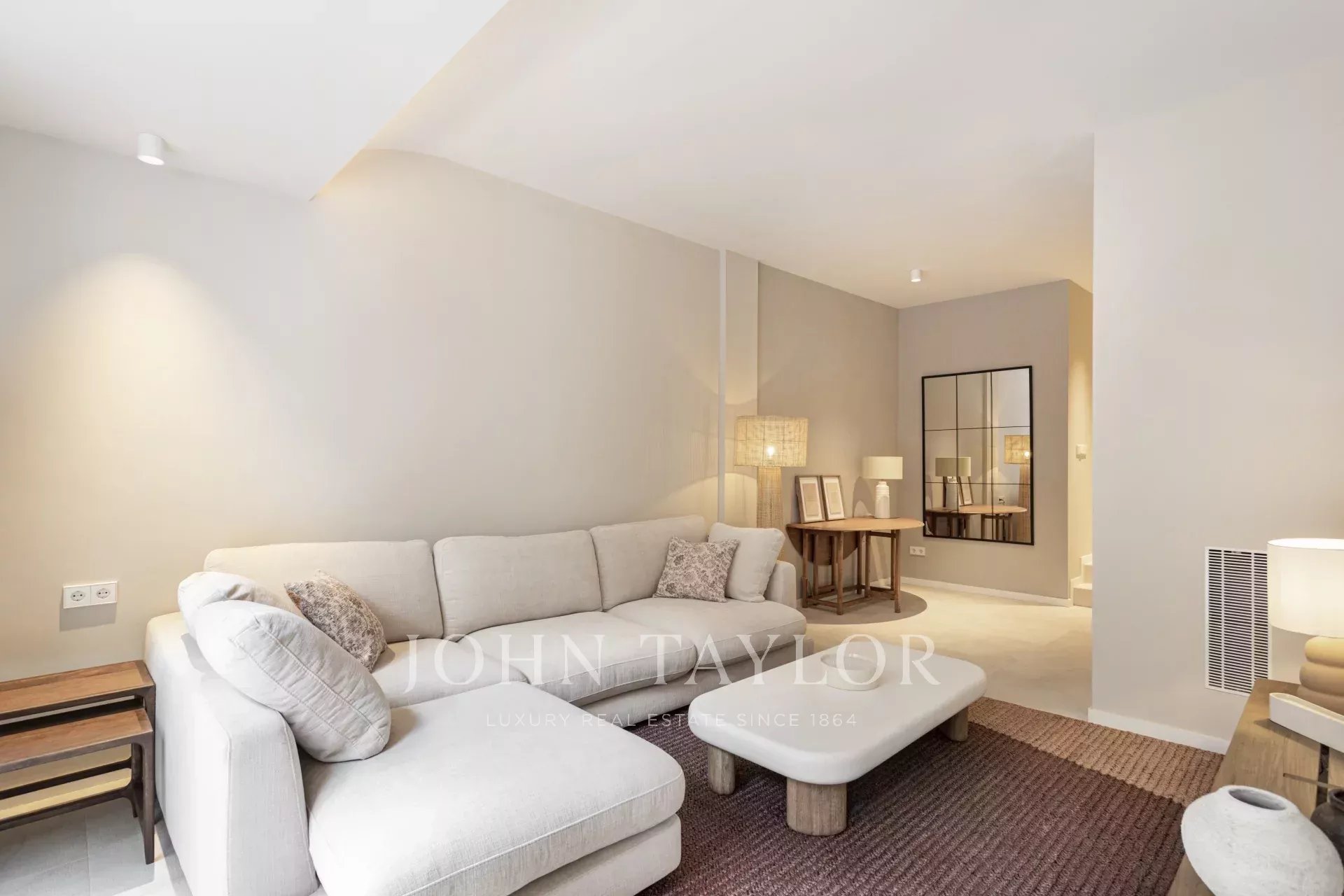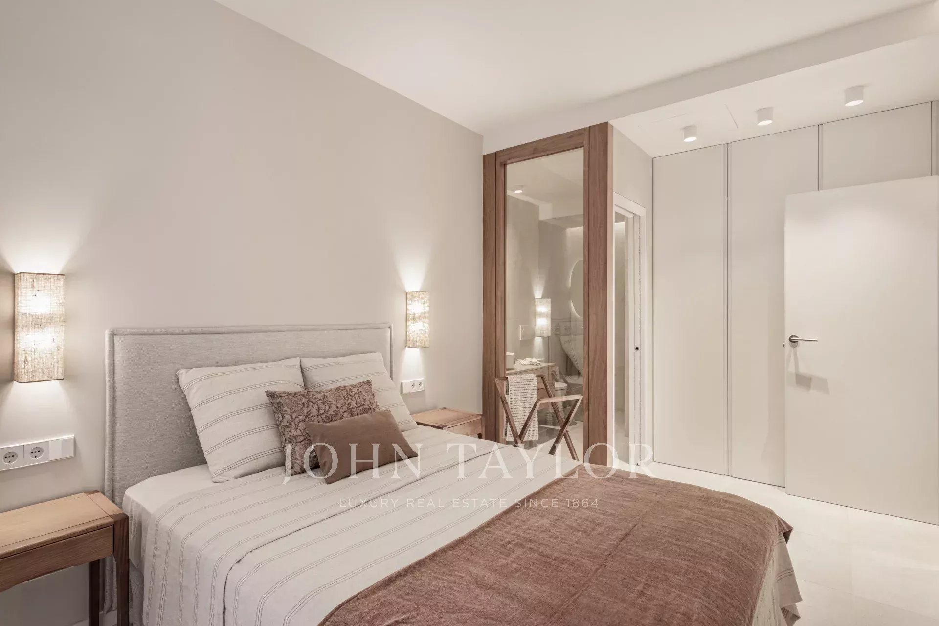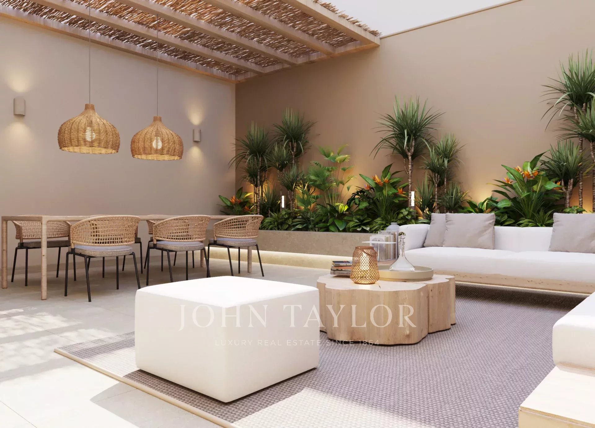 L'appartement du rez-de-chaussée comprend deux chambres, deux salles de bains, dont une en suite, une cuisine ouverte, un salon-salle à manger avec accès direct à la terrasse de 30m2.