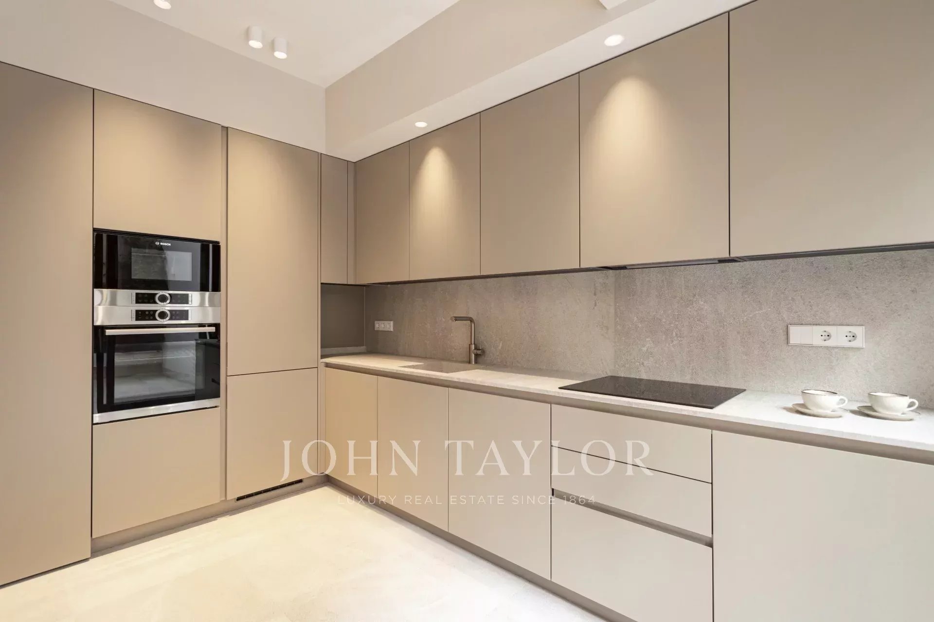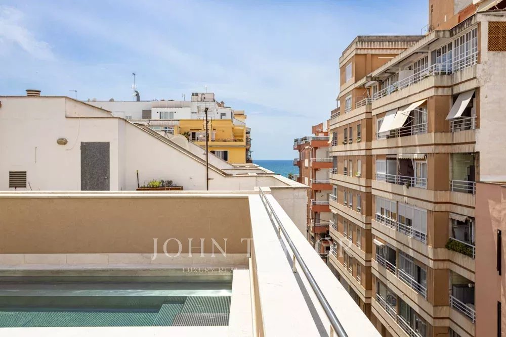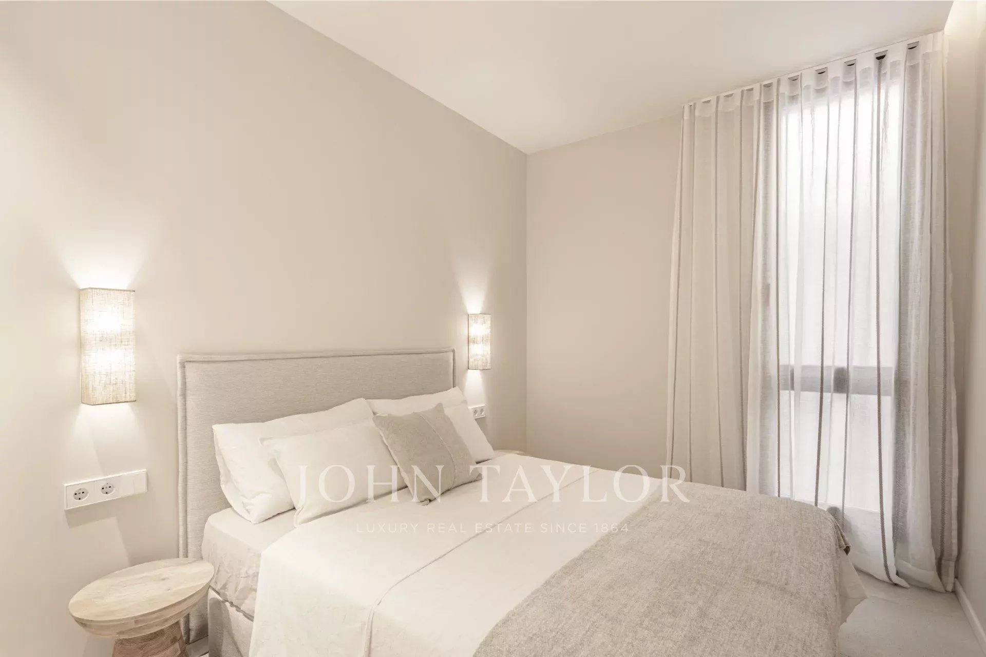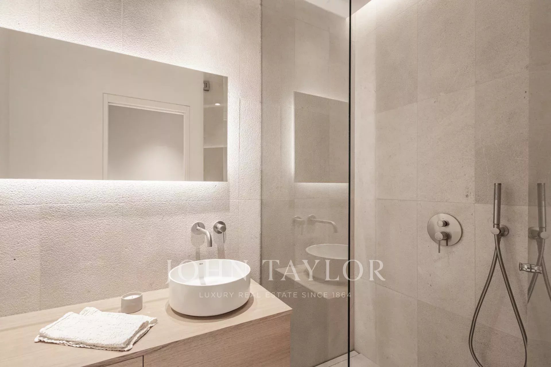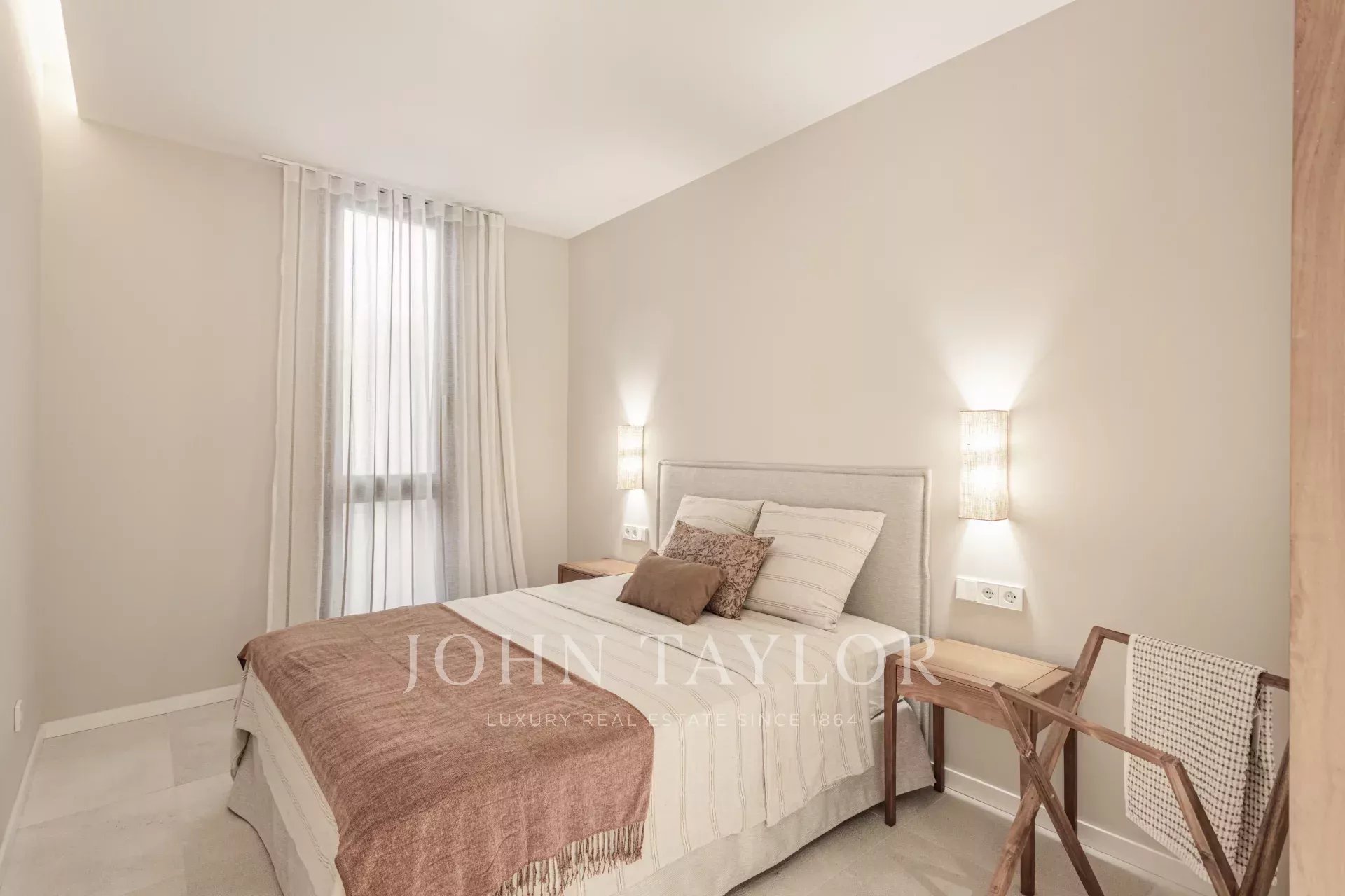 L'appartement du rez-de-chaussée comprend deux chambres, deux salles de bains, dont une en suite, une cuisine ouverte, un salon-salle à manger avec accès direct à la terrasse de 30m2.