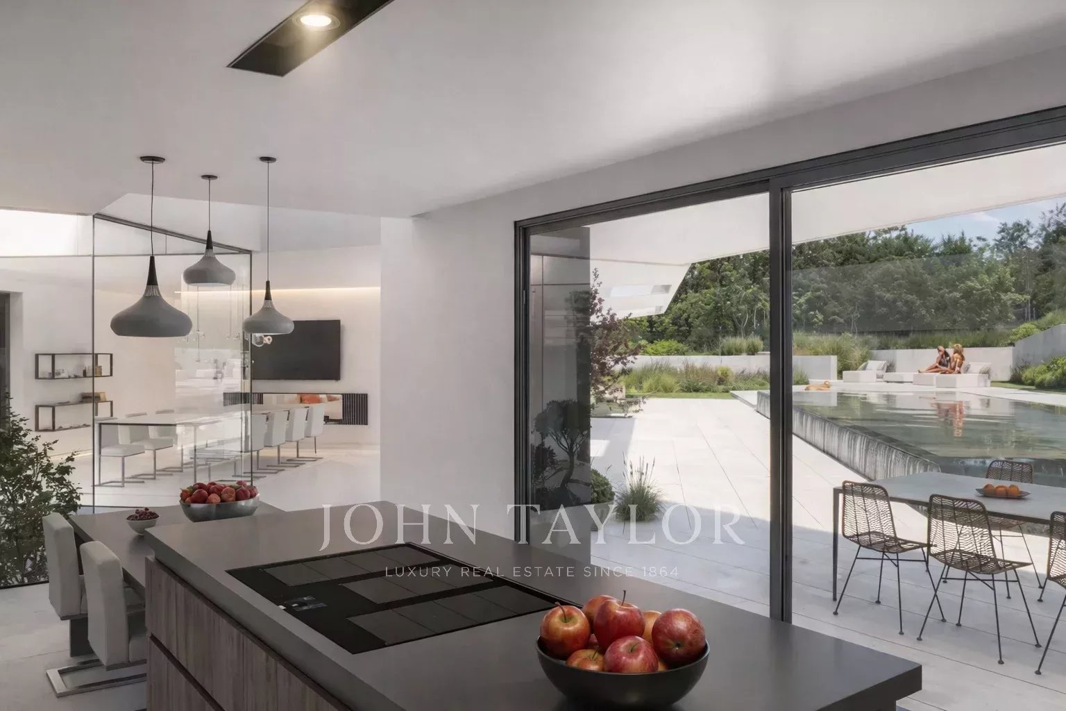 On accède par un magnifique couloir à un salon orienté au sud qui se prolonge par plusieurs pièces, fusionnant parfaitement l'intérieur avec l'extérieur grâce aux grandes fenêtres.