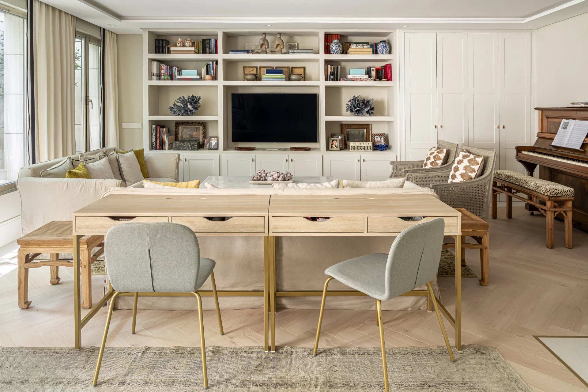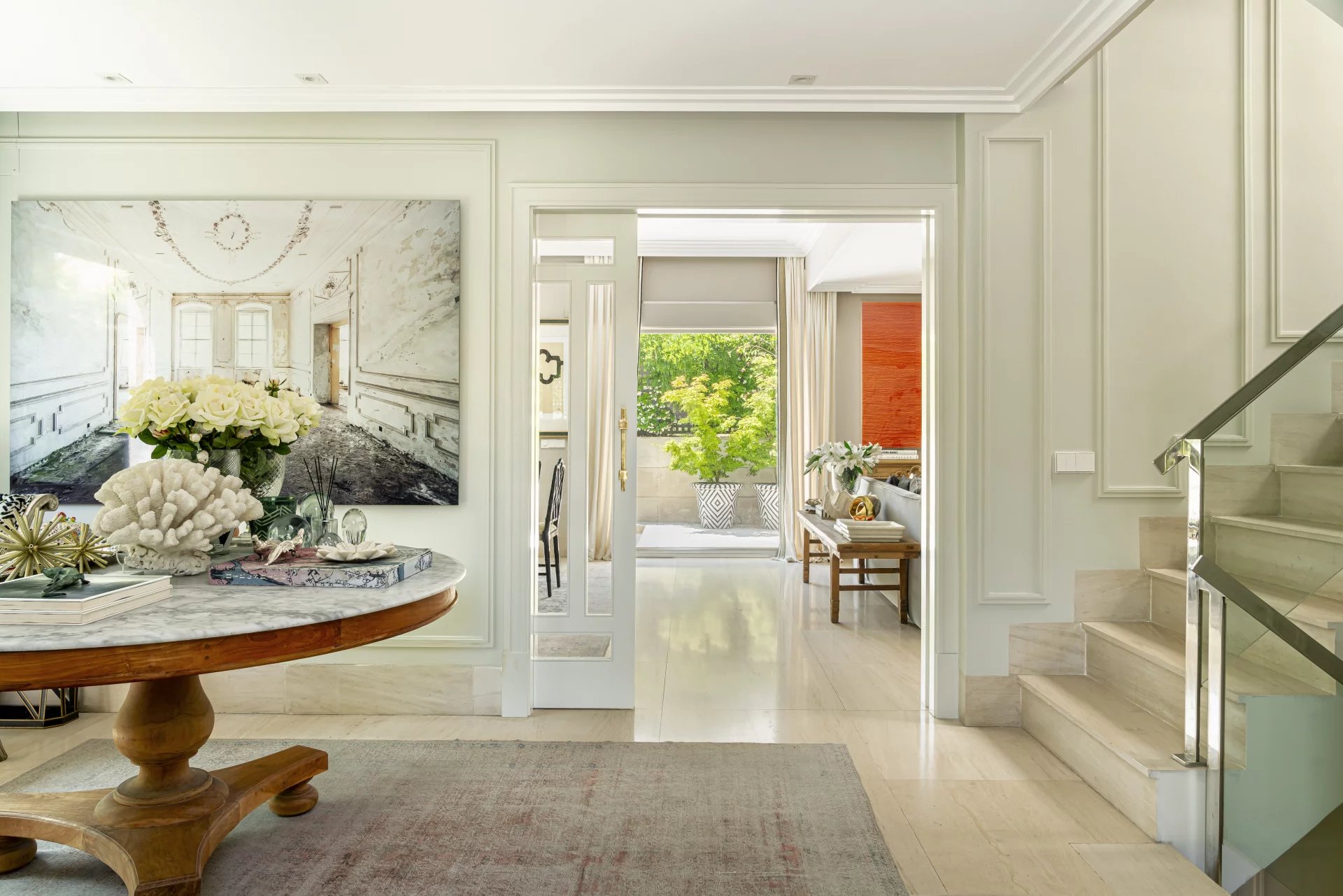 Au premier étage, une belle terrasse donnant sur un parc et sur la ligne d'horizon de Madrid. Un salon avec de grandes fenêtres et un bureau.