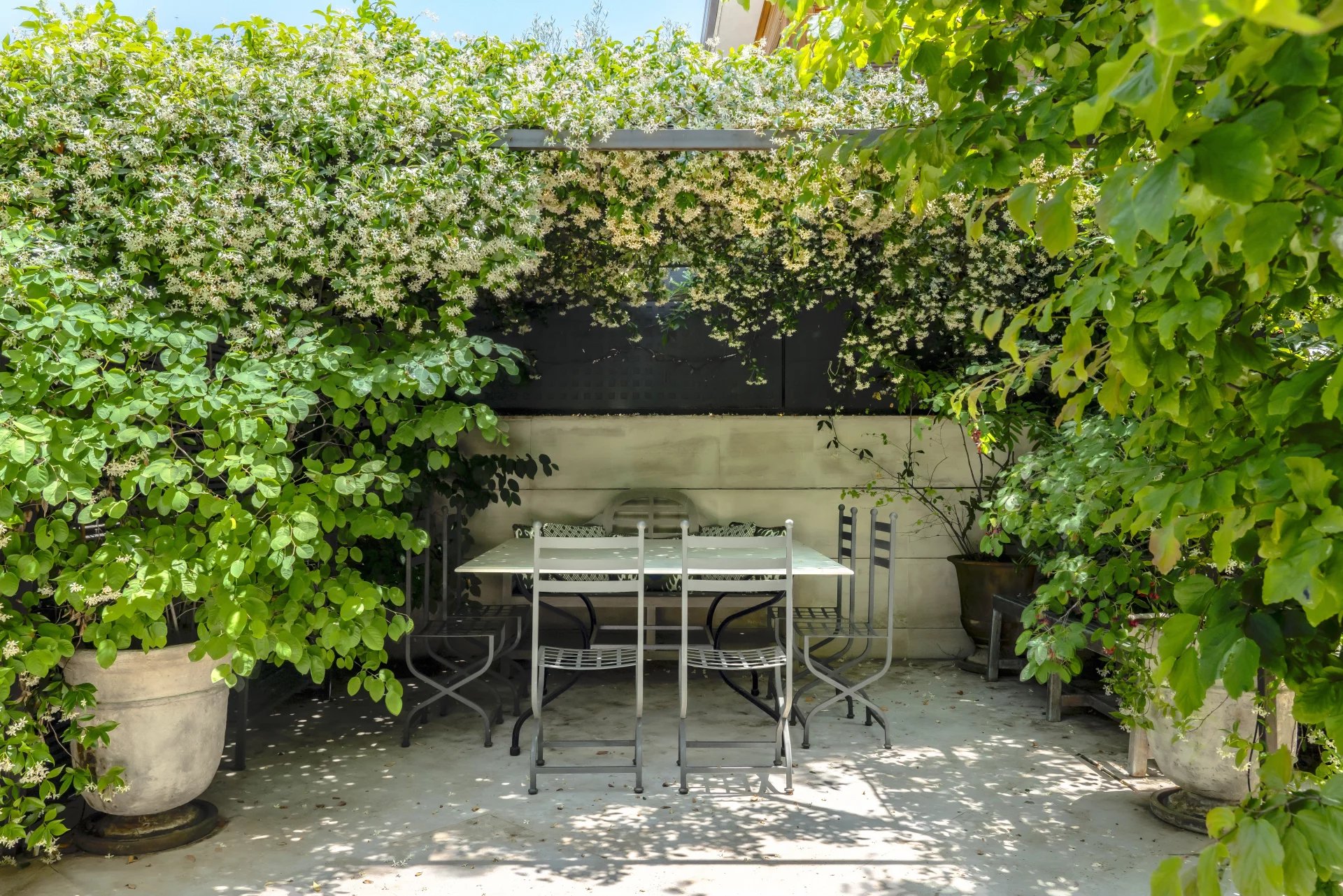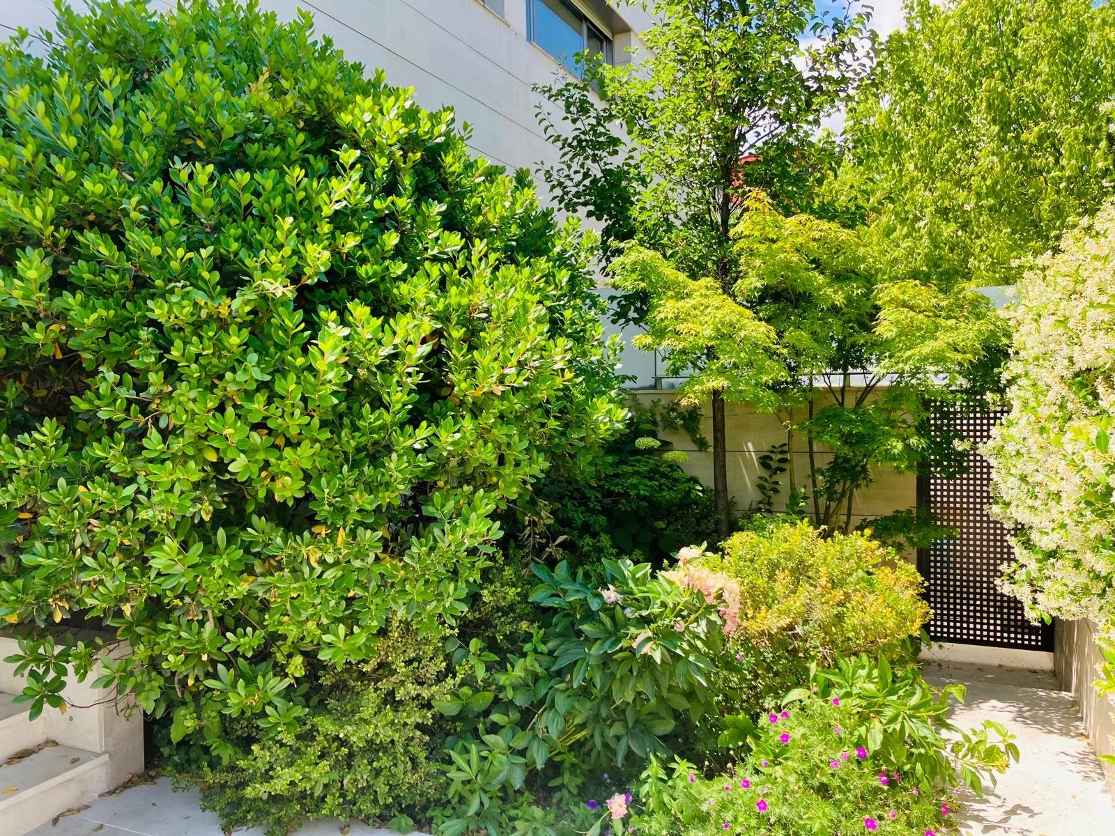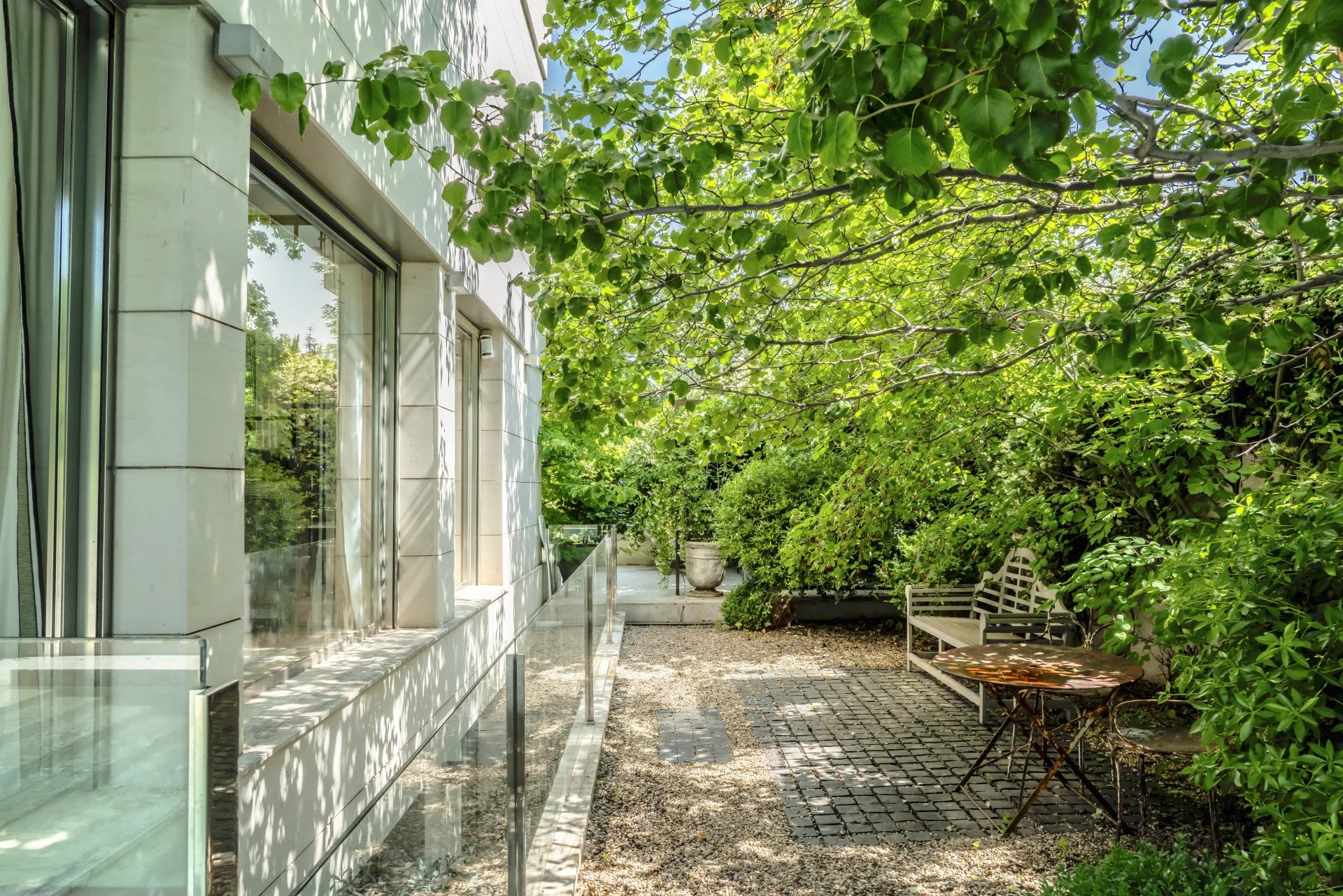 Jardin avec de magnifiques arbres et plantes matures et une élégante piscine d'eau saline en pierre calcaire avec des porches en structure d'acier pour l'été et l'hiver.