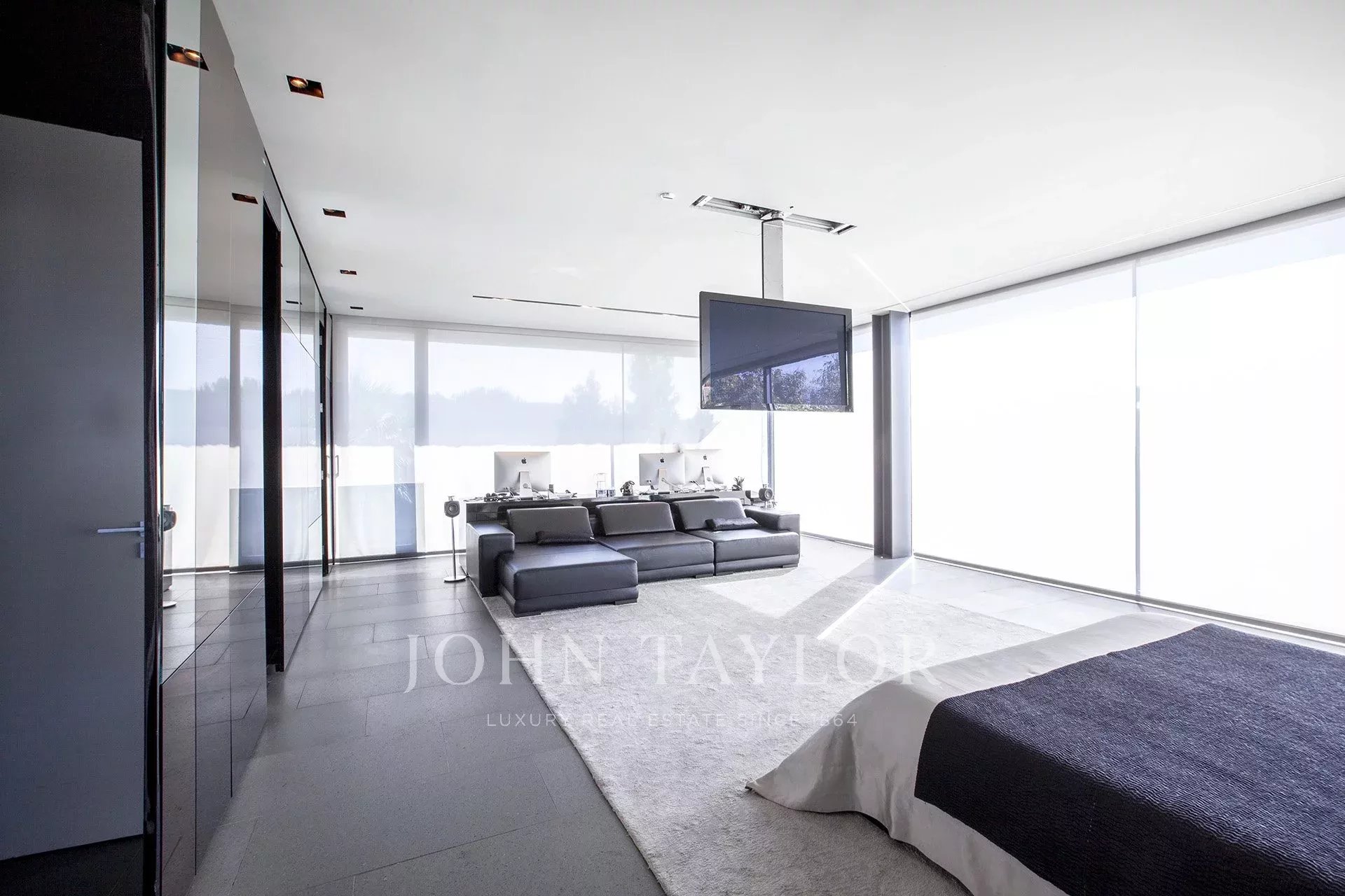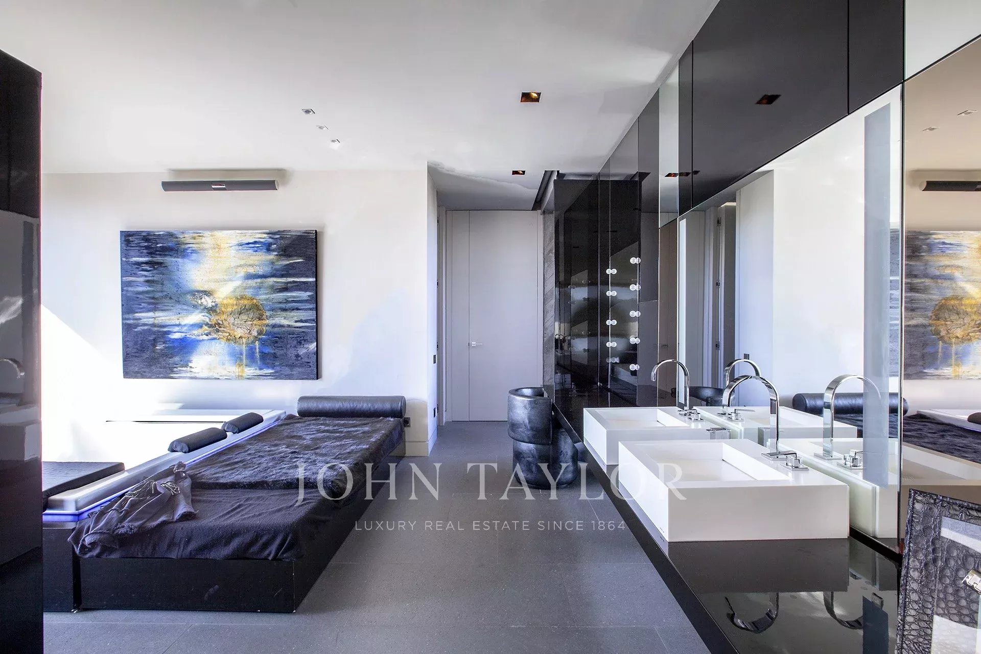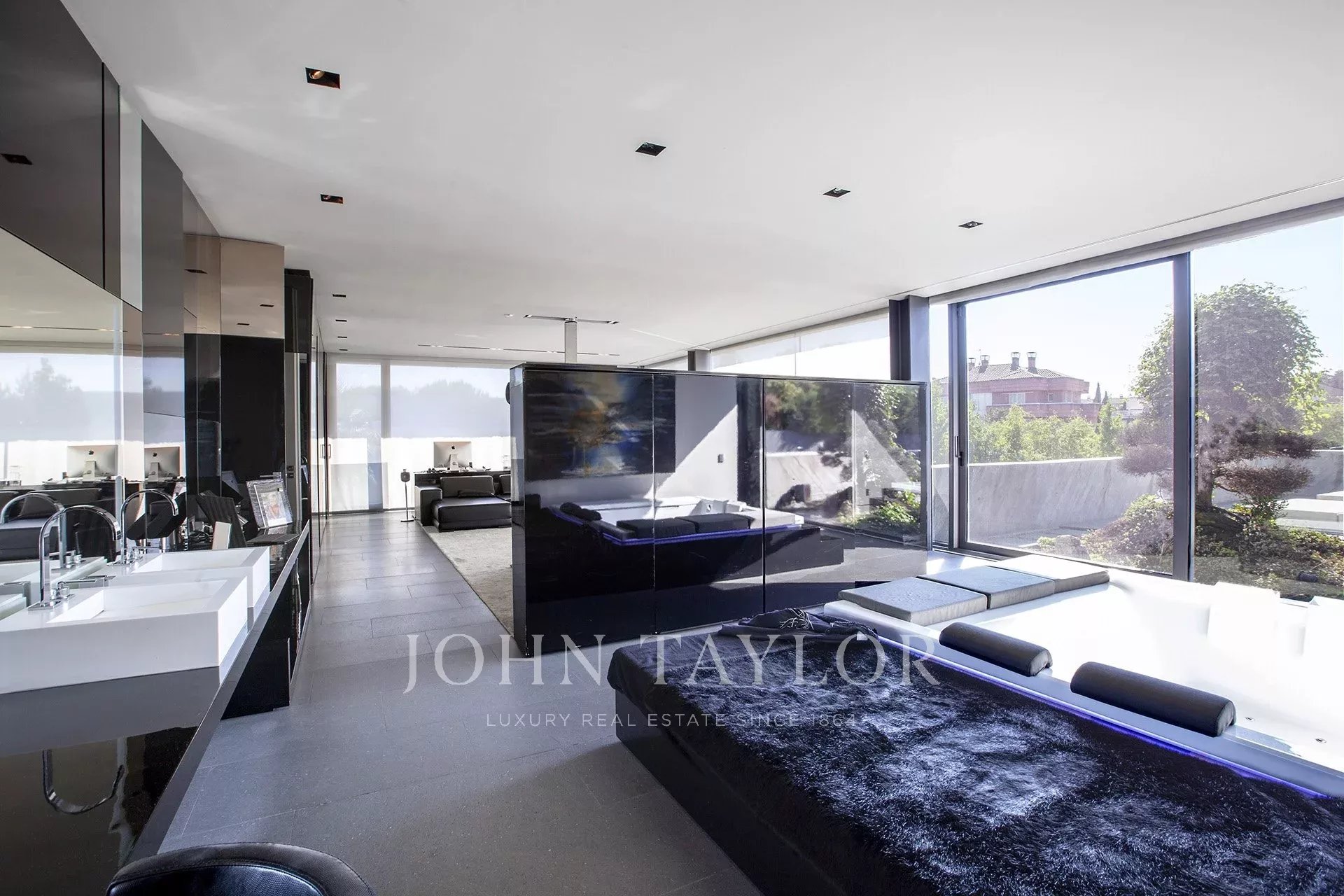 ÉTAGE SUPÉRIEUR : on y accède par deux escaliers. L'escalier principal mène à trois chambres spacieuses et lumineuses, chacune disposant de sa propre salle de bains avec des parois en verre et des meubles en corian. Ensuite, une passerelle en verre de 10 m de long mène à la spacieuse suite ouverte de 120 m de long, ainsi qu'à un double dressing de 22 m², dissimulé par un mur doté d'un ensemble de miroirs de style Mondrian. 3*3 Jacuzzi par TEUCO. Salle de douche de 3,8m².