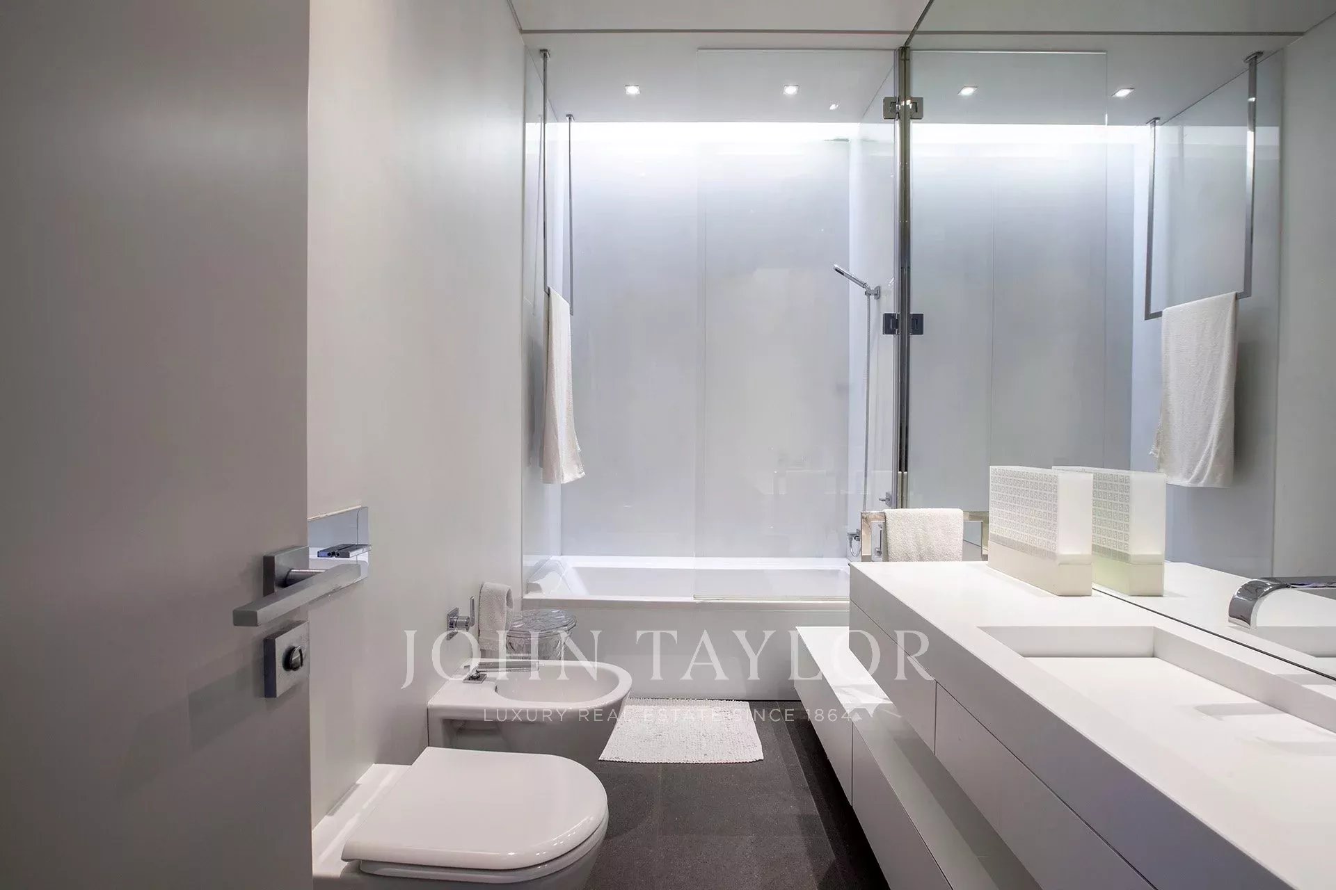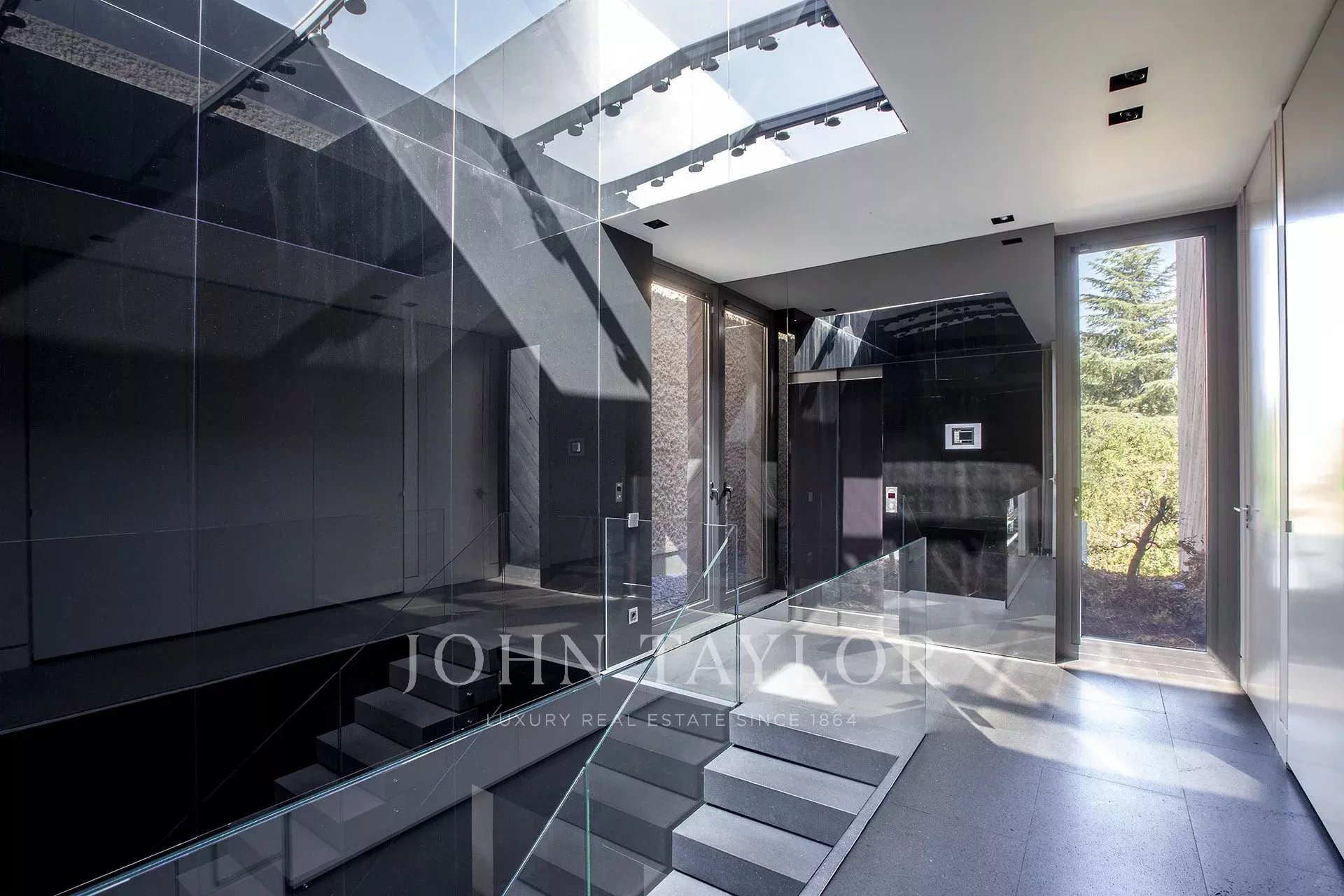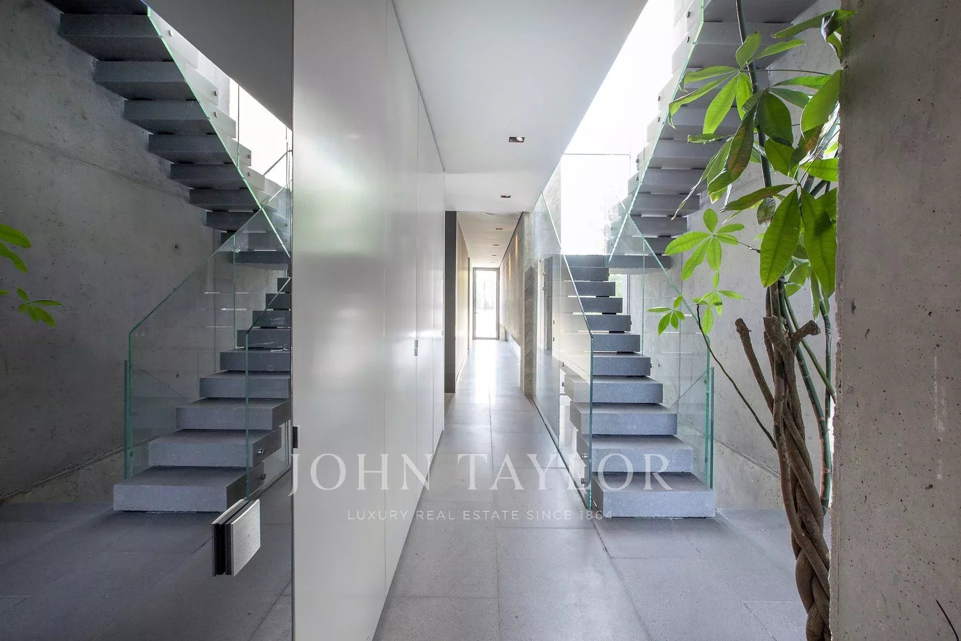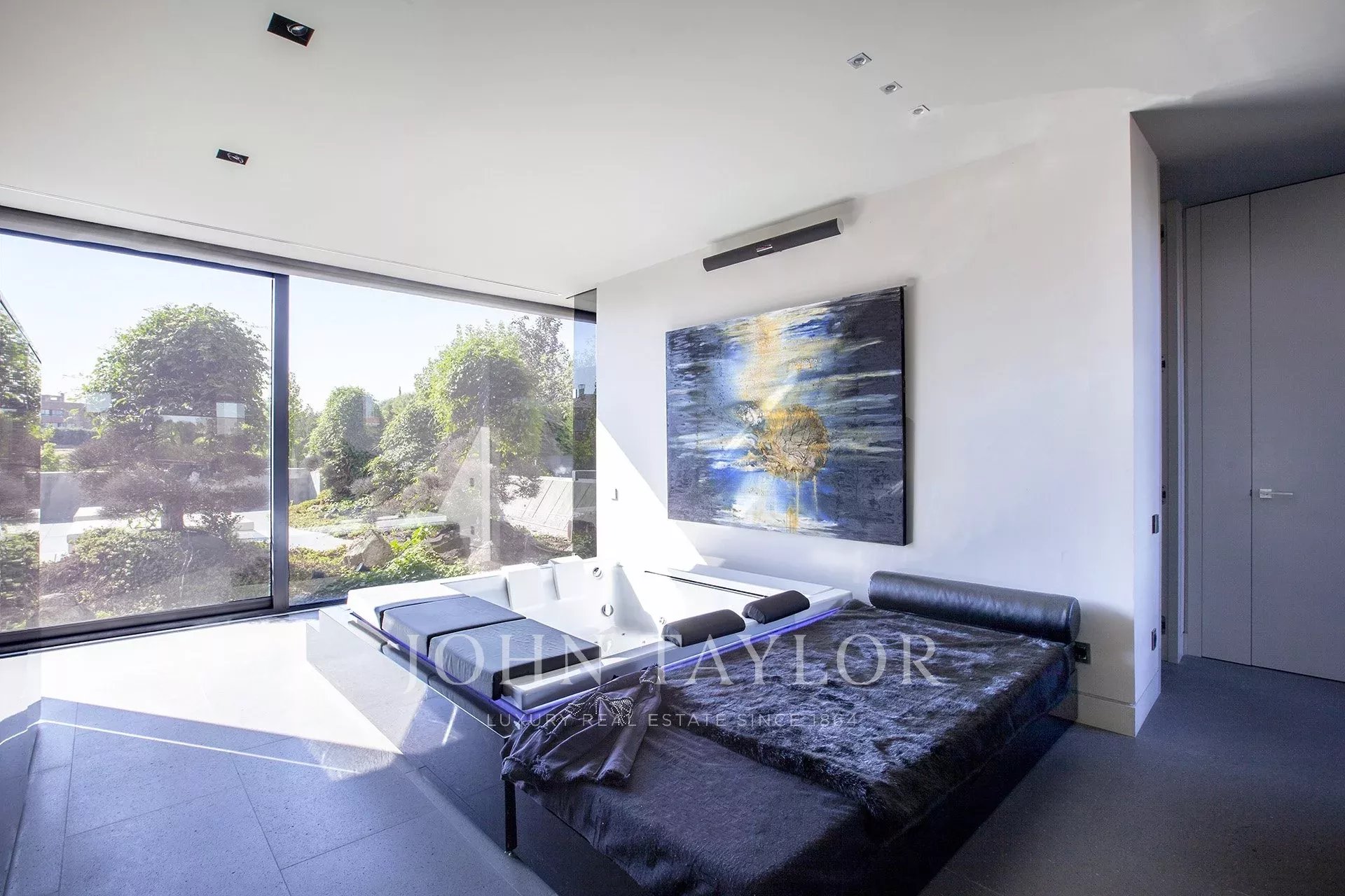ÉTAGE SUPÉRIEUR : on y accède par deux escaliers. L'escalier principal mène à trois chambres spacieuses et lumineuses, chacune disposant de sa propre salle de bains avec des parois en verre et des meubles en corian. Ensuite, une passerelle en verre de 10 m de long mène à la spacieuse suite ouverte de 120 m de long, ainsi qu'à un double dressing de 22 m², dissimulé par un mur doté d'un ensemble de miroirs de style Mondrian. 3*3 Jacuzzi par TEUCO. Salle de douche de 3,8m².