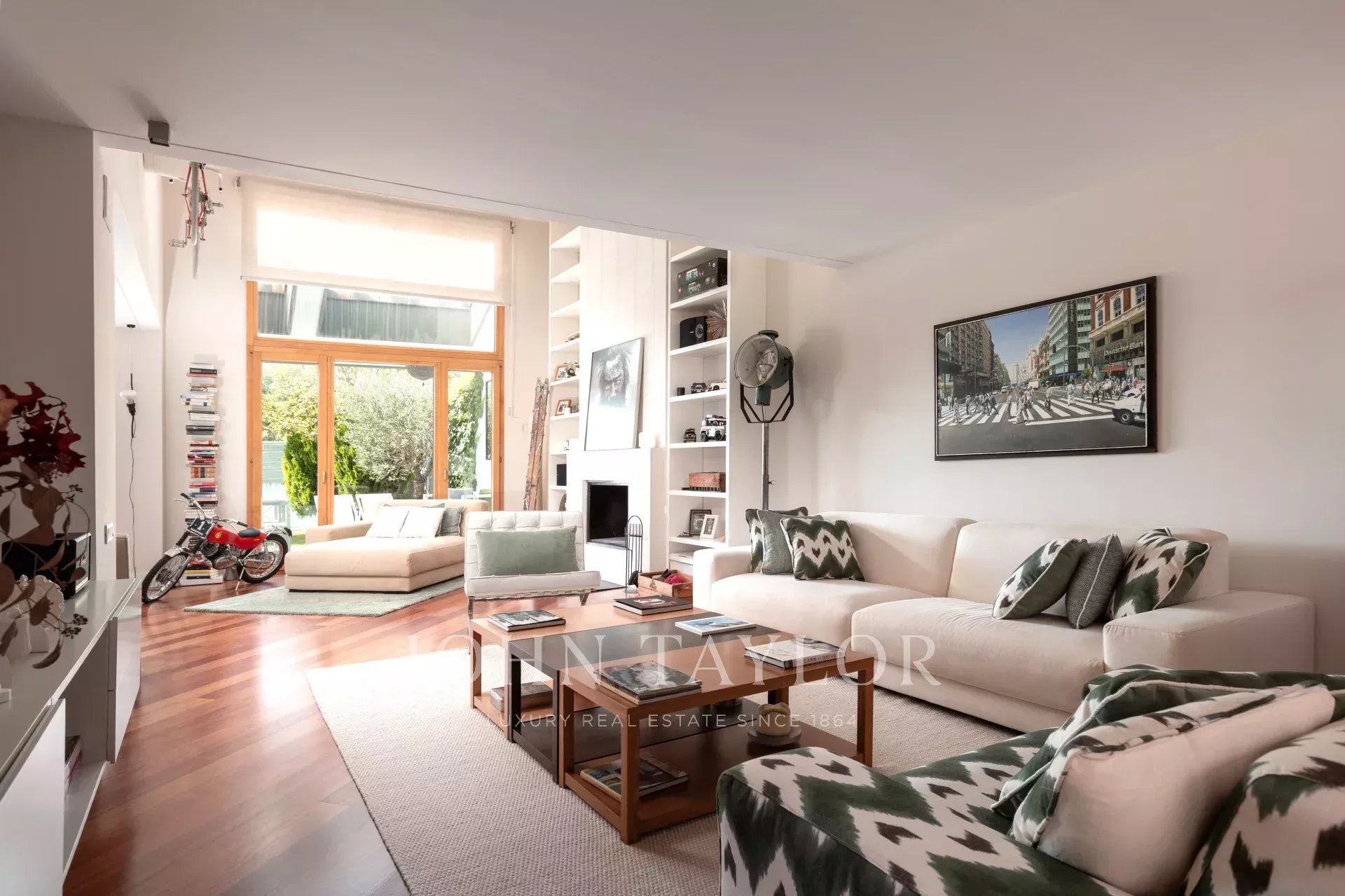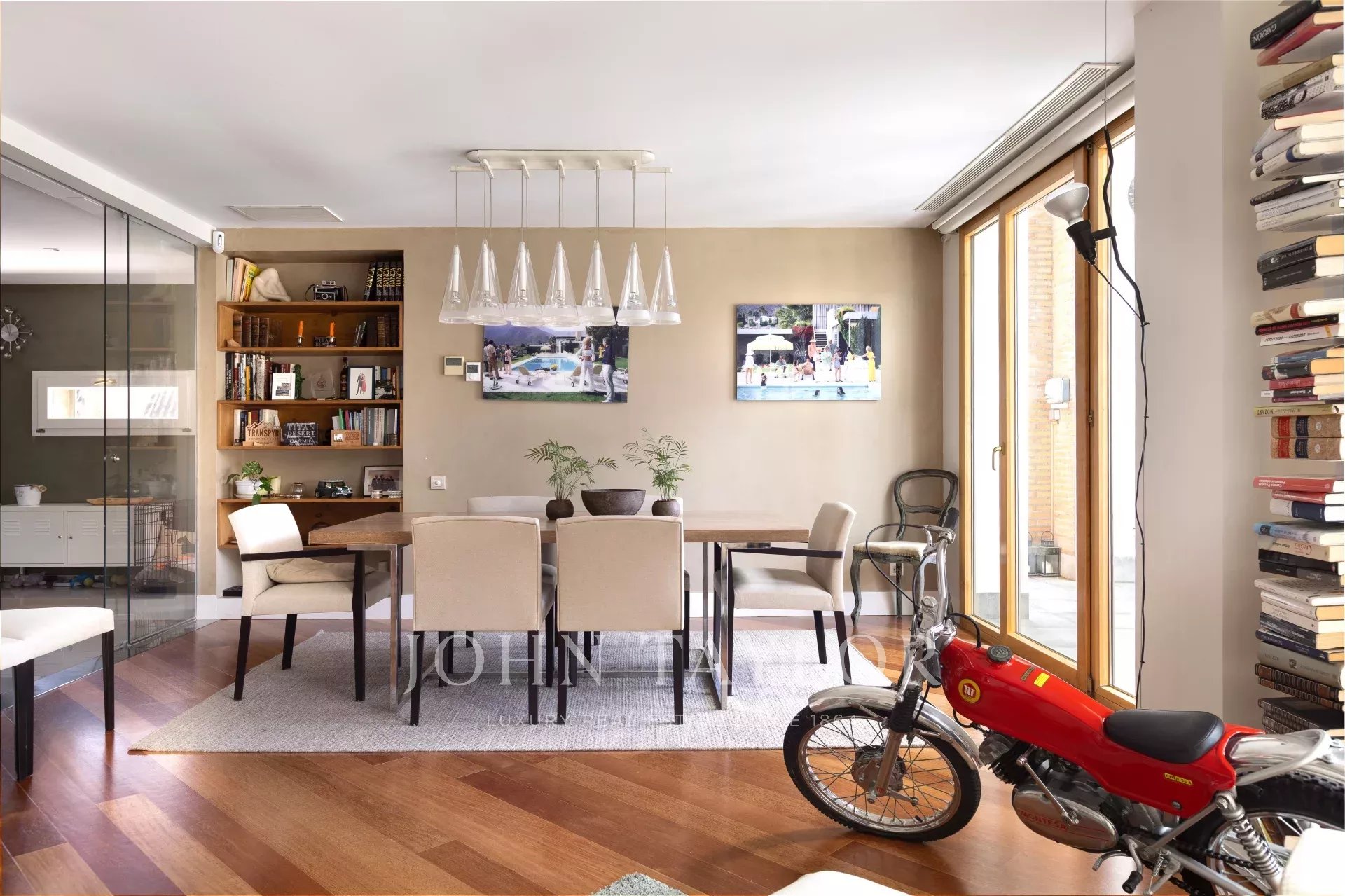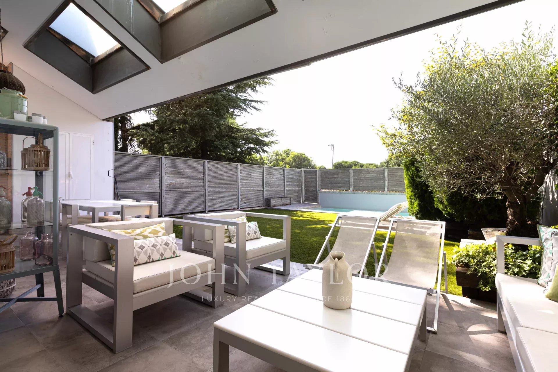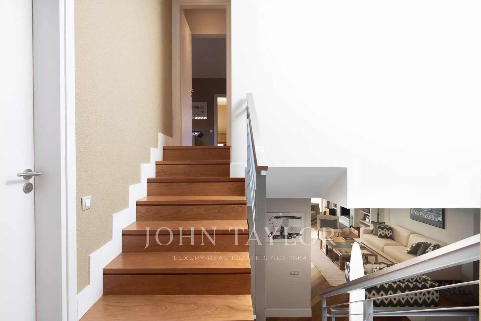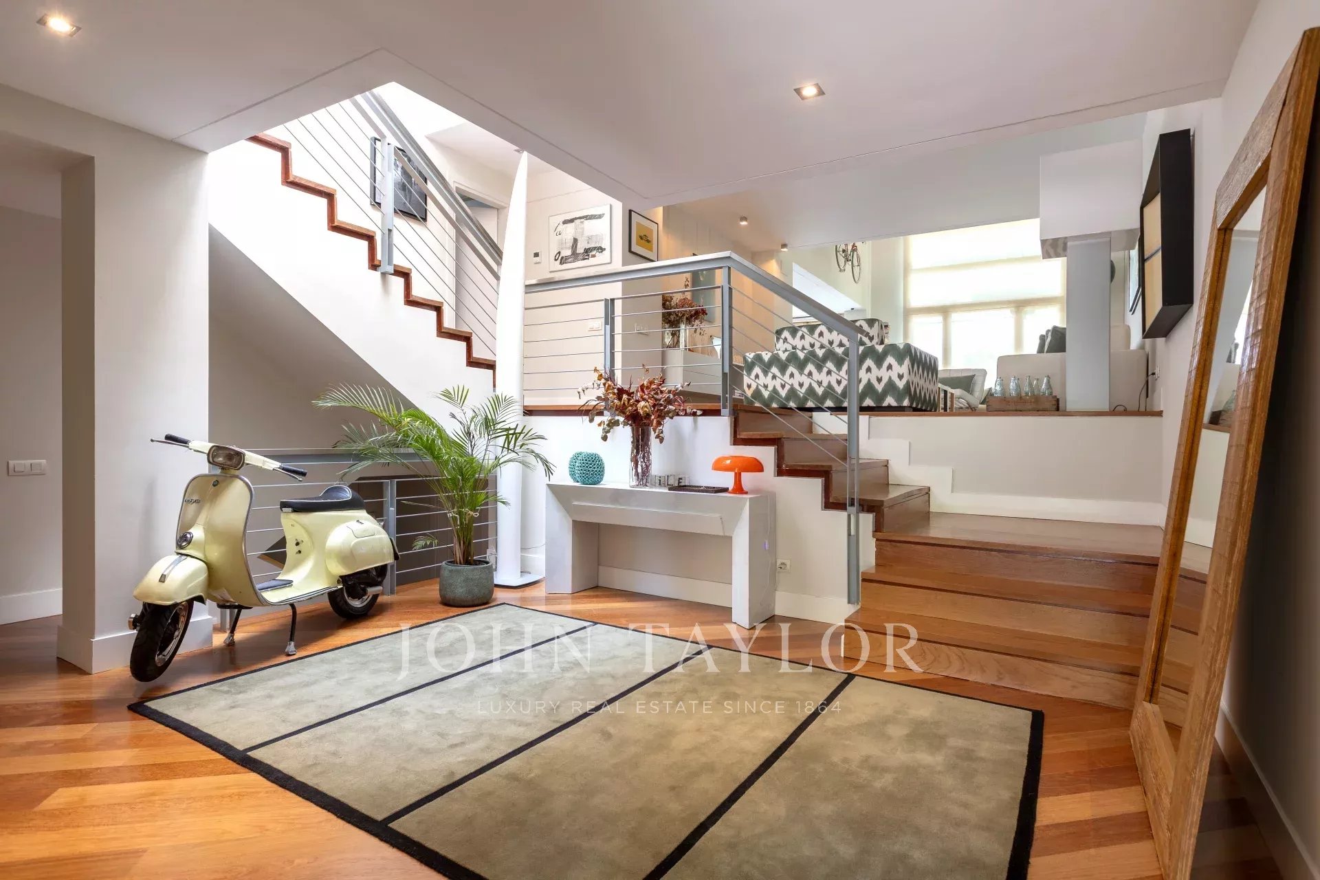 En entrant dans la maison, on trouve un hall spacieux qui donne accès à un grand salon et à un bureau. En continuant à l'étage, on trouve un deuxième salon-salle à manger lumineux avec vue sur la piscine et le jardin privé, ainsi qu'une grande cuisine. À l'étage suivant, on trouve trois chambres lumineuses et deux salles de bains. Plus haut encore, la chambre principale dispose d'une salle de bains attenante, d'un dressing et d'un balcon.