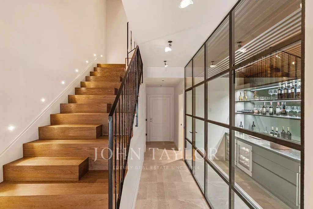 Le rez-de-chaussée présente un hall d'entrée accueillant, une cheminée représentative, de hauts plafonds en bois et des escaliers uniques. On y trouve également un magnifique bar à vin, une buanderie et un garage avec beaucoup d'espace pour les voitures et les vélos.