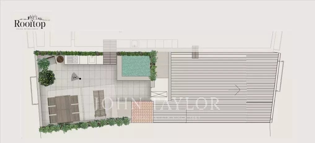 Terrasse sur le toit : Joyau de la propriété, le toit-terrasse offre un espace idyllique pour se détendre et se divertir. Vous y trouverez une piscine privée, une cuisine d'été, une douche extérieure et des espaces dédiés aux repas, à la détente et à la relaxation, le tout avec une vue à couper le souffle sur la ligne d'horizon historique de Palma.
